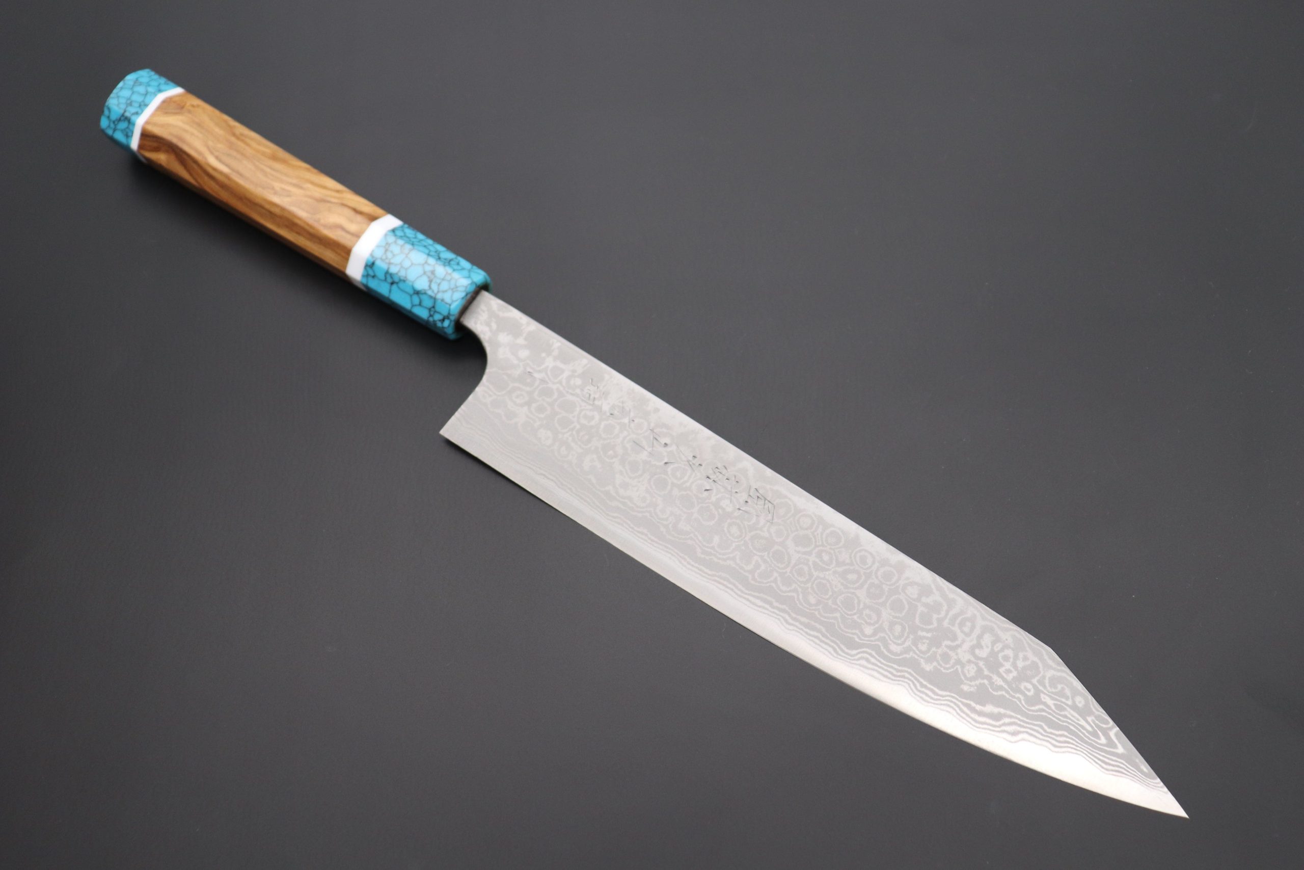 To enrich your cooking experience and suit a wide variety of needs and preferences, this Fu-Rin-Ka-Zan Aogami Super Custom Damascus Kiritsuke Gyuto features an Innovative Octagonal Olivewood Handle with a Turquoise Composite Stone Ferrule & Butt with White Spacers.