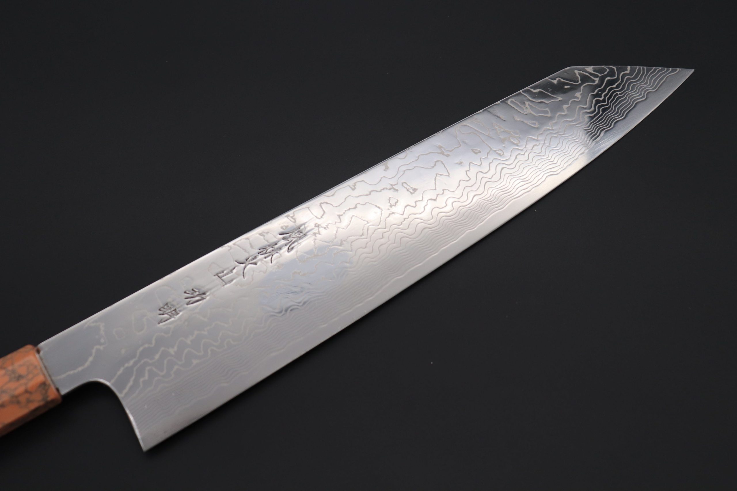 This beautiful Damascus Kiritsuke is forged and hand crafted by passionate forge smith Sukenari using R-2 steel. R-2 (Also known as SG-II ) is a high-quality Powdered Metallurgy (P.M.) High Speed Tool Steel from Kobelco. R-2 has a very rich chemical composition, which includes Carbon 1.25-1.45 %, Chromium 14- 16%, Molybdenum 2.3- 3.3 %, and Vanadium 1.8- 2.2 %.