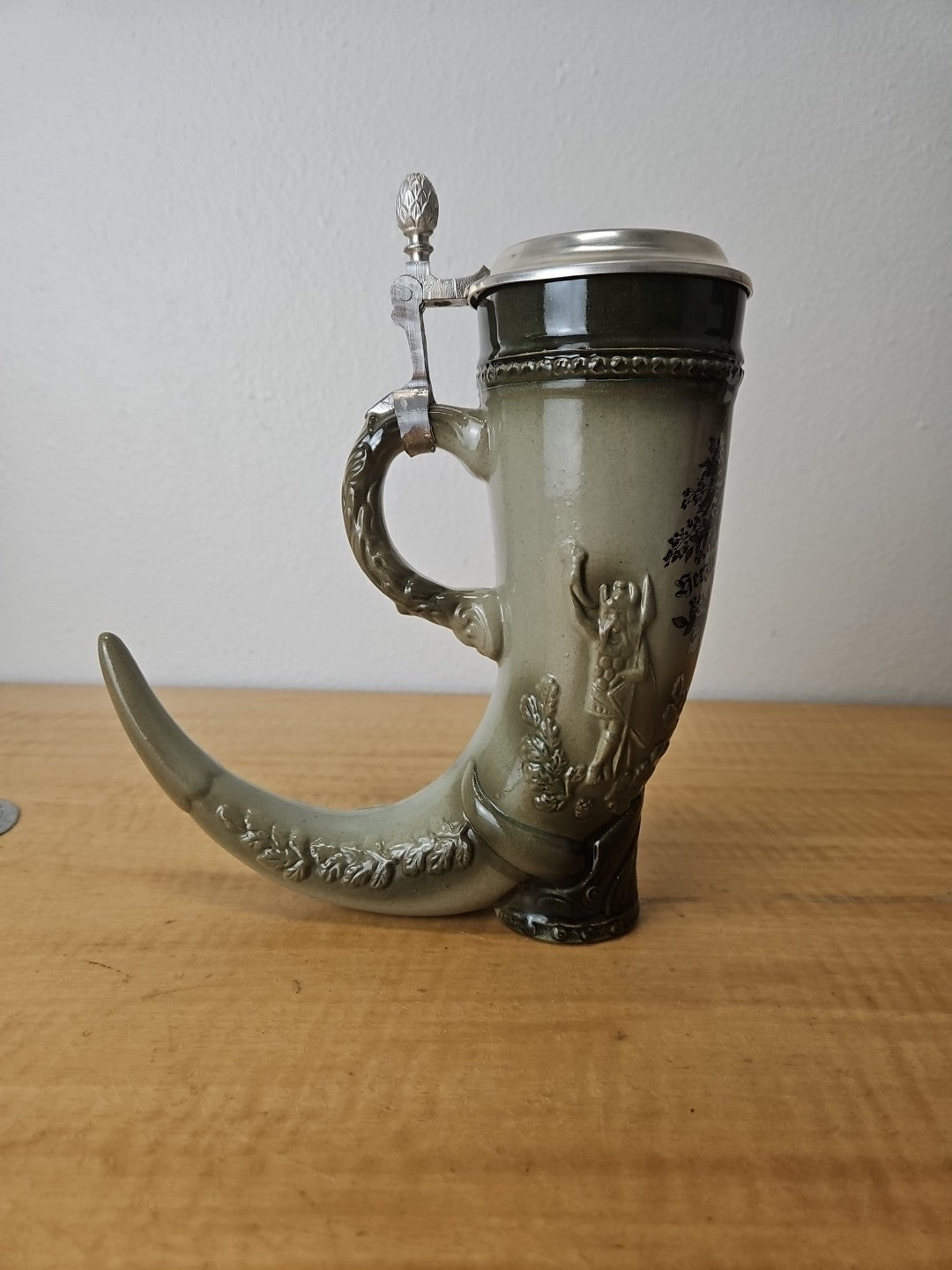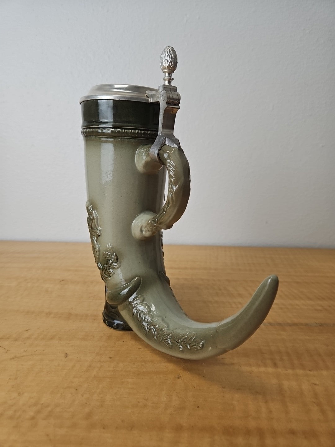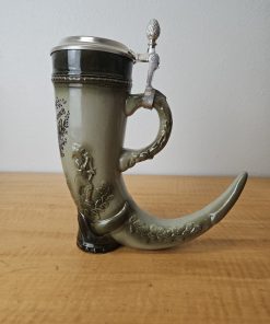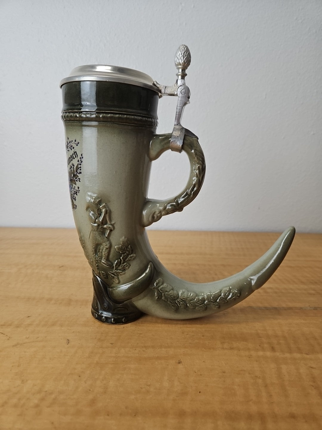 German Horn Beer Stein with handle and lid MHH 95% Zinn by Handarbeit