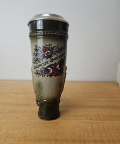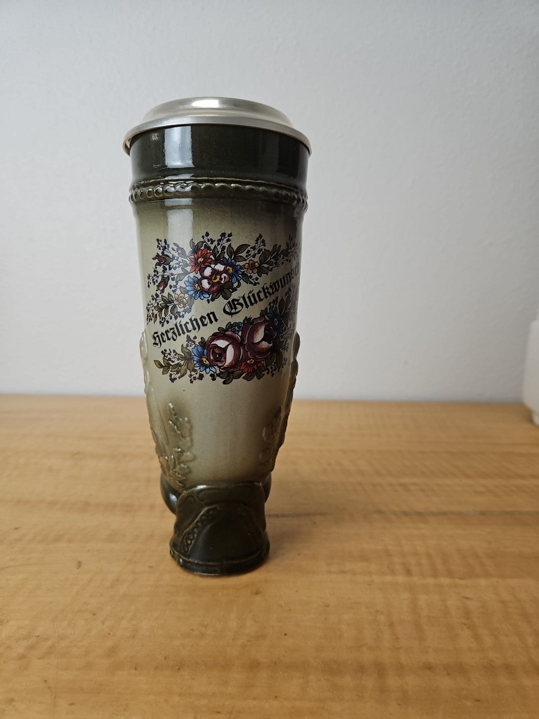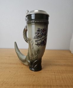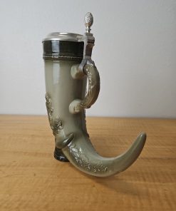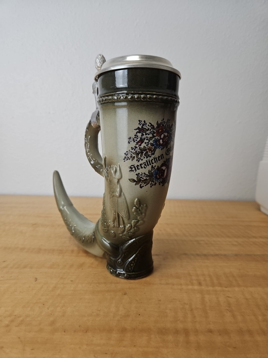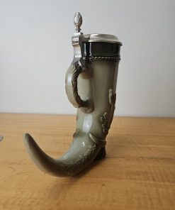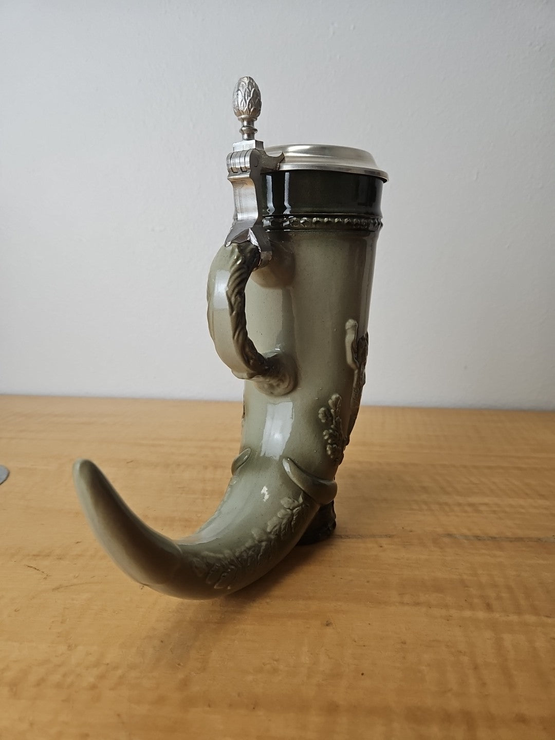 German Horn Beer Stein with handle and lid MHH 95% Zinn by Handarbeit