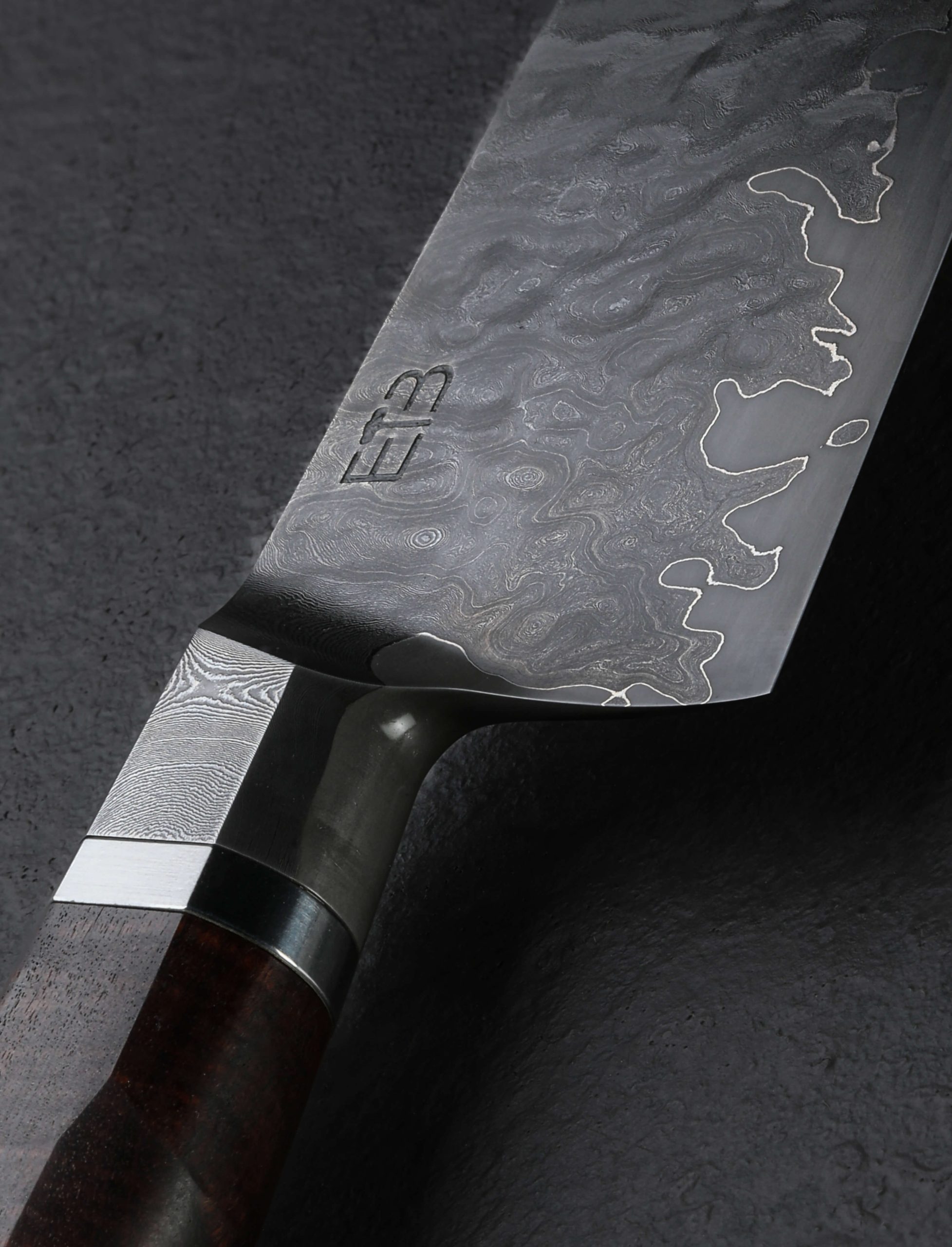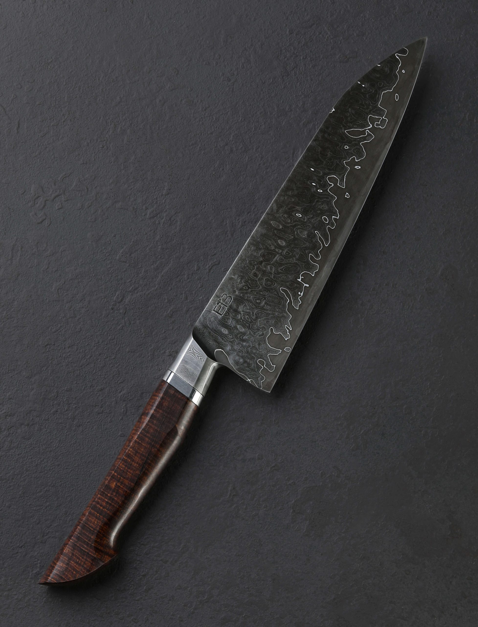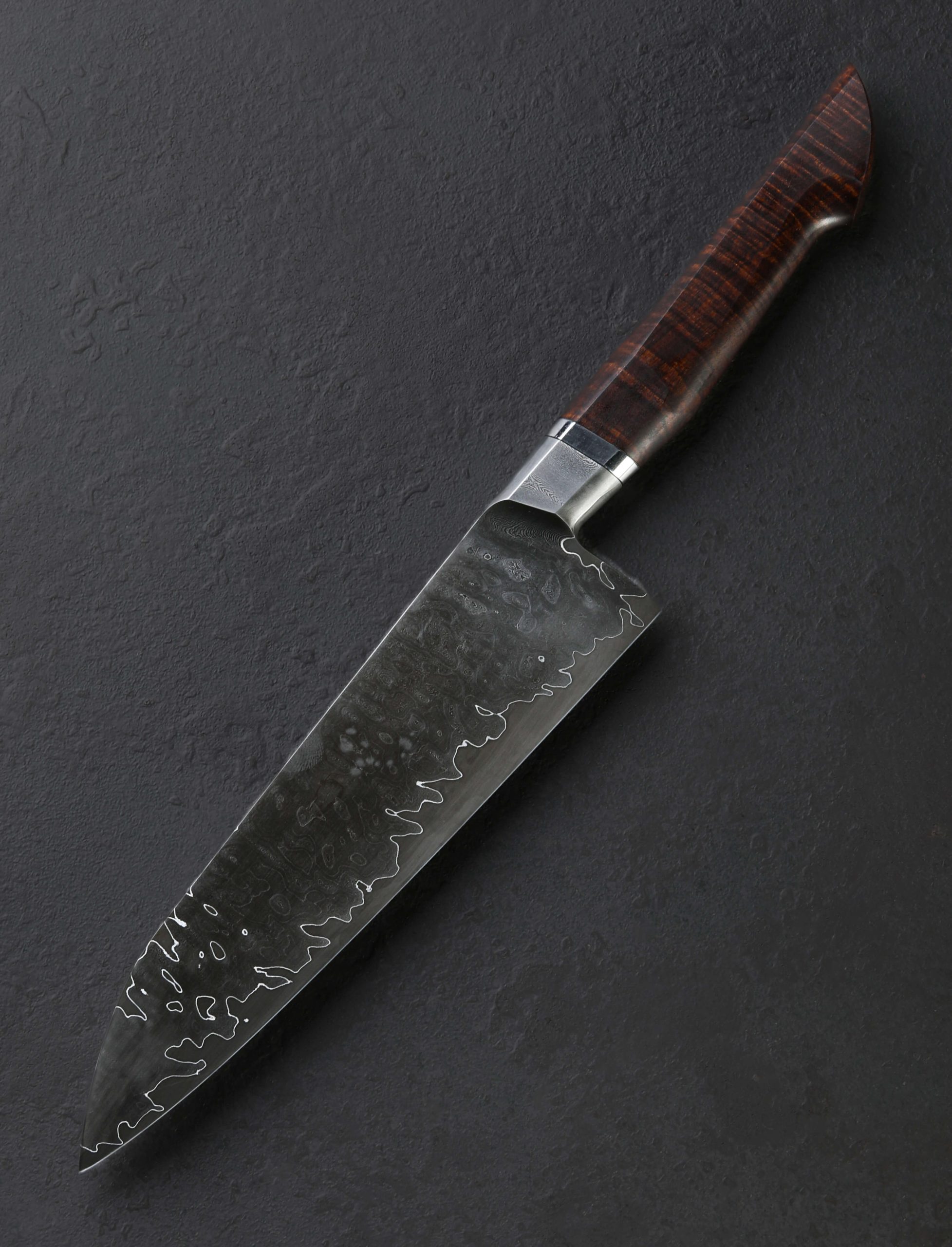 With its dense layering of carbon alloys that produce a stunning chatoyance under the lights of the kitchen, random-pattern damascus clads a core of high-performance ApexUltra tungsten-carbon steel to form the 205mm / 8.1″ blade of this Jason Ellard creation. Forged by hand at his studio in Tasmania, Jason has crafted a versatile and hardworking tool for the discerning chef, shaped to perform every cut from the most demanding to the most delicate. Convex, symmetrical bevels deliver ample toughness and material in the rear nearest the 52mm-tall heel for chopping and tough ingredients, the geometry slimming progressively forward before reaching an extremely fine, needle-like tip perfect for precision slicing and detail work. The blade’s rounded spine tapers from the integral forged bolster forward yet retains its rigidity throughout its length. At 8.4oz / 238g overall and balancing a hair in front of the rounded blade choil, this chef knife is weighted, steady, and powerful in the hand, all in a size and profile that will be at home in any size kitchen and in the hand of every cook. For comfort and control, the beautiful, sculpted damascus bolster is complemented by polished stainless steel and a striking piece of Australian Ringed Gidgee to form the handsome, Western style, hidden-tang handle.