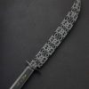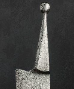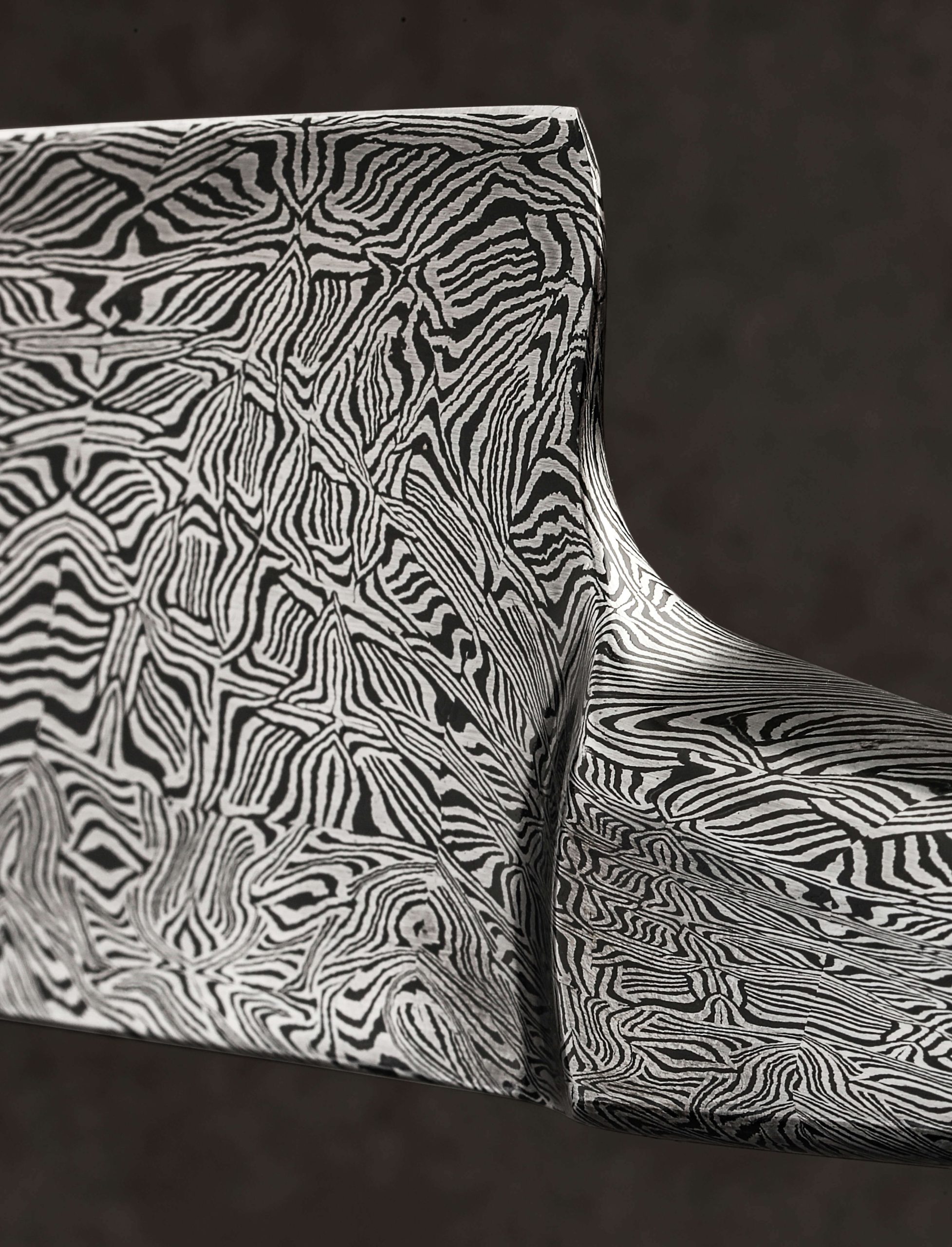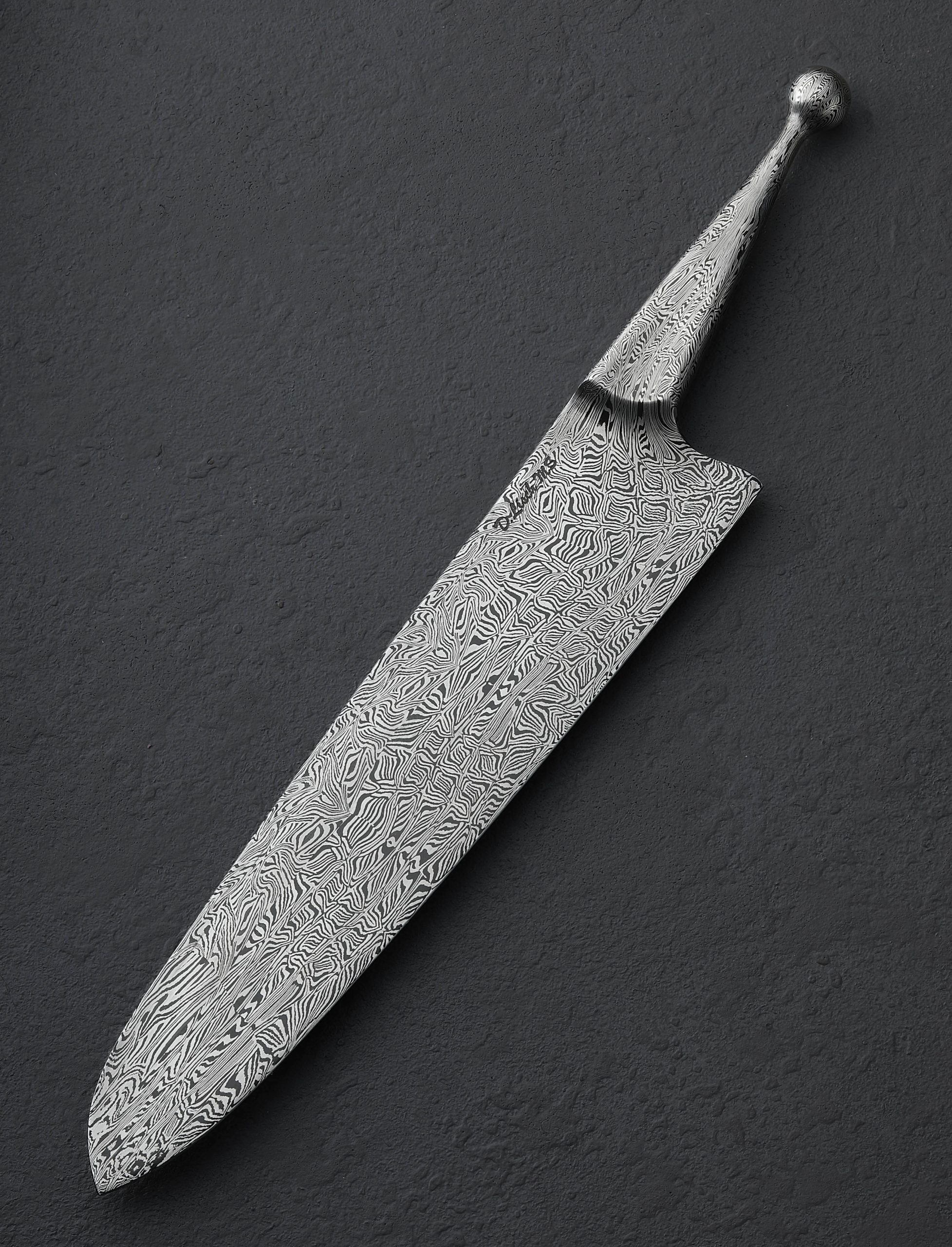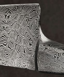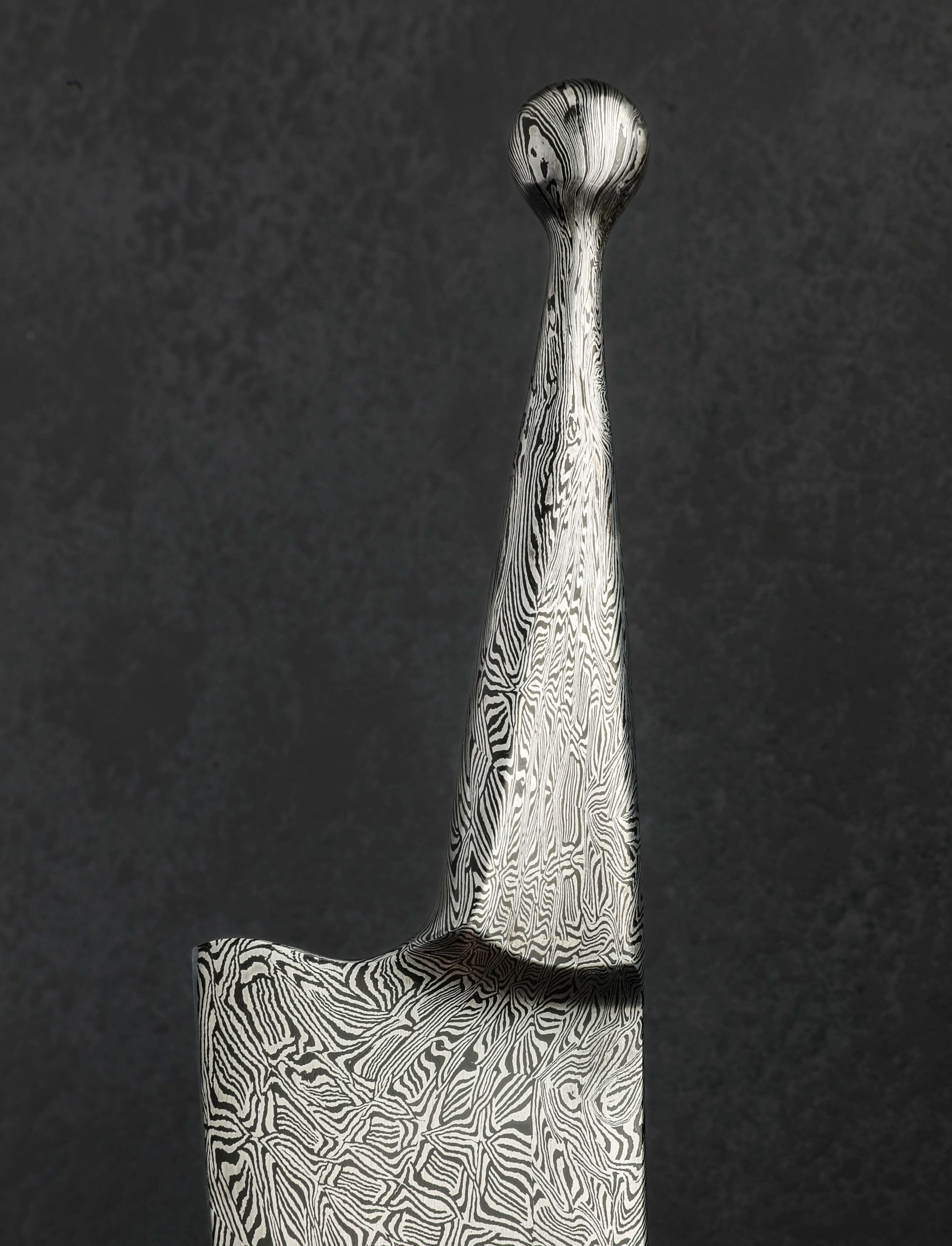 Master Bladesmith and designer David Lisch of Washington State pays homage to the living fossil that is the Ginkgo tree, one which nature has left unchanged for over 200 million years. Inspiring awe for millennia due to its beauty and longevity, the qualities of the ginkgo biloba tree, also known as the maidenhair tree, are enshrined in steel by David in this sculptural kitchen masterpiece for millennia more, presenting to its owner a culinary experience like no other. Continuing his recent exploration of the ‘Ball Handle’ knife style in which a meticulously crafted handle designed for use in the pinch grip counteracts the heft of the full-size damascus steel blade, David is able to produce an extraordinary, nimble, and balanced feel in the hand. Make no mistake, the one-piece, solid-steel construction in nothing less than David’s striking mosaic carbon damascus is built to use daily in the kitchen for everything from repetitive chopping tasks to delicate slices. Tall, slightly convex bevels slim to a hard, razor-sharp edge that provides both strength and precision, positioning this tool as a workhorse for any kitchen. While a subtle amount of lateral flexibility is present thanks to David’s superb heat treatment and hardening process, the blade’s overall feeling is one of toughness and reliability, with its strong, mid-high tip and deep belly. It is, however, when the knife is not in use that David’s one-of-a-kind piece of art is enjoyed to its fullest. Cradled gracefully by one of four ginkgo leaves in the incredible display stand made just for this knife, the handle’s ball rests gently between the leaf’s opposing lobes allowing the blade’s tip to remain suspended as if an organic offshoot of this storied, metallic tree. The tree stand itself is forged, like the knife, by David’s hands from solid iron, crafting each leaf one-by-one before hot-brushing them each with bronze, bringing the object to life in a way that cannot be ignored.