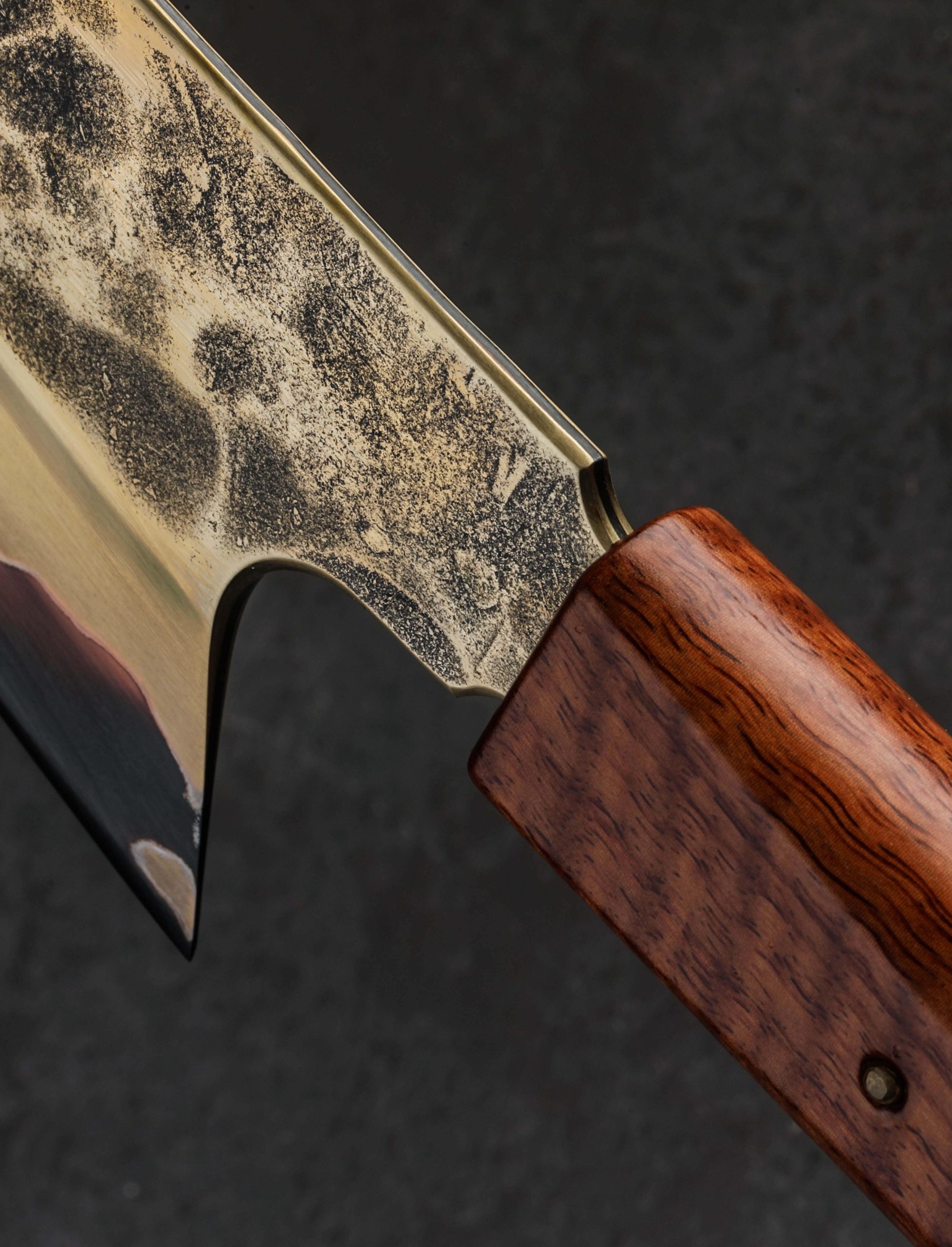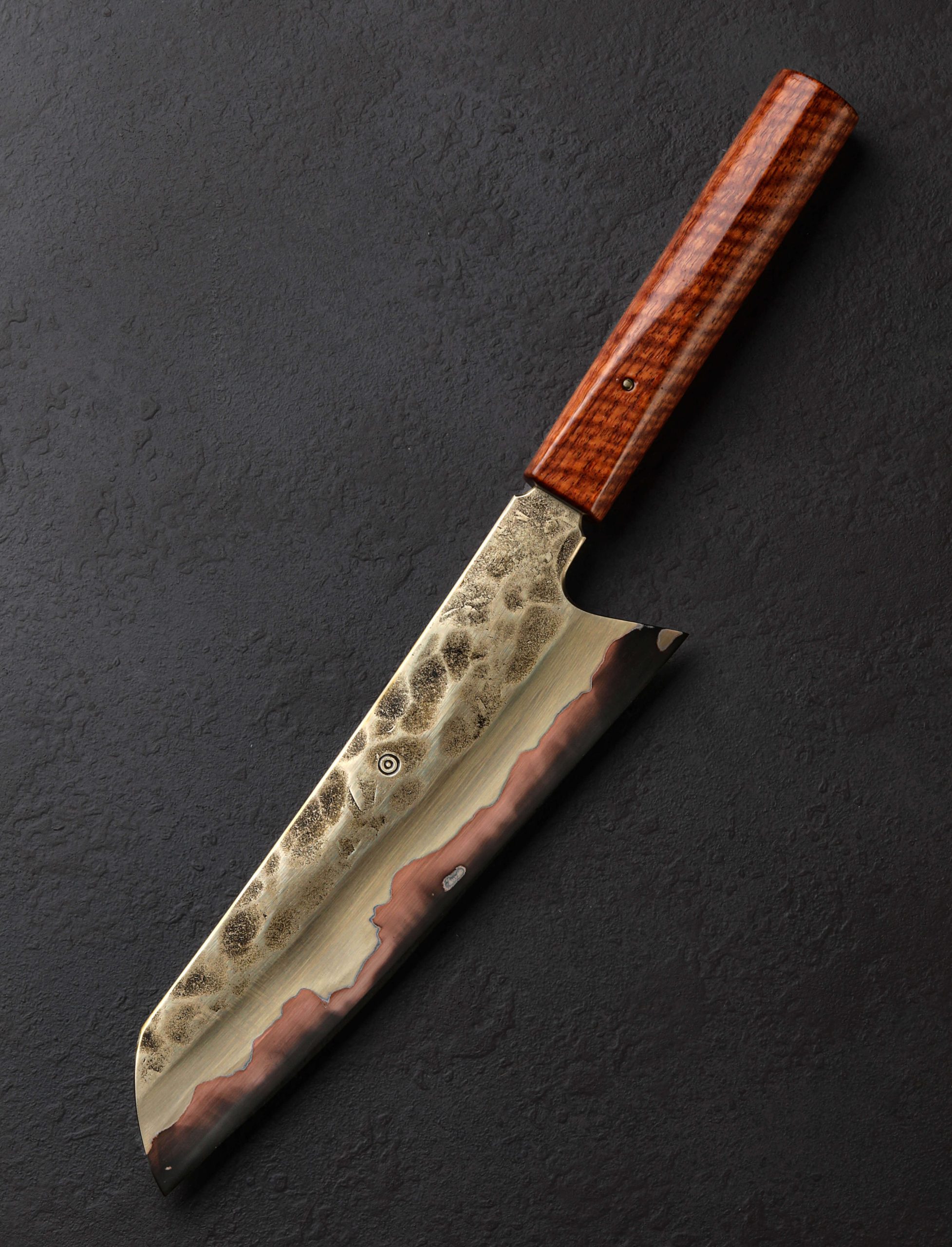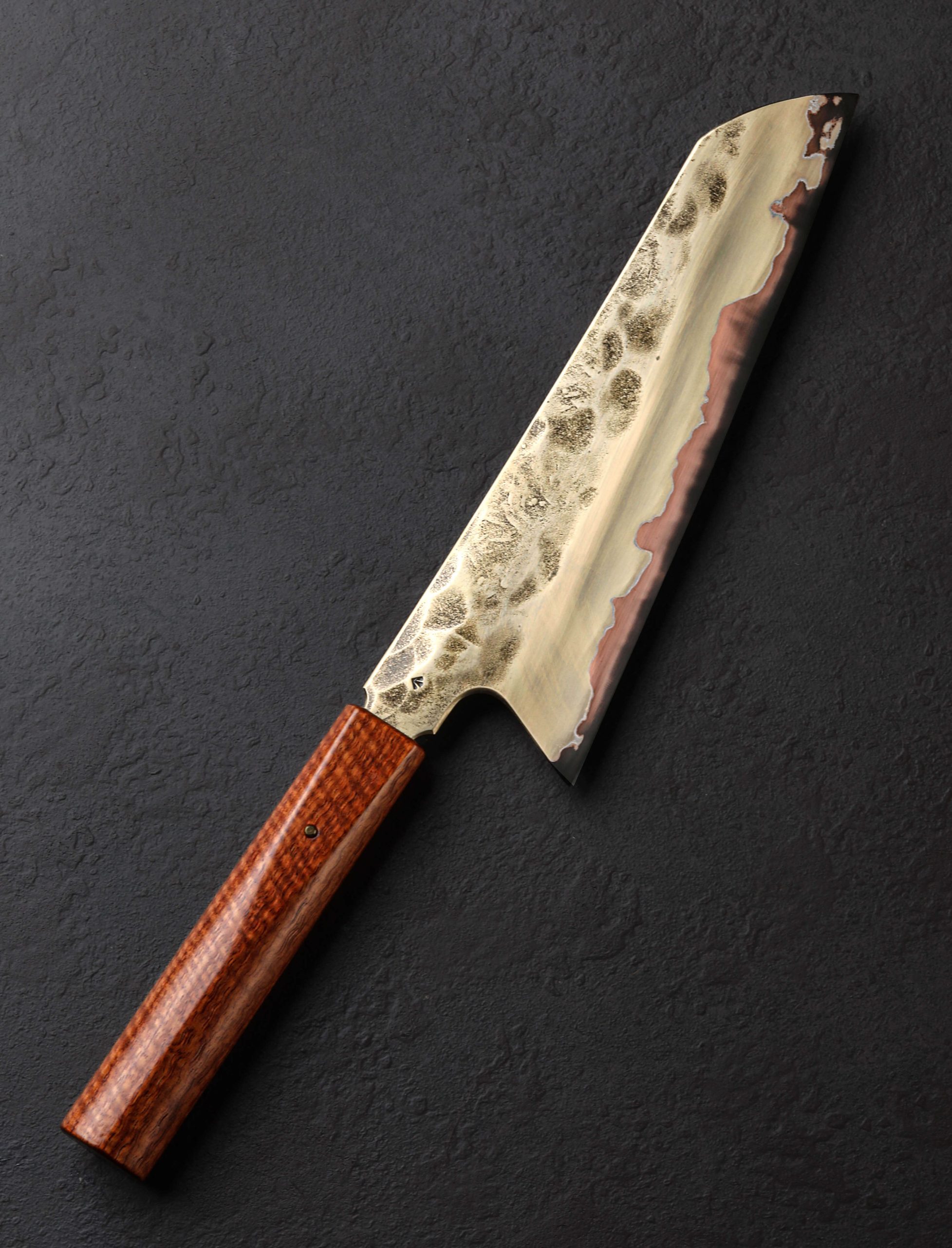 Sydney-based artist and bladesmith James Oatley extends himself in every build, pushing the limits of culinary performance with each blade, and sometimes, a stand-out object of the even the rarest and most distinctive qualities is crafted, with this Golden Fury Gyuto falling into that special category. Forged by hand at his one-man studio, the 216mm / 8.5″ long, 63mm tall blade in his signature profile is shaped from a five layer formula that sees pure nickel and brass clad atop a core of tungsten-carbon steel. Hardened to 65 HRC at the thin, razor-sharp cutting edge, the core steel receives a warm, dark forced oxidation that lends fury, surface protection, and a head-turning finish. Above, hand-sanded satin bevels are complemented by forge-finished flats that bare the marks of the tool’s hand-hammered origins. For uncompromising efficacy on the cutting board, the primary bevels are meticulously honed with James’s compound ‘S-grind’ geometry that delivers a concave stretch that runs the full length of the blade and reaches down nearly to the edge itself, with only the final amount of material, around half a centimeter, becoming markedly convex as it tapers to a hard, near-zero (lacking a secondary bevel) edge. The result is an extremely thin and precise yet rigid edge designed for the most delicate and demanding slicing work, like sashimi preparation, while at the same time the blade enjoys the height and geometry needed for chopping tasks of all variety. Balancing a finger’s-width in front of the blade’s heel with nicely rounded and polished spine and choil, this chef’s knife is exceptionally comfortable and natural in the hand. For control in any grip and for any style cut, the blade’s brass-clad tang is hidden inside a handle of beautiful curly mango wood, shaped in James’ handsome, symmetrical wa form, and secured with a single domed brass pin which allows for the handle’s removal in the case that care and maintenance are needed. A handmade saya of quilted maple is included.