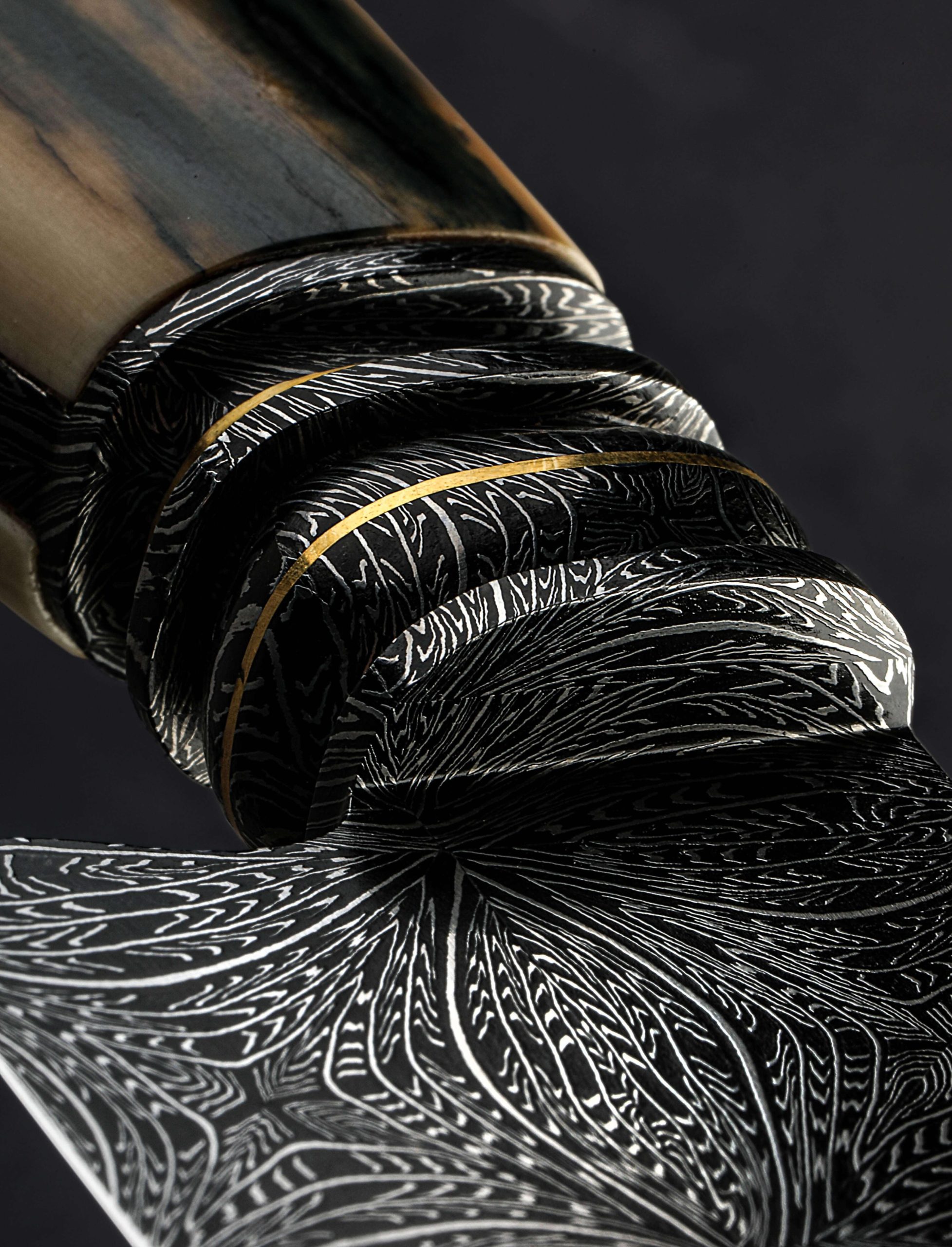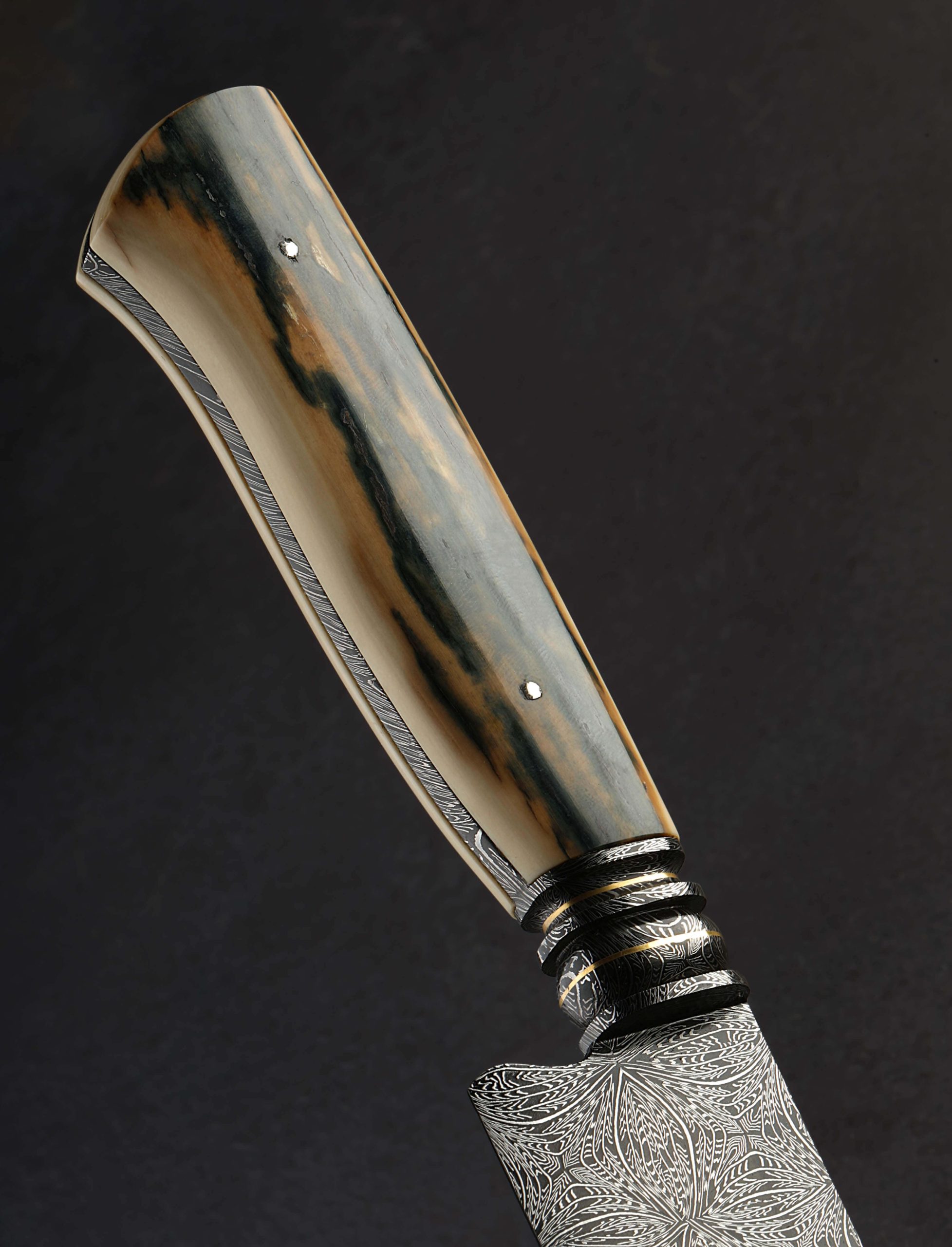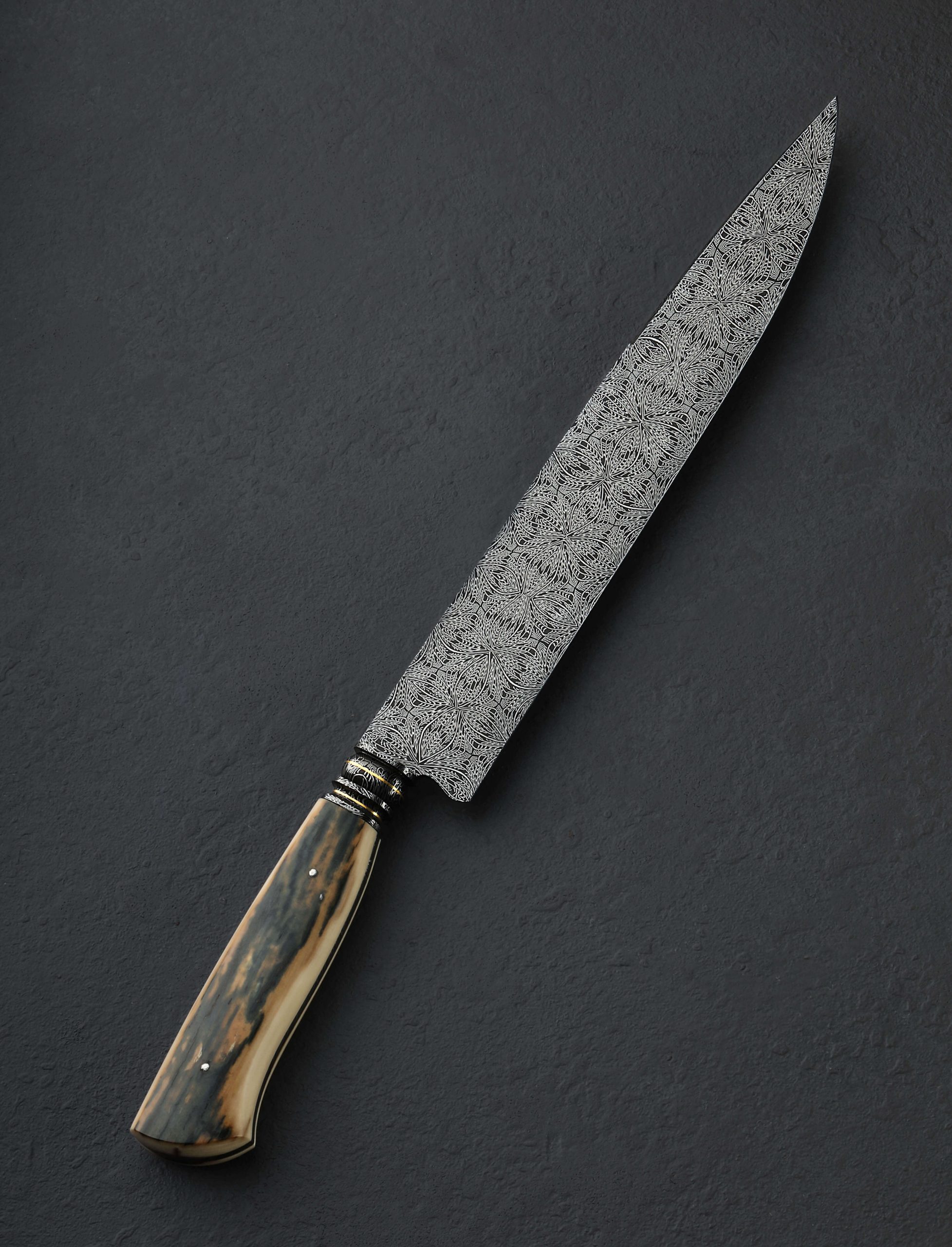 Traditional Brazilian design and craft at its finest. Forged by hand at his studio in Brazil’s south, artist William Porto forges from a single piece of homemade Four Leaf Clover mosaic damascus steel the 244mm blade, decorative, 24k gold-inlaid bolster, and full handle tang of this extraordinary chef’s gaucho. Inspired by the blade style carried in the belts of South American explorers of centuries past, the profile is perfectly suited to slicing, carving, and serving proteins, as well as any number of cuts around both kitchen and dining room. To display and present to the occasion’s most distinguished guests, no detail in the creation of this one-of-a-kind, contemporary gaucho rendition is overlooked. Superb weight, balance, and geometry produce a tool, first and foremost, of unwavering caliber, the damascus pattern’s intricate and stunning details on display from the elegantly shaped blade choil, along the thick, tough blade spine, and throughout the convex primary bevels from bolster to fine, needle-like tip, and downward to a thin, razor-sharp edge. Where form follows function, tactile, culinary art is the reward: wrap the fingers around a handle styled as remarkably as William’s mastery of damascus design, a grip sculpted from two matched and opposing pieces of fossilized mammoth tooth, secured to the blade’s tang with two hand-peened, 999 fine silver pins, and capped with the elegantly detailed, fluted damascus bolster. A handcrafted leather saya is included. Heirloom craftsmanship, fit-and-finish, and aesthetics result in an object to pass down through the generations.