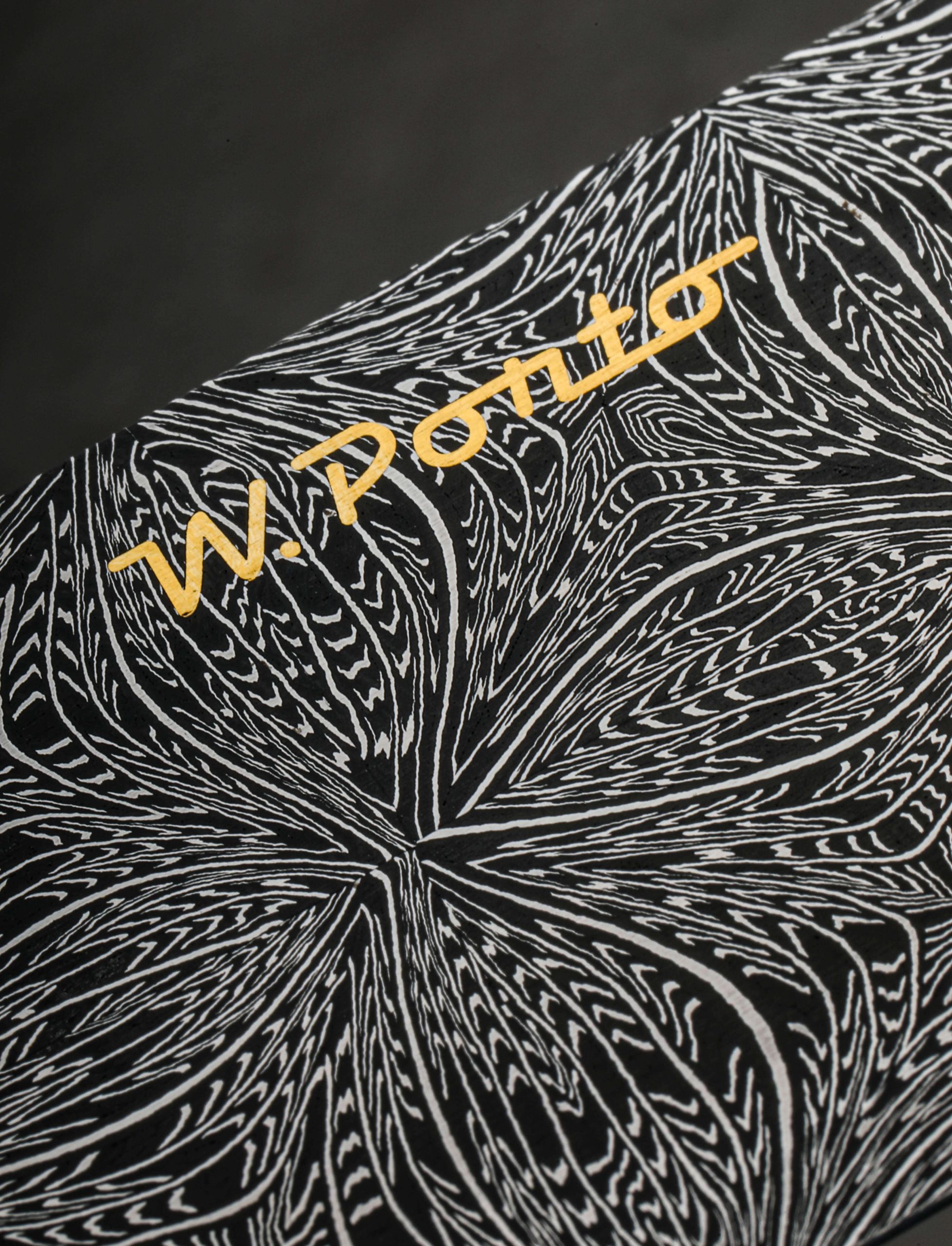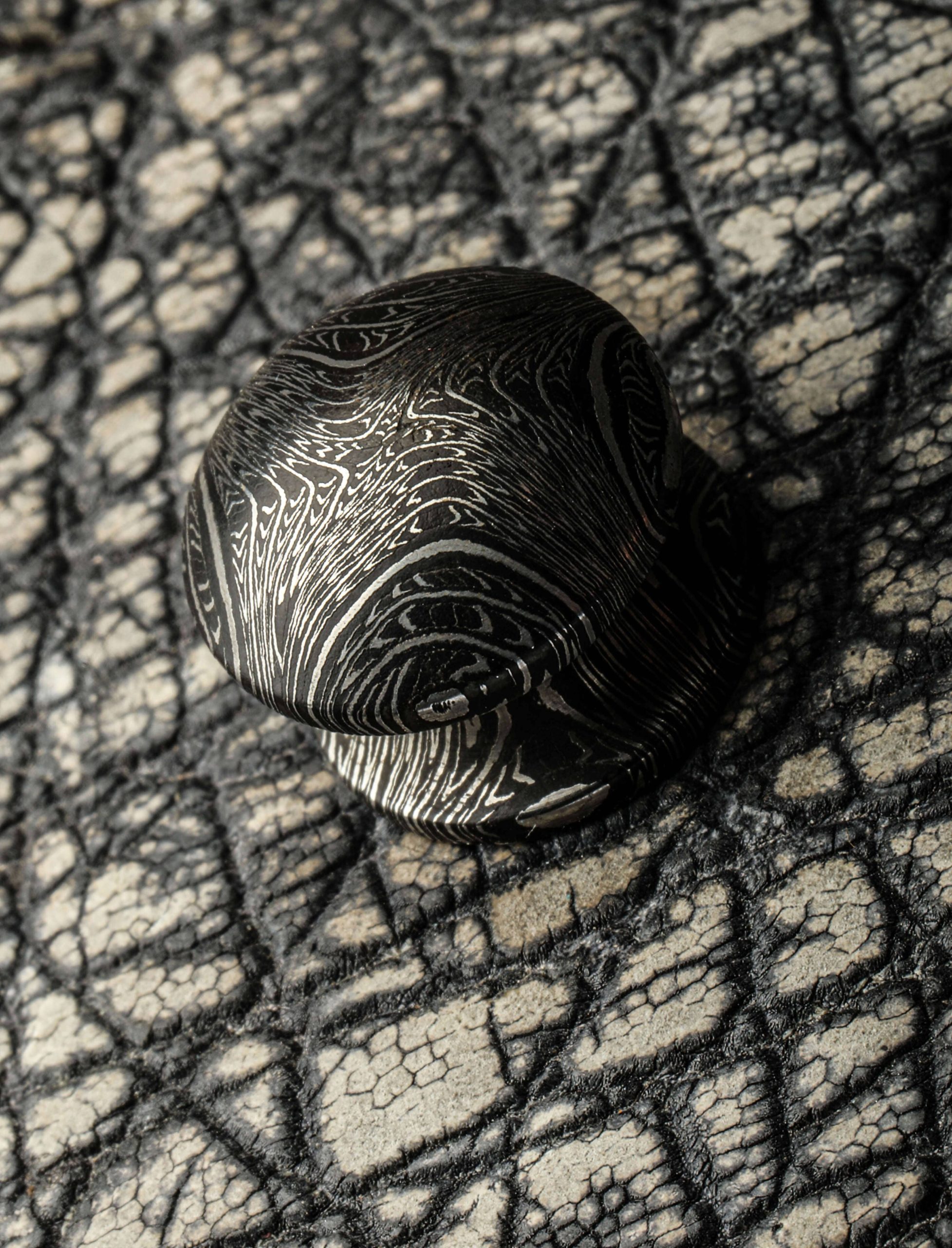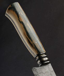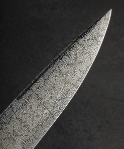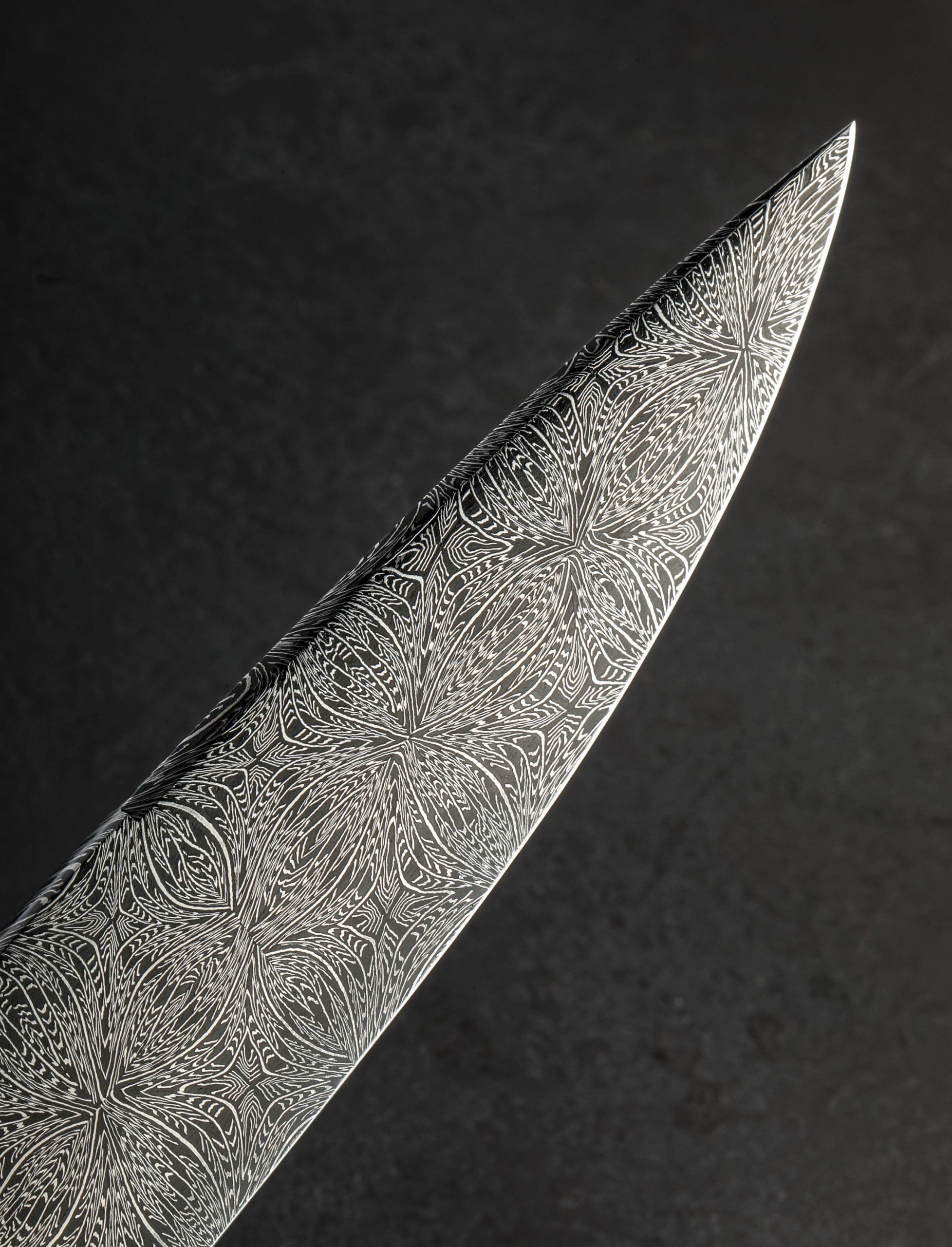 Traditional Brazilian design and craft at its finest. Forged by hand at his studio in Brazil’s south, artist William Porto forges from a single piece of homemade Four Leaf Clover mosaic damascus steel the 244mm blade, decorative, 24k gold-inlaid bolster, and full handle tang of this extraordinary chef’s gaucho. Inspired by the blade style carried in the belts of South American explorers of centuries past, the profile is perfectly suited to slicing, carving, and serving proteins, as well as any number of cuts around both kitchen and dining room. To display and present to the occasion’s most distinguished guests, no detail in the creation of this one-of-a-kind, contemporary gaucho rendition is overlooked. Superb weight, balance, and geometry produce a tool, first and foremost, of unwavering caliber, the damascus pattern’s intricate and stunning details on display from the elegantly shaped blade choil, along the thick, tough blade spine, and throughout the convex primary bevels from bolster to fine, needle-like tip, and downward to a thin, razor-sharp edge. Where form follows function, tactile, culinary art is the reward: wrap the fingers around a handle styled as remarkably as William’s mastery of damascus design, a grip sculpted from two matched and opposing pieces of fossilized mammoth tooth, secured to the blade’s tang with two hand-peened, 999 fine silver pins, and capped with the elegantly detailed, fluted damascus bolster. A handcrafted leather saya is included. Heirloom craftsmanship, fit-and-finish, and aesthetics result in an object to pass down through the generations.