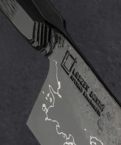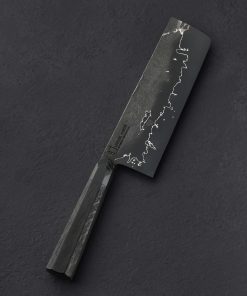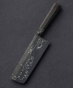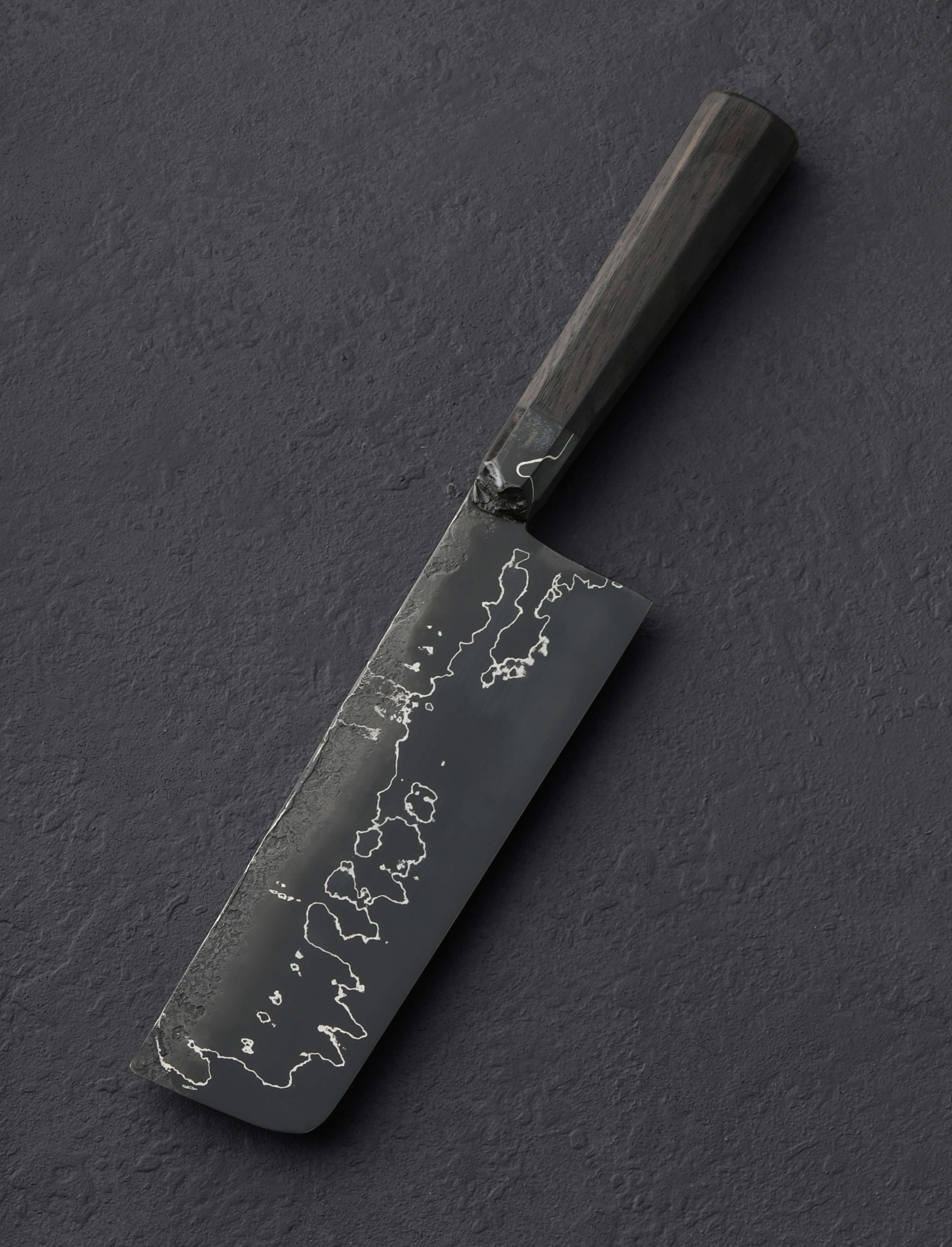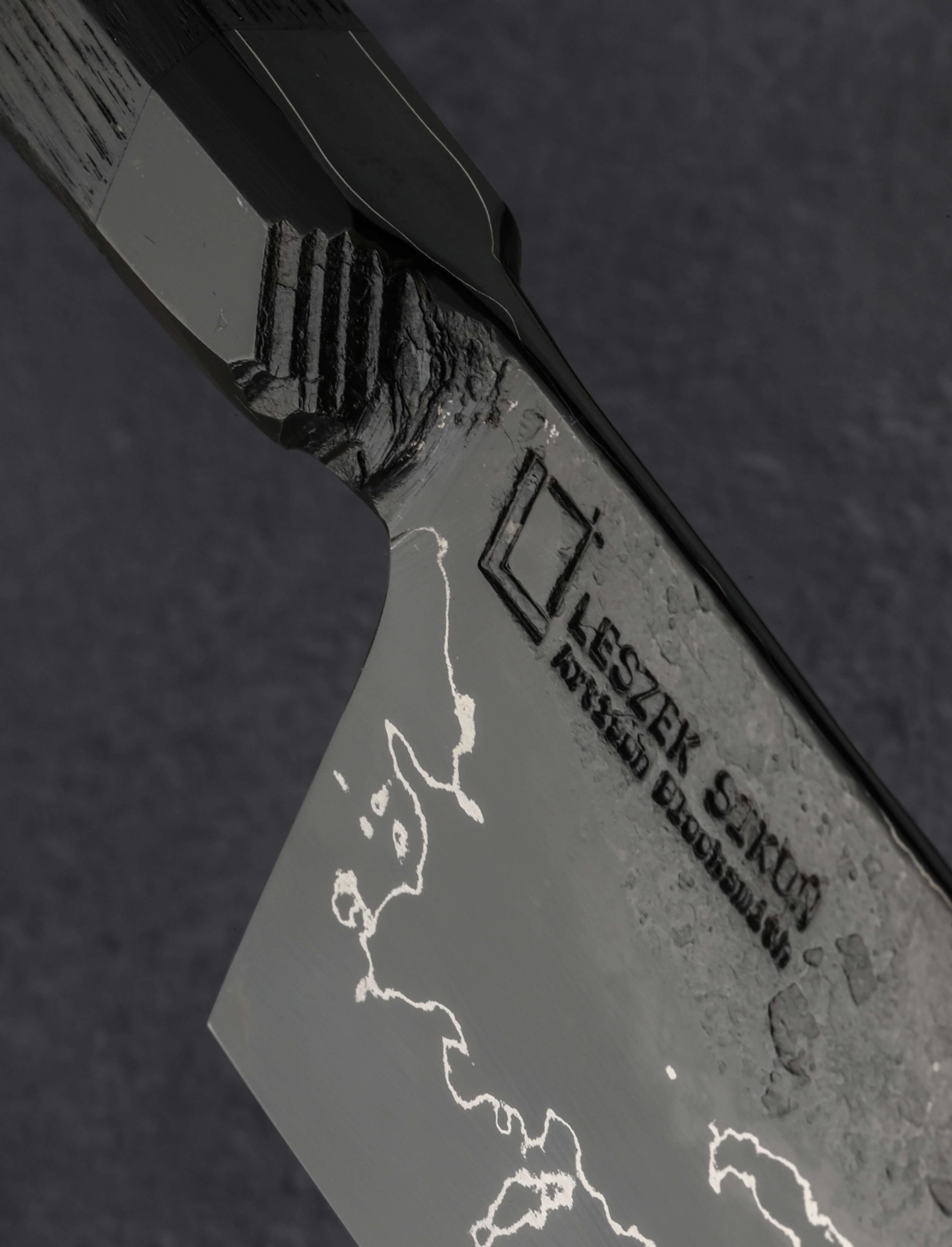 Thin, dark, and made for countless hours of vegetable chopping joy, this nakiri chef’s knife was forged by hand in Suffolk, UK by bladesmith Leszek Sikon. With brute de forge integral bolster construction, the knife is weighted and forward balanced to allow its mass and slim edge to move effortless through ingredients. An overall weight of 8.7oz / 246g makes it a tough workhorse capable of hours of prep in kitchens large or small. Leszek’s style, informed by years of artist blacksmithing, bladesmithing, and metal-forging of a wide variety, combines a rustic, natural, and understated feel with excellent geometry and a house-made blade material that stands out for its bright, meandering line of pure nickel surrounded by a sea of dark black carbon steel. For grip, a simple and traditional handle of ancient bog oak tapers forward until it meets the bolster for comfort and control.