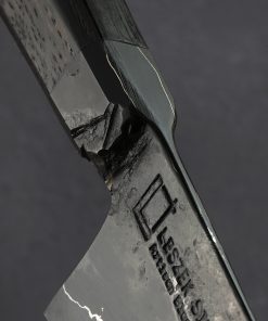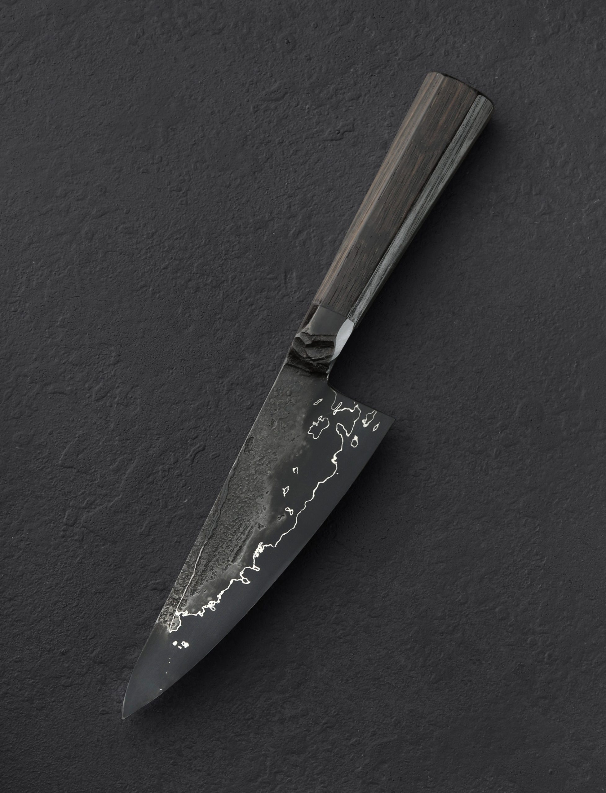 Solid and sturdy in the hand, balanced at the front of the handle’s integral bolster, with a versatile and beautiful blade that sweeps upward from a tall, strong heel to a very thin, needle-like tip, this petty chef knife packs a big punch. Forged in Suffolk, UK by bladesmith Leszek Sikon, this elegant piece of culinary art features a 140mm / 5.5″ edge in dark, hard, and very clean (ie. few additives) “Spicy White” 26c3 steel with cladding of pure nickel and 01 tool steel. Whether performing detail work and precision slices with the tip, or chopping dense and hard ingredients with ease, both the excellent geometry and blade profile make this a versatile tool you’ll find yourself reaching for frequently. A tapered handle of bog oak in traditional, tall octagonal form, meets the bolster to form a comfortable and hand-filling handle.