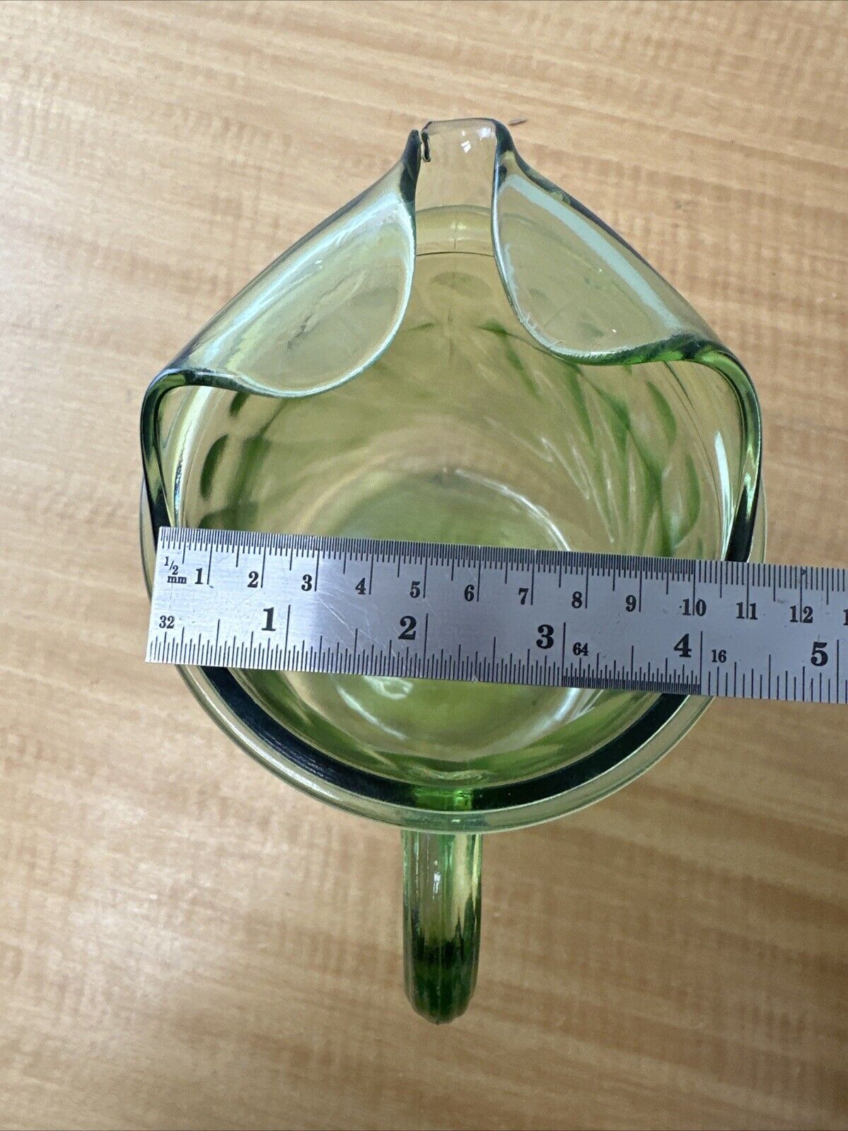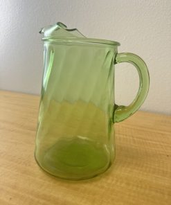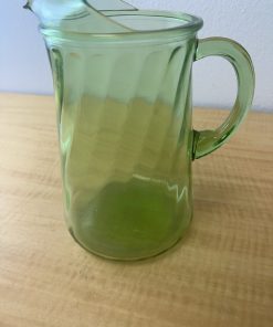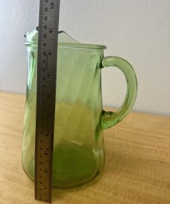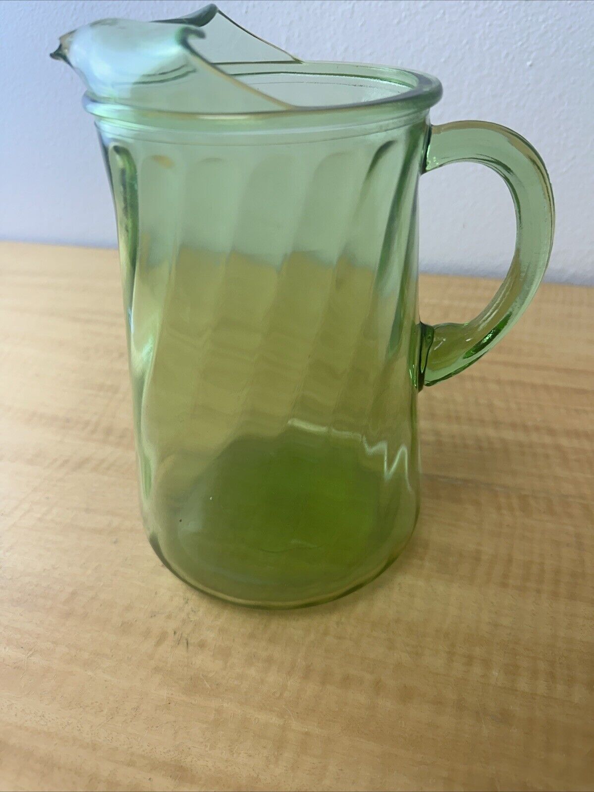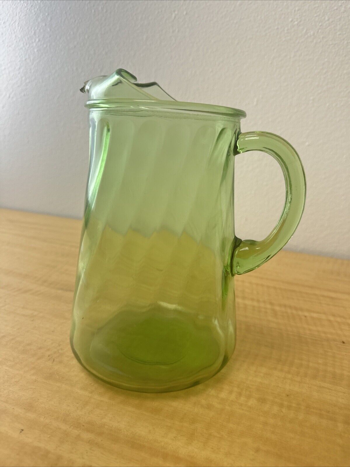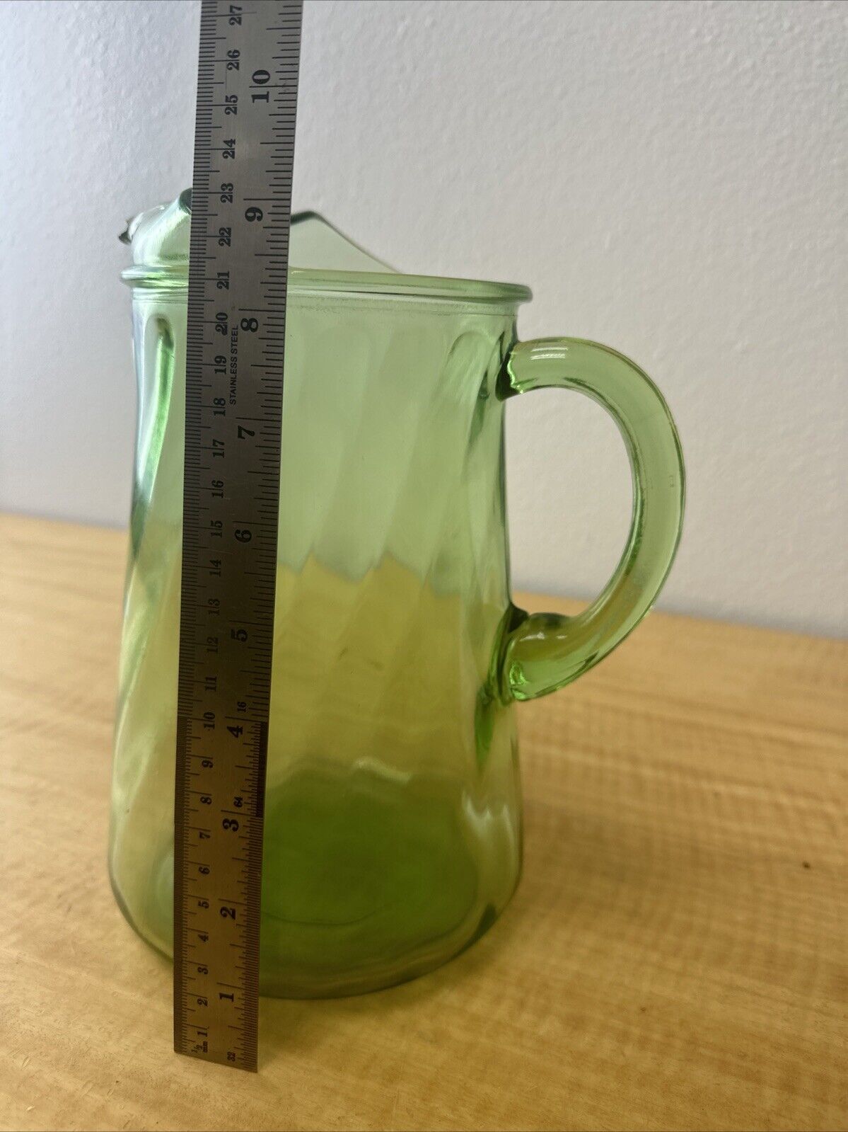 Green Glass Pitcher Swirl Design With Ice Lip 80 oz 8 1/2″ Tall – Vintage