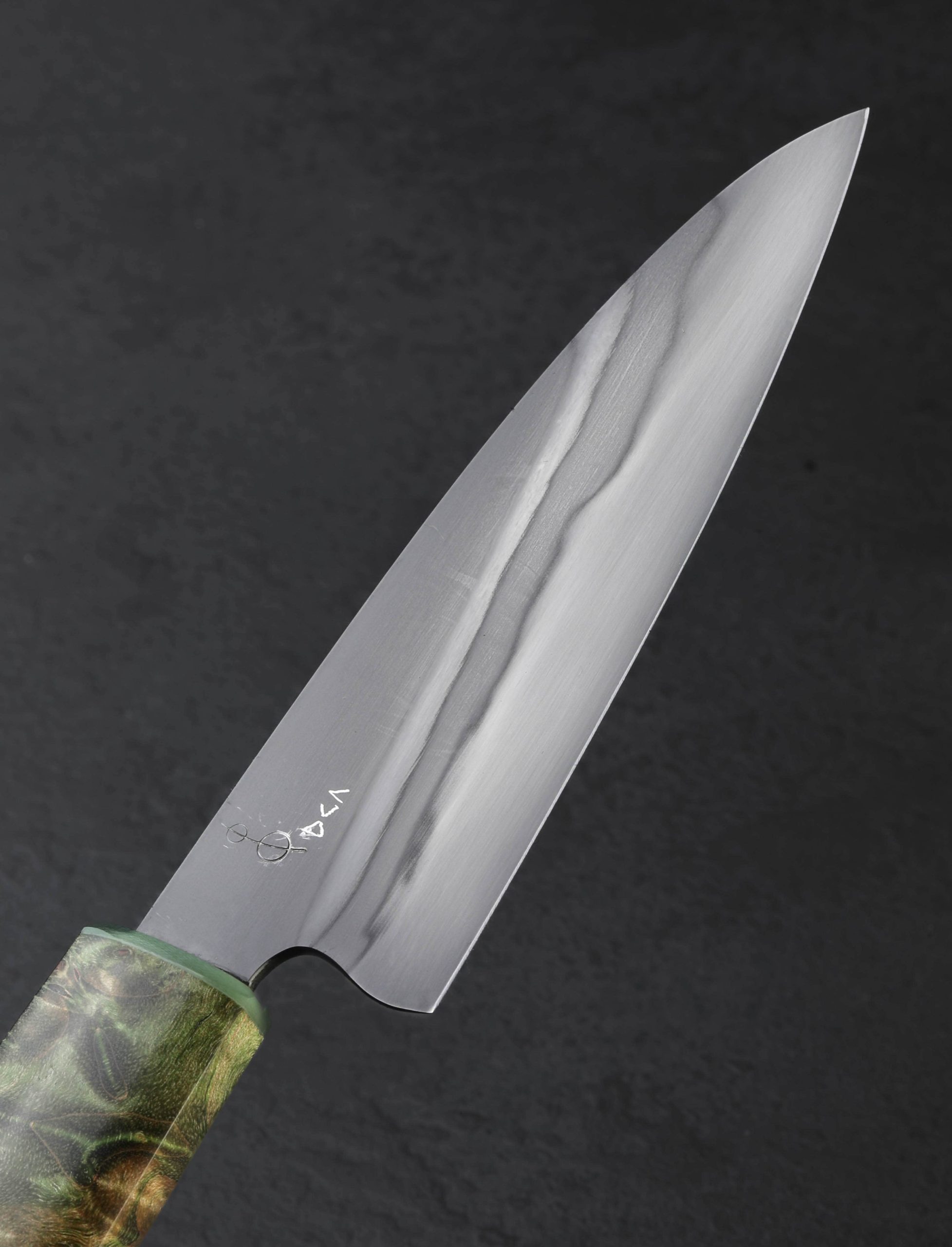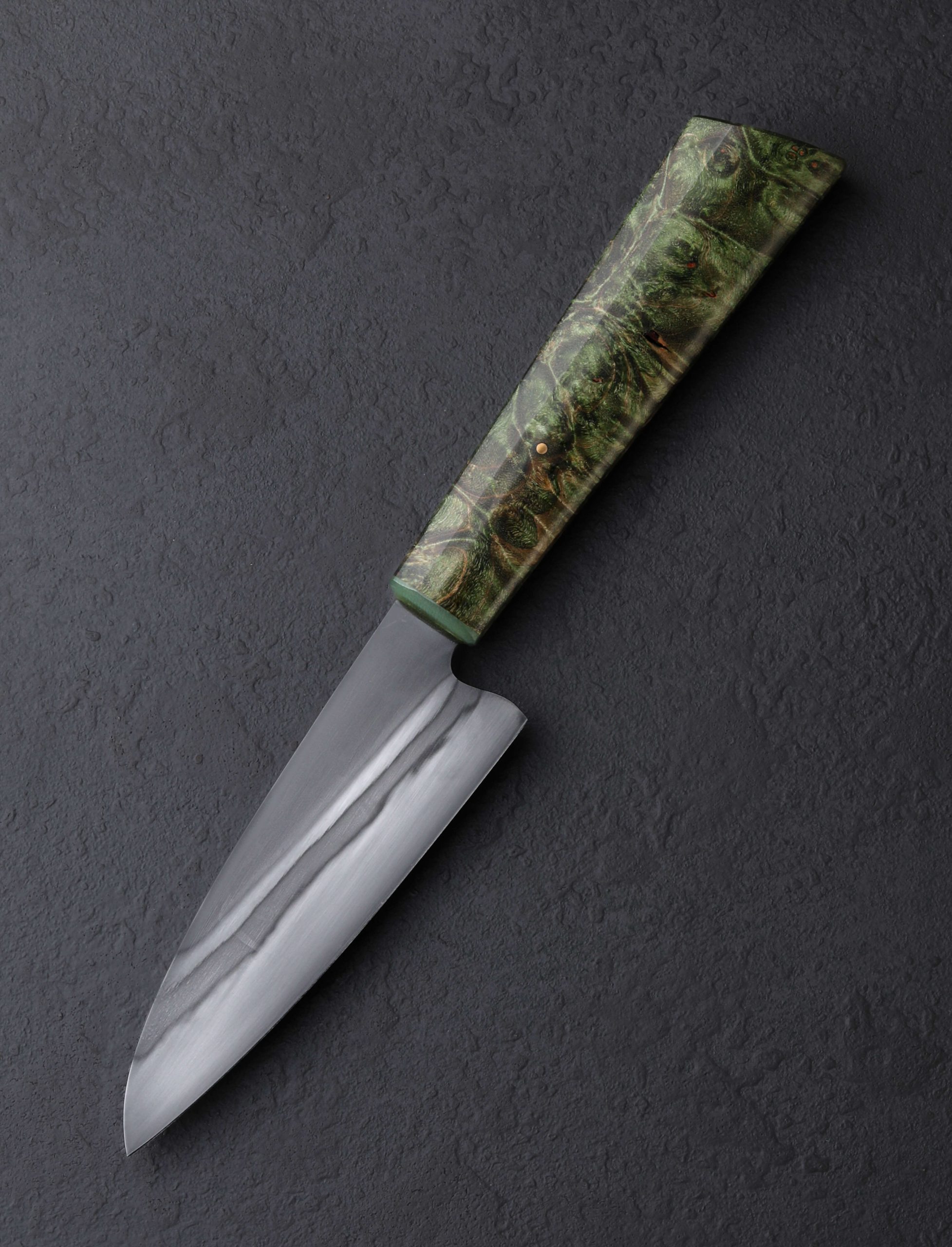 Combining attributes of a petty chef blade profile, paring knife, and yes, a santoku, Don Carlos Andrade has, as he’s done many times before, shaped a novel, unique, and endlessly versatile profile for the professional and home kitchens alike. Meet, the Micro-Santoku. At 126mm / 5″ long, with a 26mm-tall heel that allows it to rock on the board as needed, the compact blade enjoys Don’s incredible free-hand convex bevel geometry, and a full-distal tapering along the spine to produce a tool that can perform nearly any cut during daily meal prep. Boasting his beautiful rainbow quench, Don reveals this carefully orchestrated differential hardening of the 26c3 ‘Spicy White’ carbon steel through his well-loved polishing and hand-sanding process. To complete the one-of-a-kind build is a handle in Don’s shield-profile wa handle rendition, tapering from back to front with a combination of flat and curved faces that are as comfortable and ergonomic as they are visually arresting. Sculpted from stabilized maple, the grip is capped with a ferrule of lime-green translucent G10 laminate and secured with a single flush brass pin.