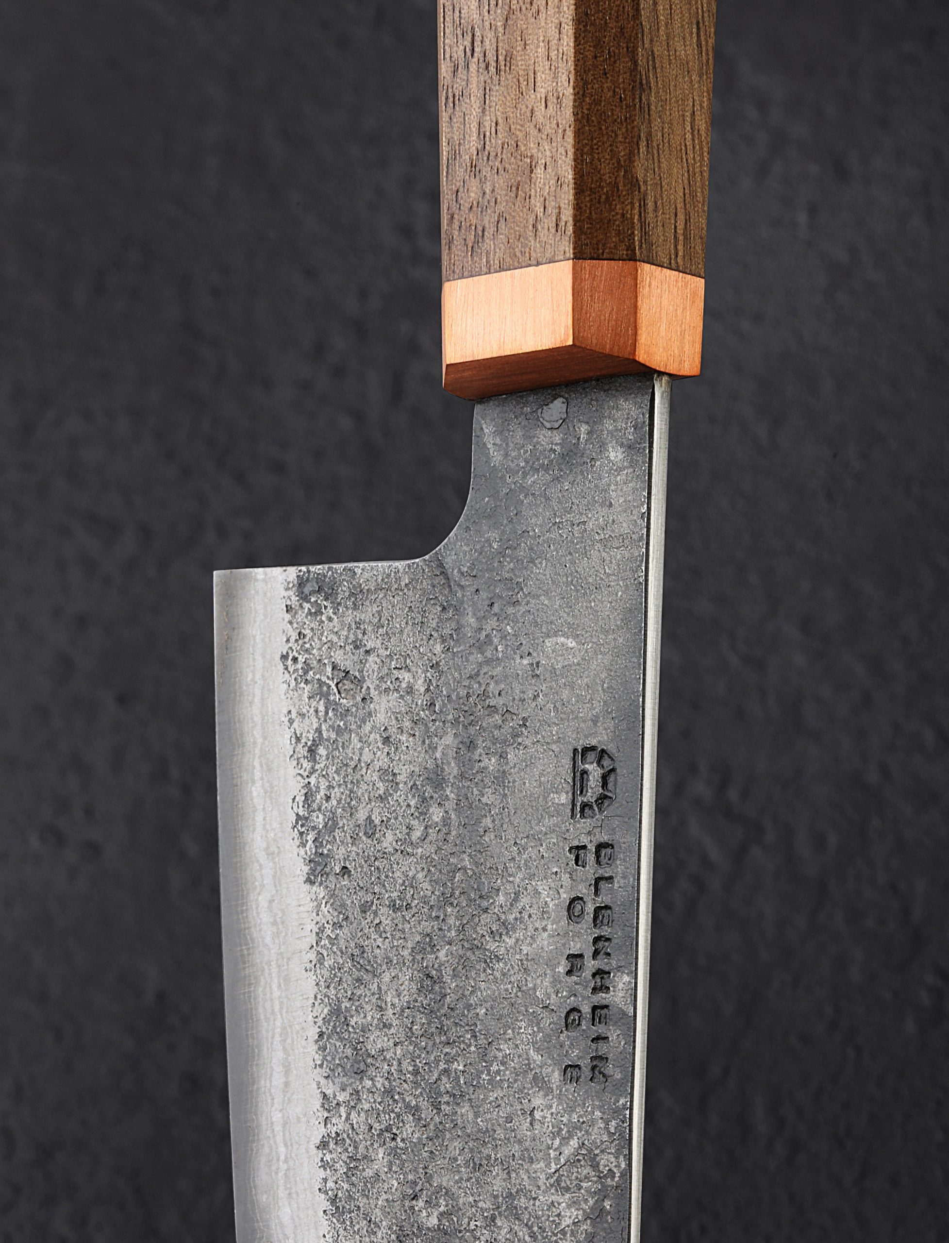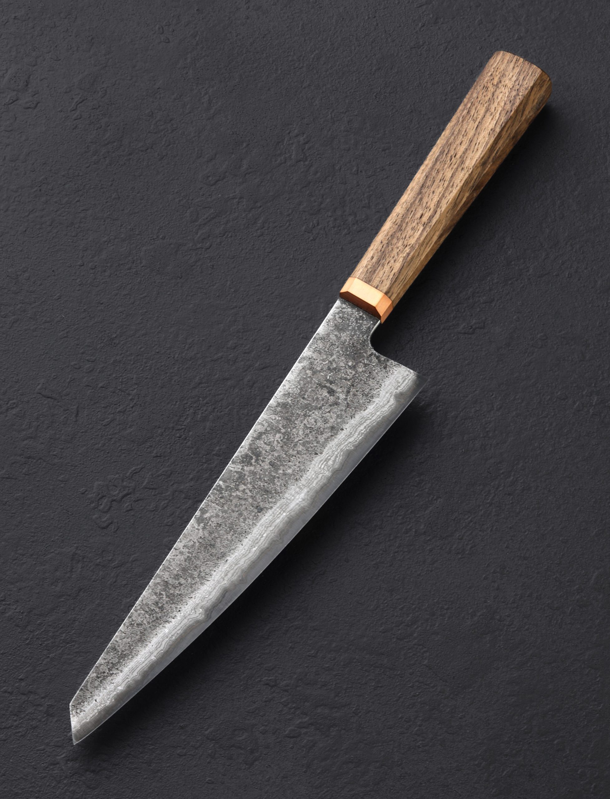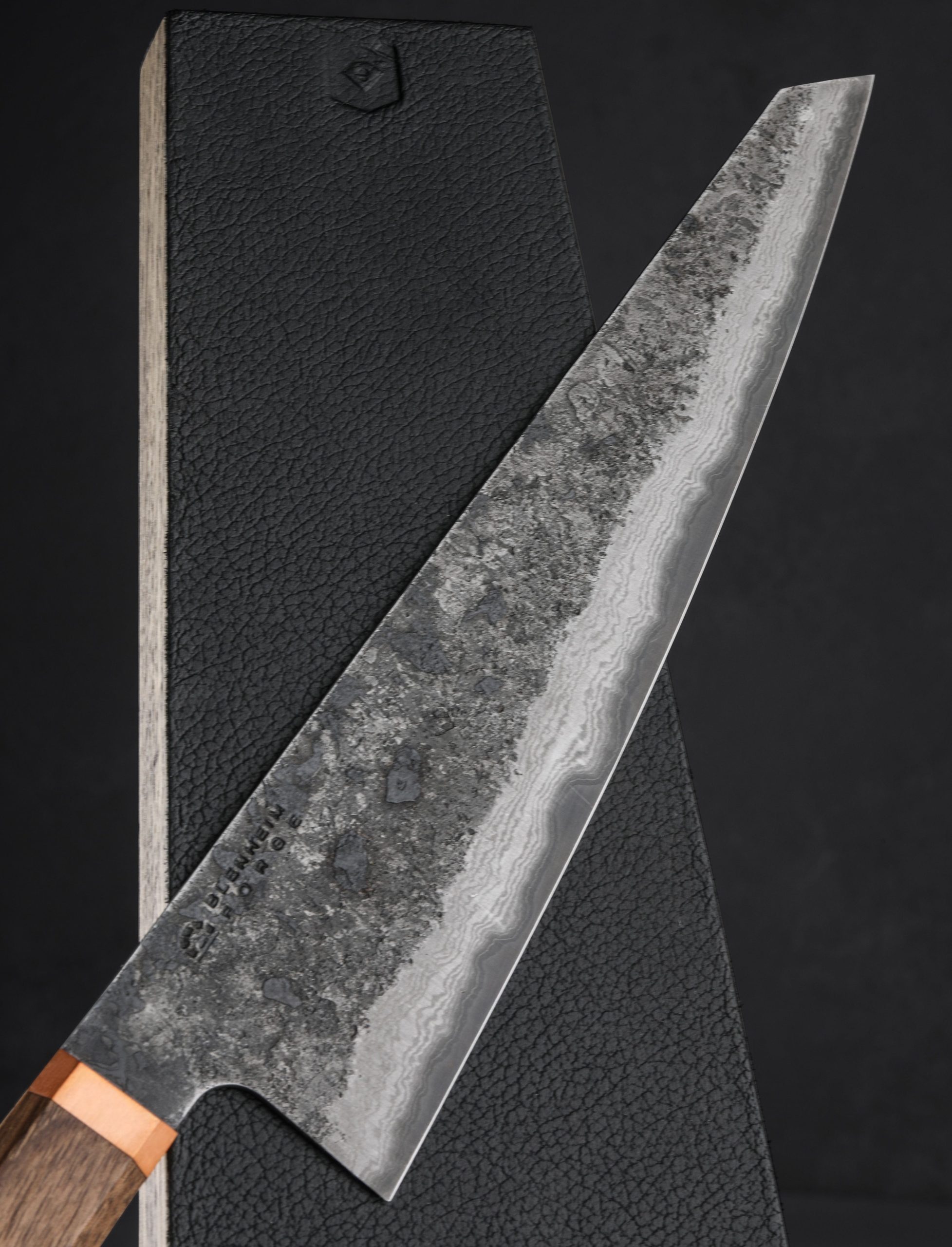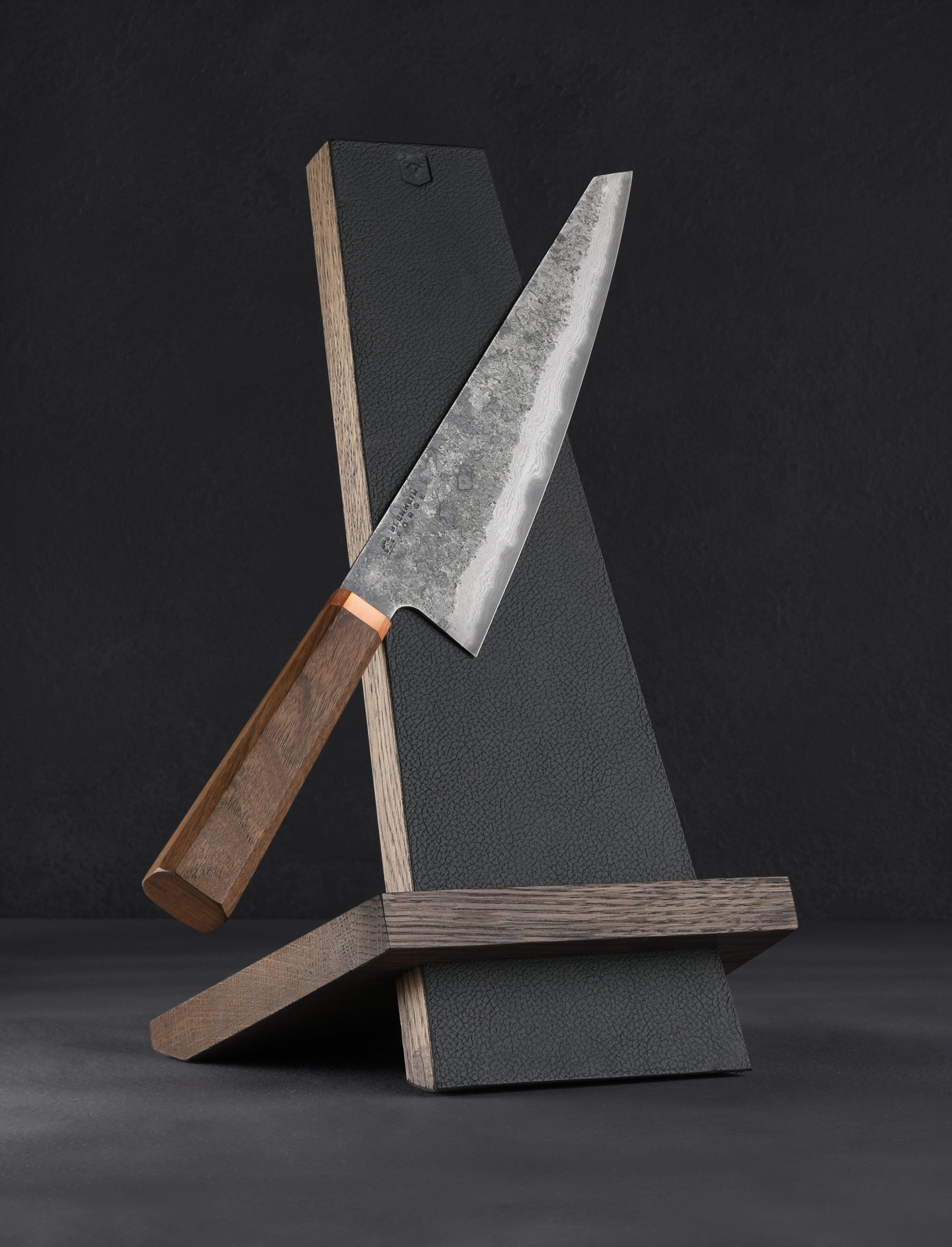 Every knife needs a place to call home in your kitchen. In this gift set you receive a handcrafted gyuto from Blenheim Forge of London, and a luxurious Leather & Oak Magnetic Knife Stand handcrafted in Sweden by Mikael Gröndahl. Versatile and hard working, the full-size Blenheim Gyuto, with a blade length of 220mm / 8.66″, forged from a damascus-clad san mai formula with Japanese Aogami Blue carbon steel edge, is strong, thin, and razor-sharp, making it the ideal tool for chopping vegetables atop a cutting board, slicing meat, and much more. Minimal in design, and the space that it takes up, the two-piece knife stand is easy to assemble and keeps your knives close while displaying them handsomely on the countertop. Available at a special price and paired for the first time, available while supplies last.