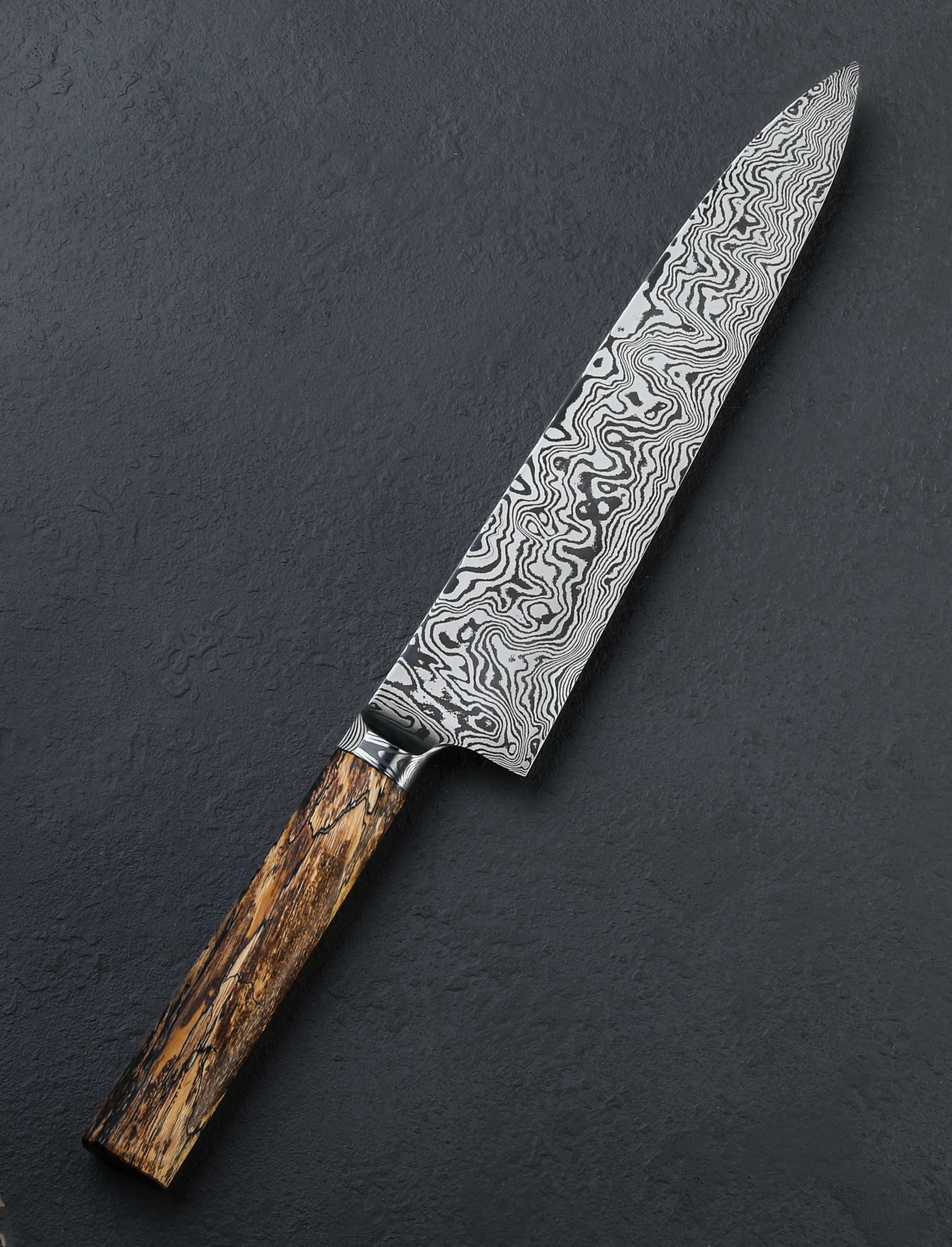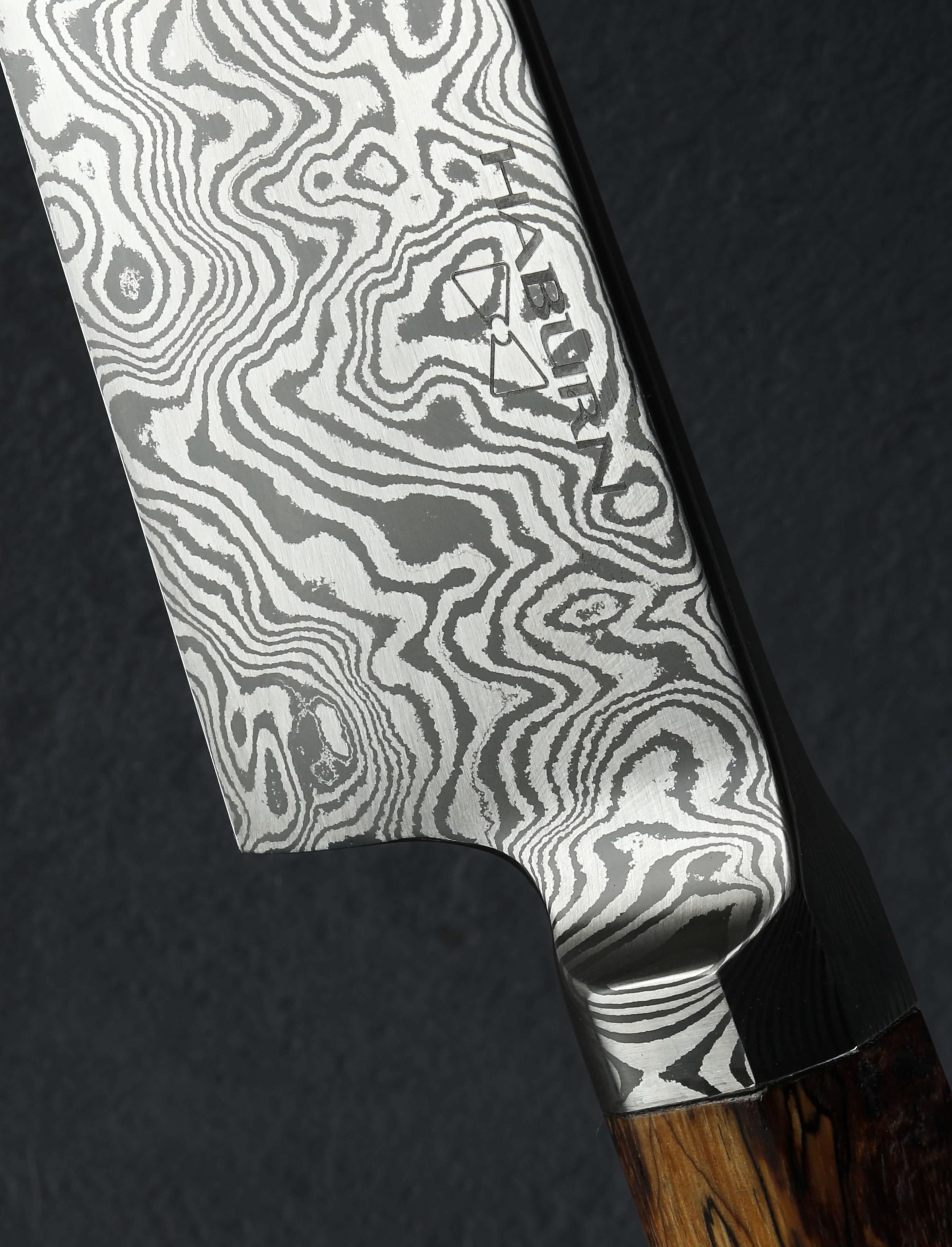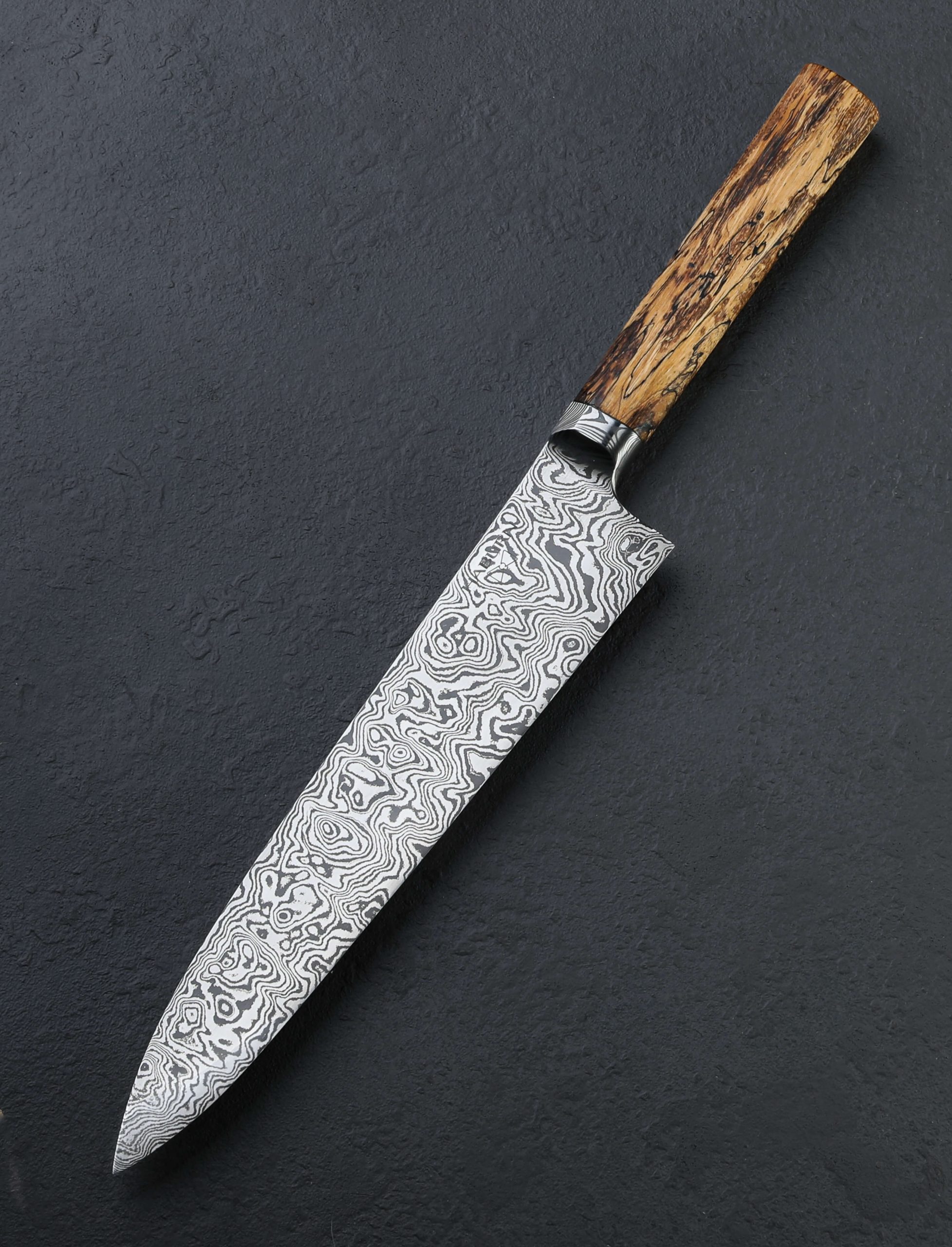 Presenting a rare opportunity to own and cook with a pre-owned, like-new, 250mm damascus chef knife by Ian Rogers of Haburn Knives. Ian recently refinished the knife from handle to tip for us, making this one-of-a-kind build, in his homemade carbon damascus steel, ready for uncompromising performance in home and professional kitchens alike. Standing 51mm tall at the heel, the long, handsome blade enjoys mid-height convex primary bevels that slim downward to an especially thin, ‘near-zero’ edge with only the subtlest of secondary bevels, hard and sharp and beautifully positioned for all manner of daily meal prep. Its length combined with the gyuto-style blade profile that includes a long, flat stretch of edge from the heel forward, positions this blade for delicate and precise slices, while providing ample heel hight and other attributes needed for chopping of even the largest foods. Balancing nicely just as handle bolster meets blade, the 250mm / 9.8″ of high-contrast damascus steel flexes laterally throughout its length, the spine’s full distal taper and Ian’s excellent hardening process resulting in a dynamic and versatile cutting tool. Forged by hand and sculpted to match the rest of the handle’s shield-style wa profile, the integral bolster displays the damascus’s pattern on all sides before merging, with heirloom fit, to a stunning piece of spalted tamarind. Boasting as much character as the knife itself, the natural grain of the wood complements the steel wonderfully, together forming an artful culinary object poised to rule the kitchen.