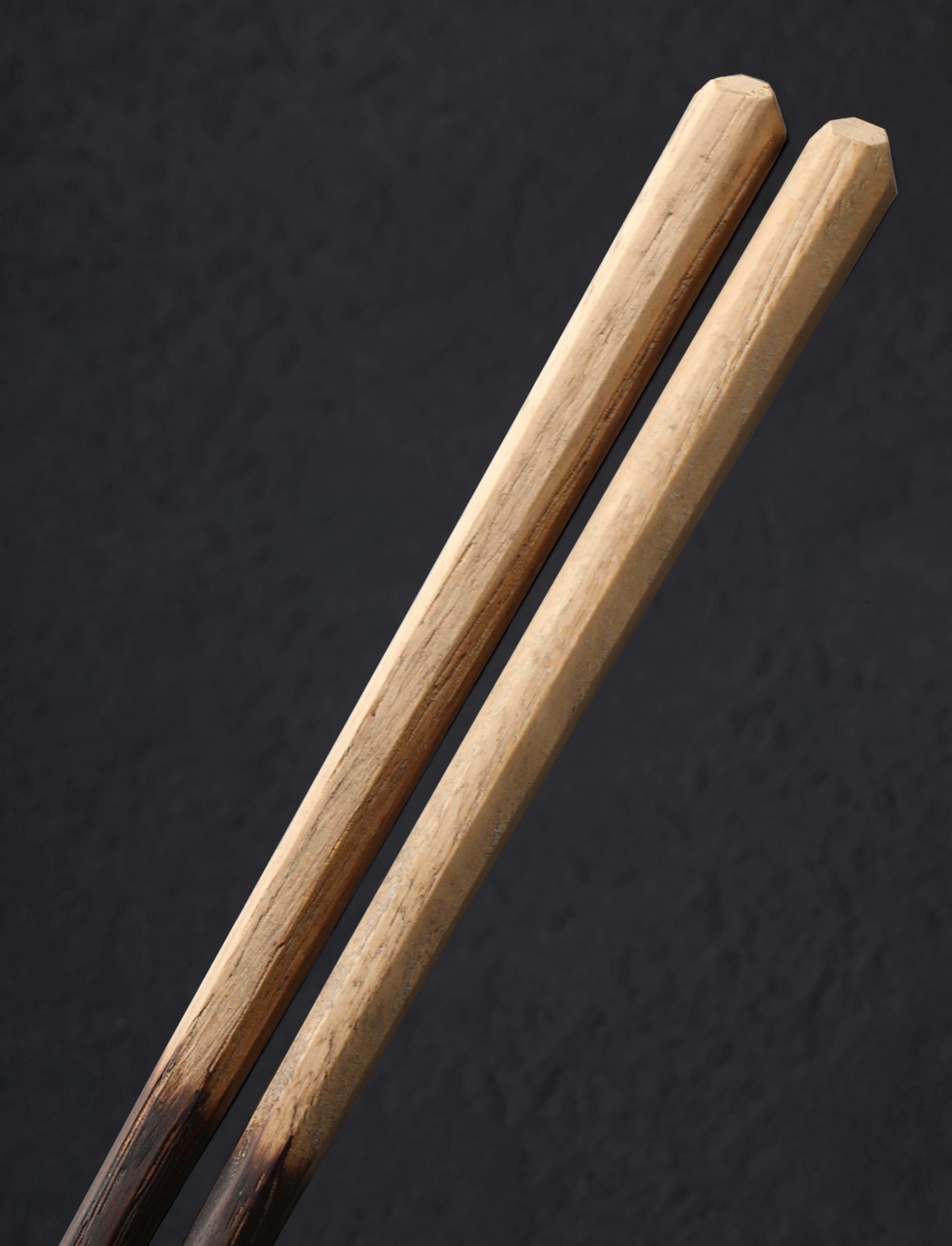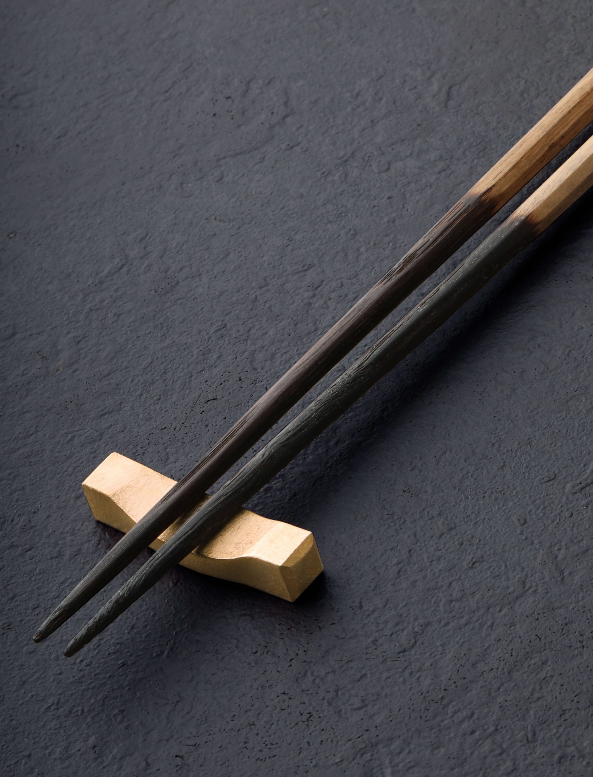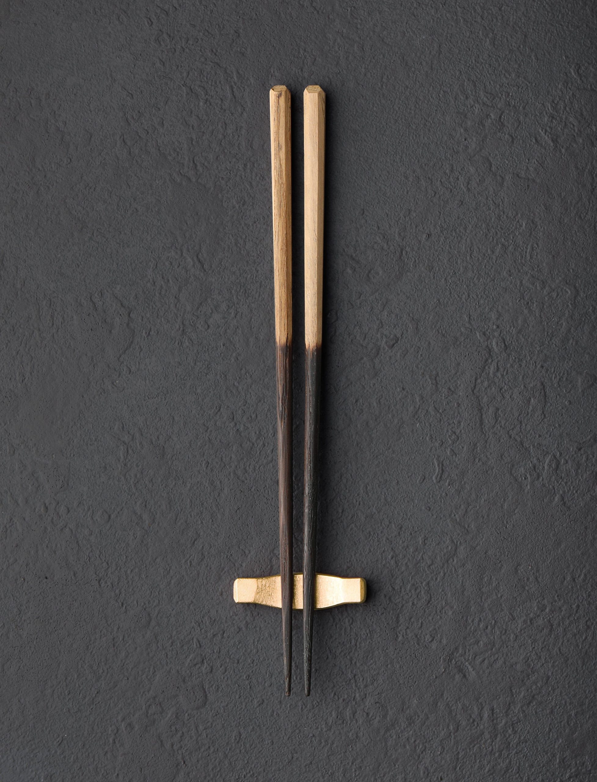 Japanese chestnut wood, carved by hand with tips charred by fire, are available with a hand-forged copper chopstick rest, crafted by Eric and Lori Wright of ME Speak Design at they studio in Georgia. Beyond their aesthetic beauty, we love hashi chopsticks for their function and versatility, the domed, octagonal upper sections gently tapering to precise yet sturdy tips, carved from beautiful, locally sourced hardwood that grasps every morsel with ease while feeling effortless to control. The shou sugi ban technique is used to give each stick a charcoal finish, helping to preserve the wood and giving it a rustic look. The solid brass rest is a simple, elegant tabletop accessory in itself.