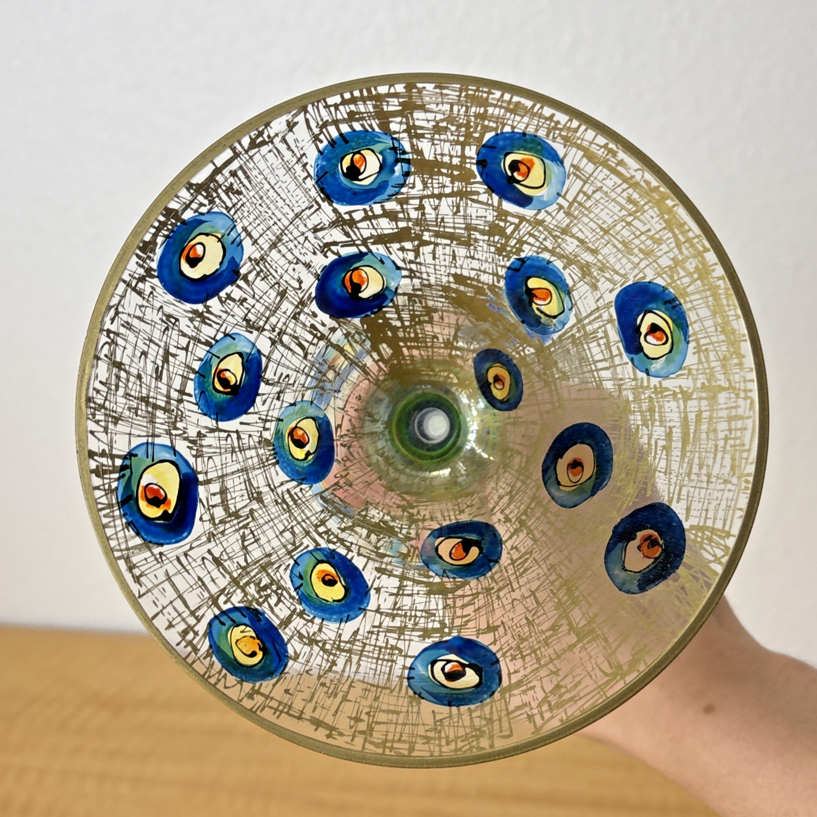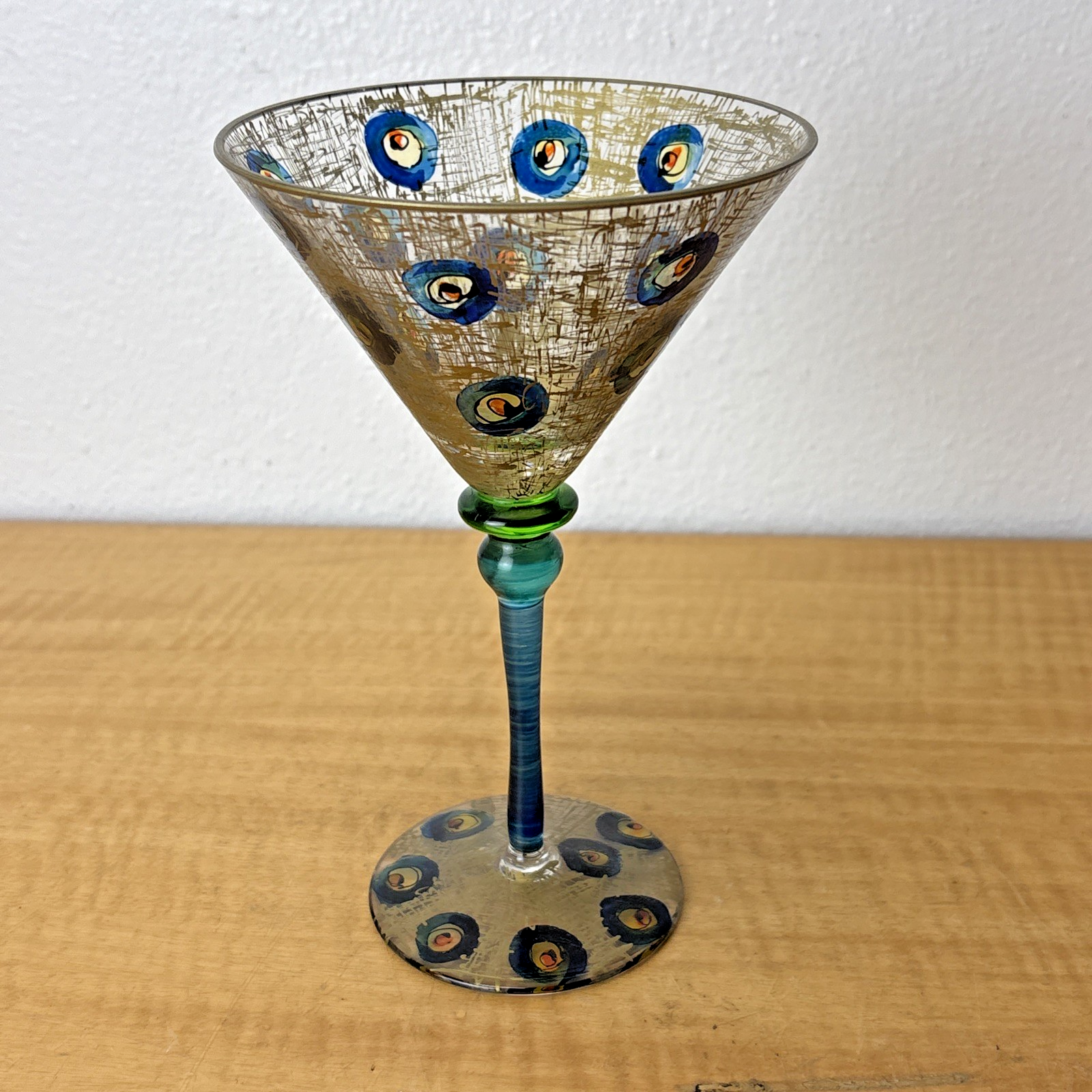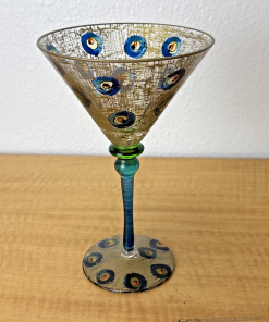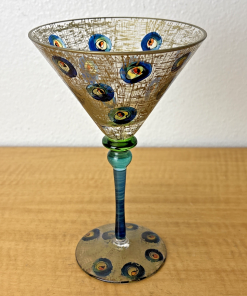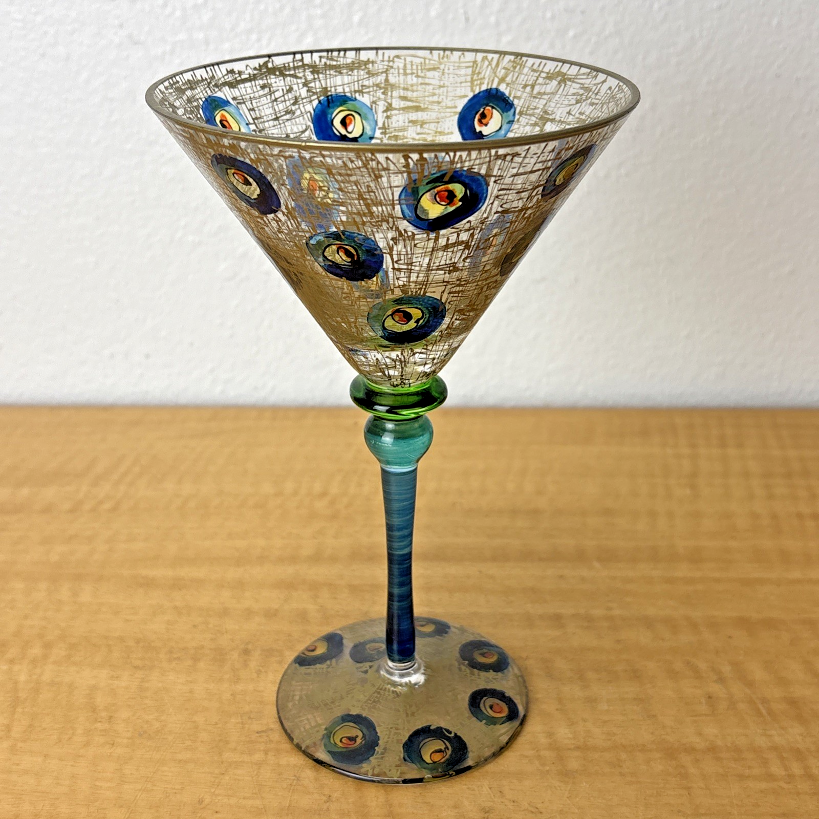 Hand Painted Peacock Martini Cocktail Glass Gold Lattic Olive Design