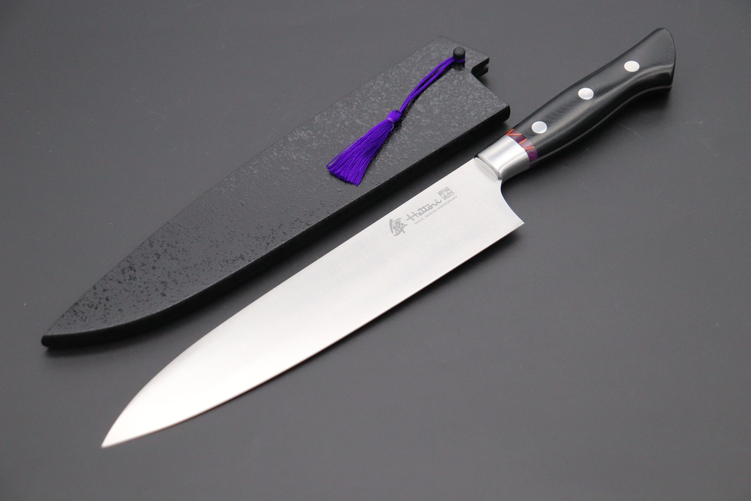 Hattori 傘 SAN-GECKO Limited Edition GECKO-18B Gyuto 210mm (8.2 Inch, Linen Micarta/Royal Purple Hybrid-Resin Handle) is produced for only 1Pc.