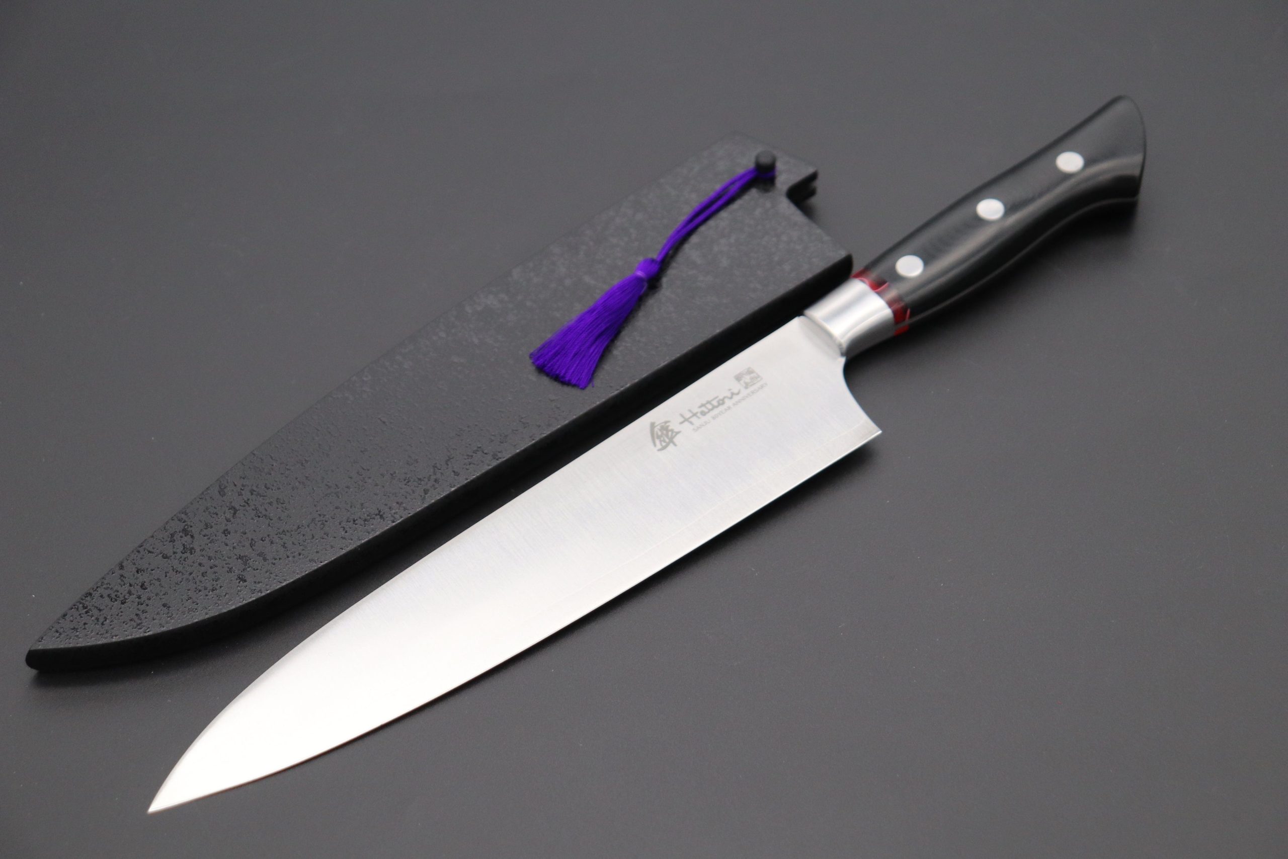 Master Hattori believes Linen Micarta is one of the most practical and efficient handle materials. Linen Micarta Handles provide excellent grip, are relatively strong and durable, and also resist shrinkage. Finely hand crafted and hand polished Linen Micarta Handles of these knives are beautifully accented with a Strawberry Hybrid-Resin Spacer and also feature solid stainless steel bolsters and rivets. Each handle is hand contoured to fit your hand comfortably and, to create the perfect weight balance, the full-width blade tang has been tapered down.