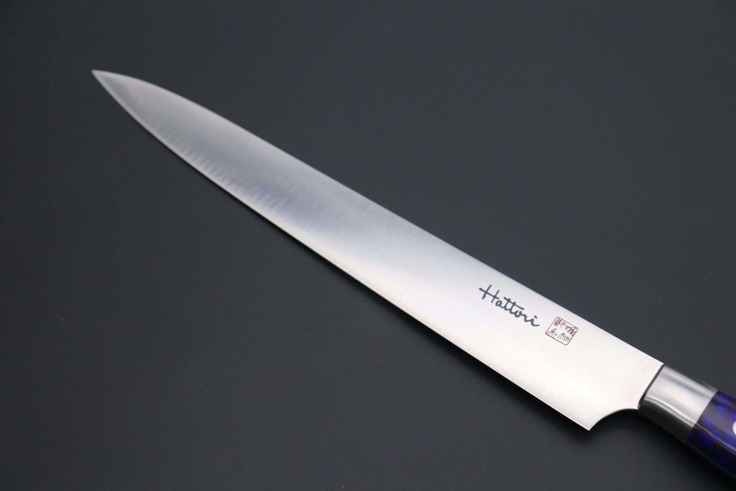 Master Hattori chose to use a very unique and beautiful Deep-Blue Turquoise Gem-Composite-Stone Handle. The Deep-Blue-Turquoise Gem-Composite-Stone Handle has a beautiful appearance and to ensure that it can be gripped comfortably, it has been carefully contoured and polished by hand. The full tang is taper ground to reduce weight and perfect balance.
