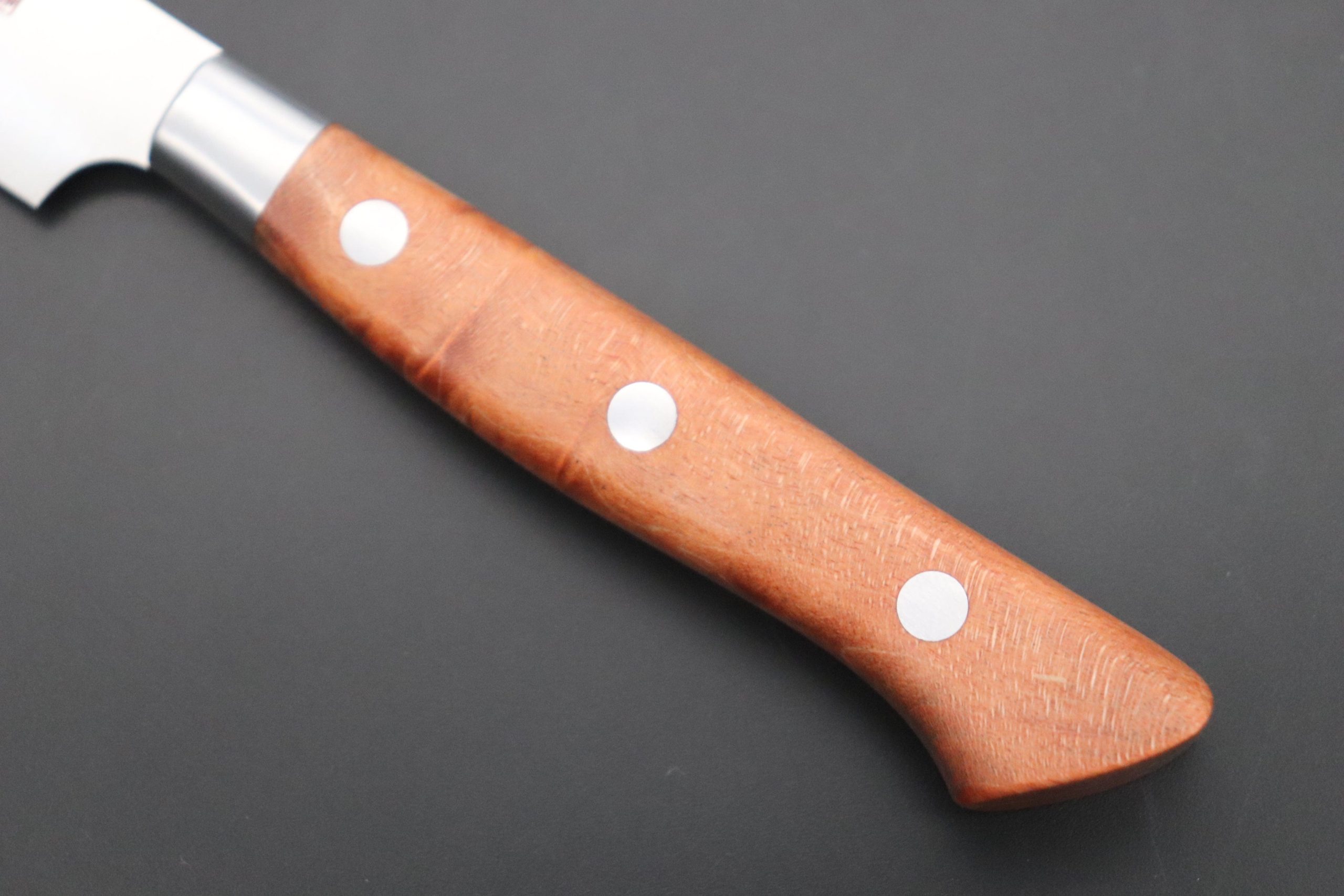 A mainstay of professional Western kitchens, the Petty knife is a small general-purpose knife used for peeling, shaping, and slicing fruits and vegetables, chopping herbs, and making garnishes. The compact size and relatively narrow blade of the Petty knife mean that it is very nimble and controllable, thus it is ideal for making precise cuts.