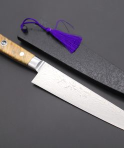 For the handle material, Master Hattori carefully selected natural taste and color of Stabilized Maple Wood, which has a unique and natural woodgrain pattern and a fresh light color. The perfect shape and countors of the handles further showcases Hattori’s fine custom handwork. “Natural beauty” and “warmness” are the words that best describe the new Hattori FH Series Gyuto with Stabilized Maple Wood Handle.