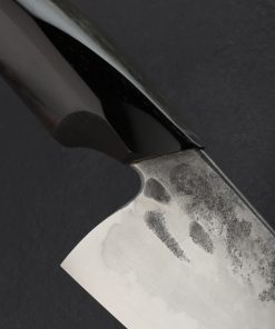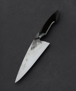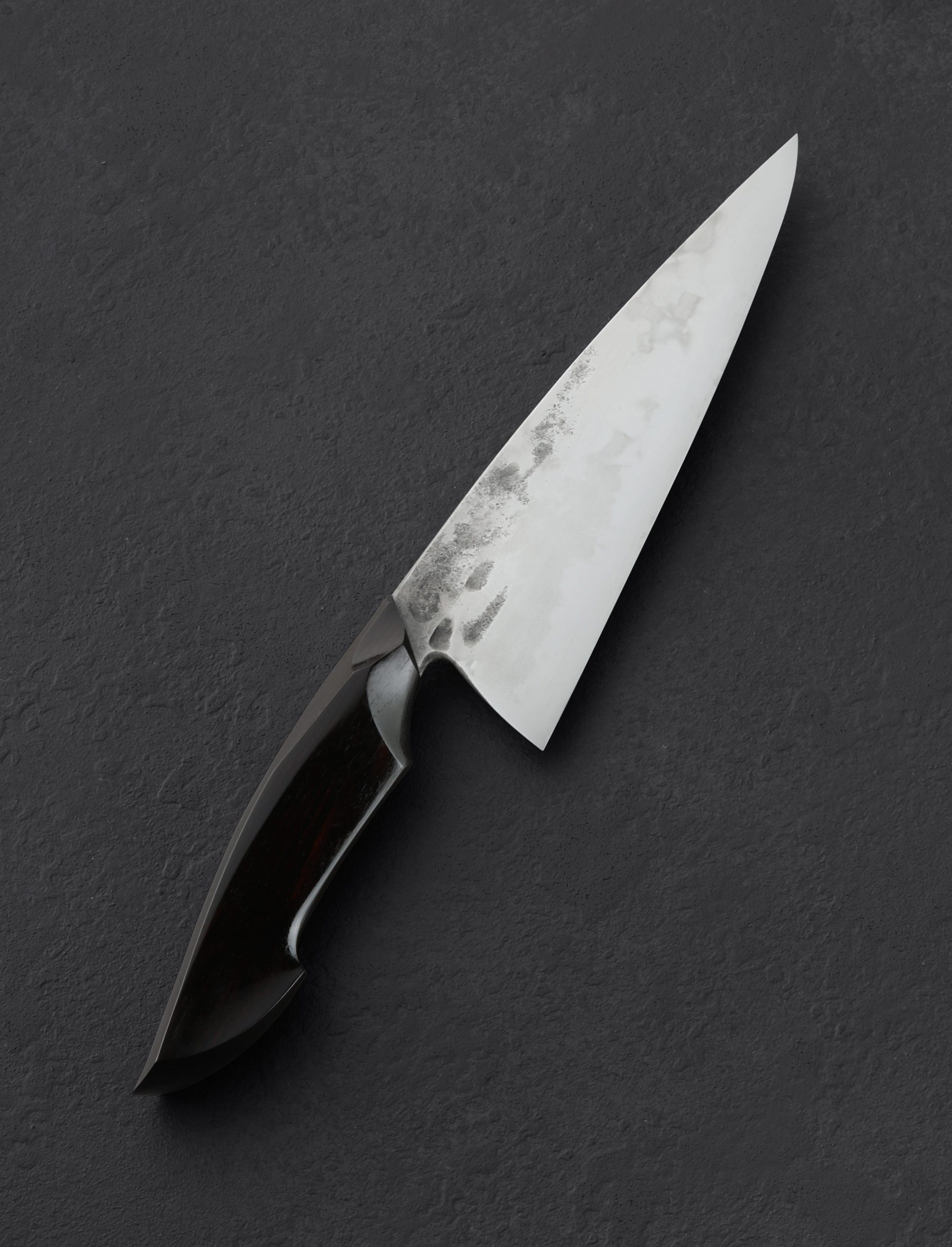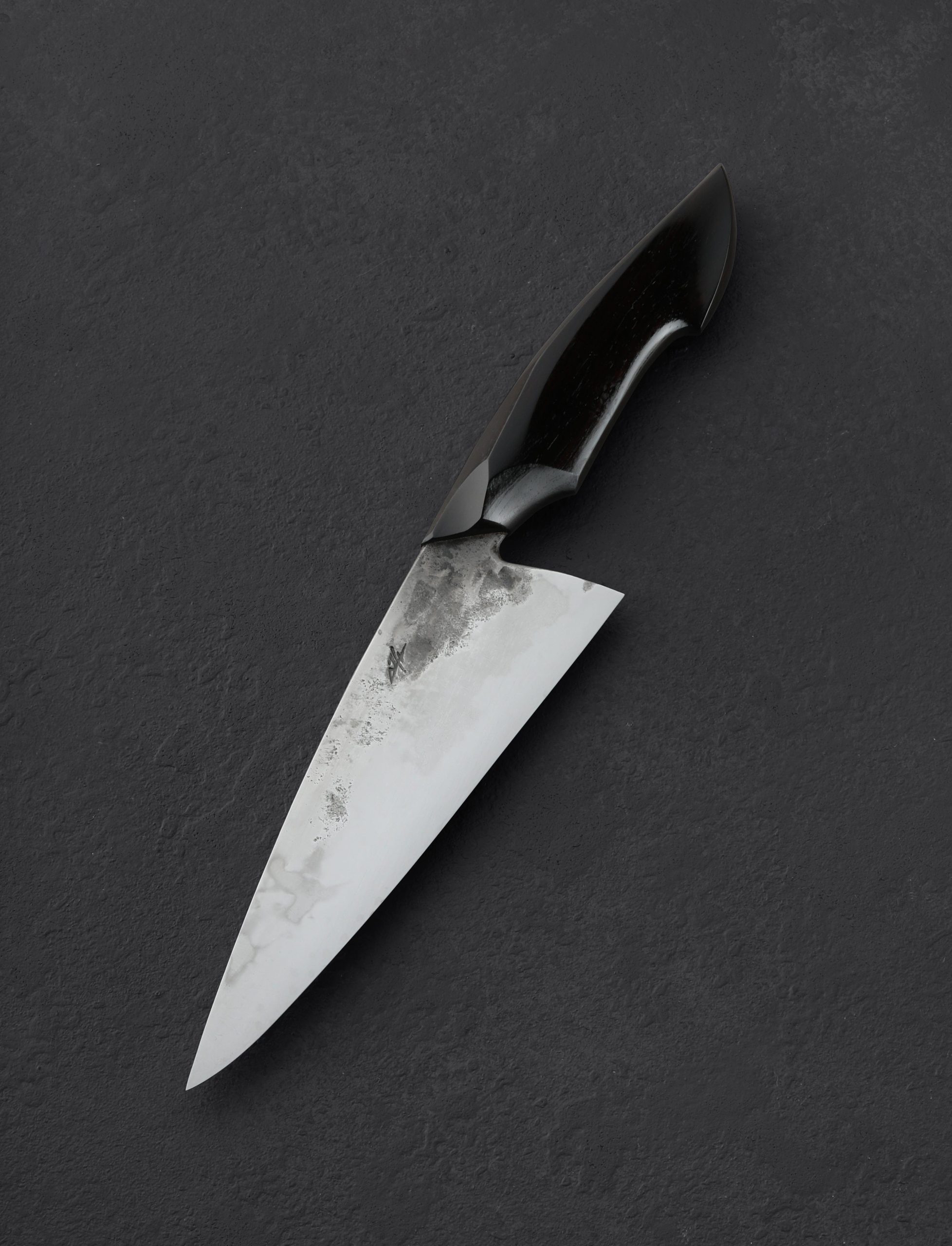 In pristine, pre-owned condition, this is a wonderful opportunity to bring home a chef knife handmade by Jelle Hazenberg that delivers all of the elements that make his work so sought after. Forged from 125sc (‘super-clean’) carbon steel, the 190mm / 7.5″ honyaki blade enjoys a lustrous, high-polish finish with bevels etched to reveal a striking and detailed hamon, coupled with a textured, forge-finished stretch near the tang on either side showing the hammer marks of the blade’s origins. Superbly convex above a thin, hard, hair-popping sharp edge, the geometry is spot on, while a full-distal taper along the rounded spine slims to a razor-thin, pointed tip for uncompromising precision. Complementing the contoured choil and spine for comfort and control is a handle in Jelle’s iconic, sculpted style, shaped from beautiful African Blackwood to hug the hand in any grip. A one-of-a-kind cutting tools with heirloom quality finish from this talented, Ireland-based Dutch maker.