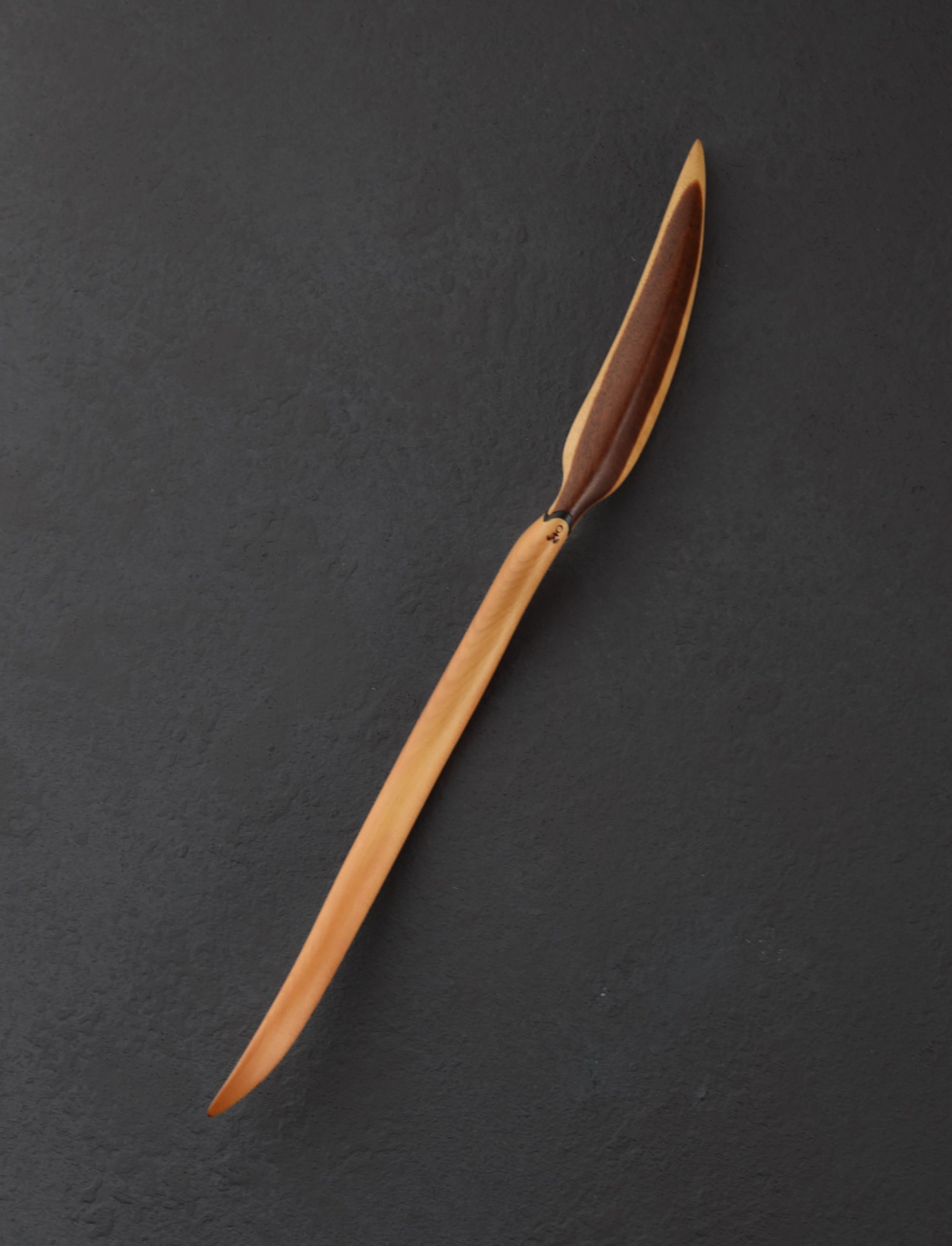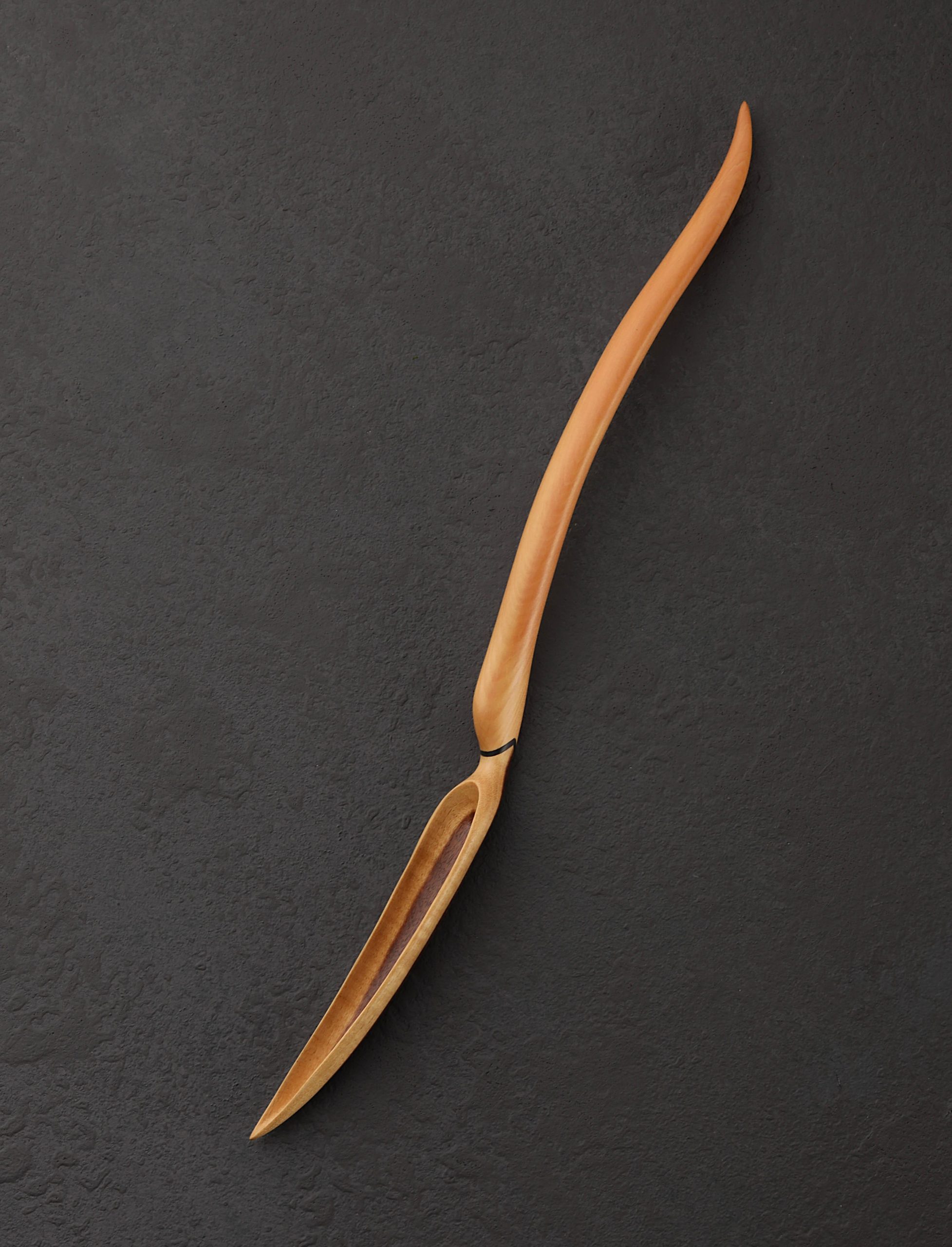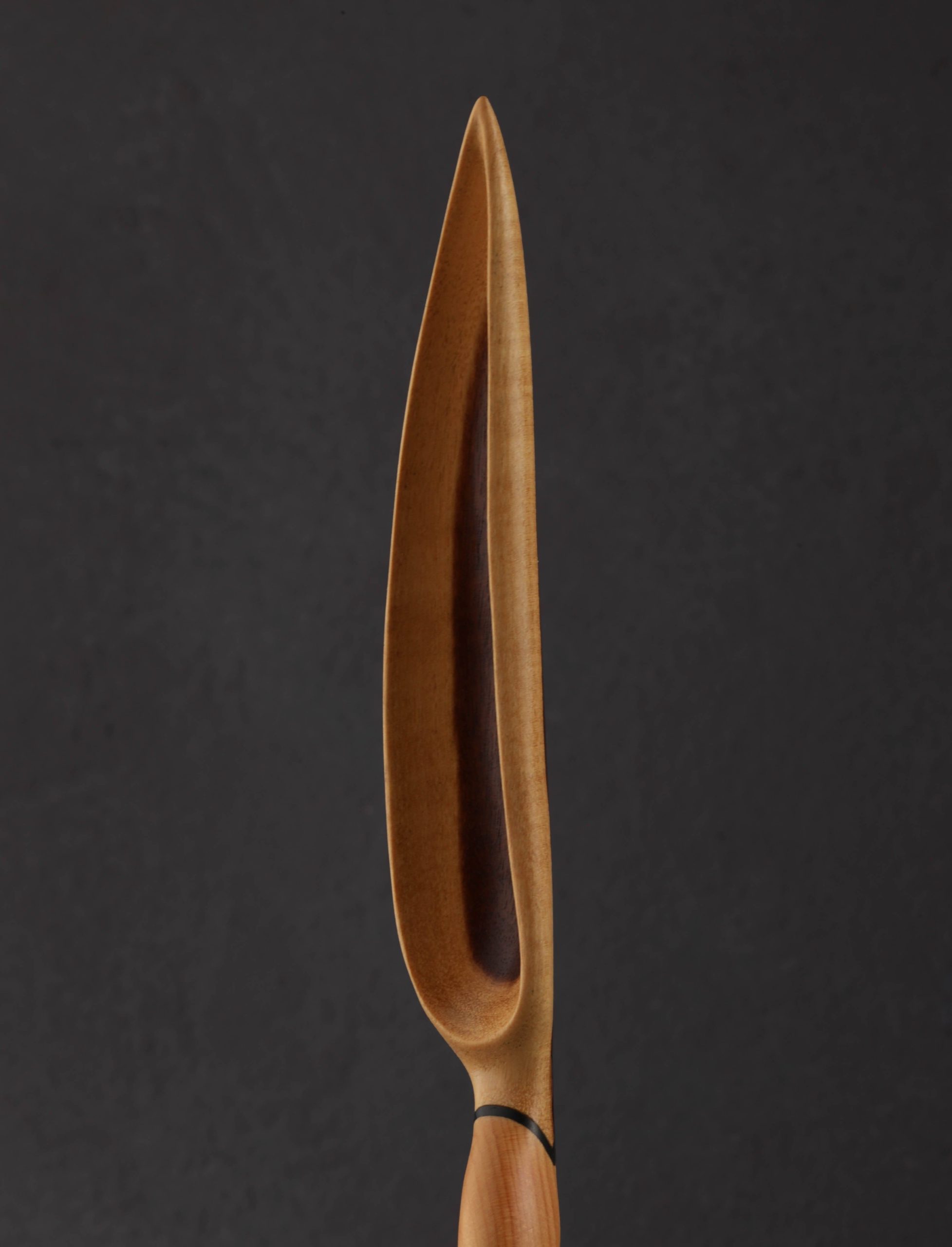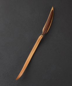 Lightweight and smooth, this wooden spoon from Florida artist Terry Widner of Spoontaneous adds a touch of unique and playful flair to your kitchen. The bowl is sculpted of rosewood, thoughtfully planned with a sapwood rim allowing for the variation in color. The handle of Huon pine, provided to Terry by fellow elite spoonsmith Norm Sartorius, is attached with a “V” shaped ebony veneer, creating a seamless and simple yet beautiful transition. This work of art is recommended to be used either for dry goods or as a display piece to your kitchen or dining room.