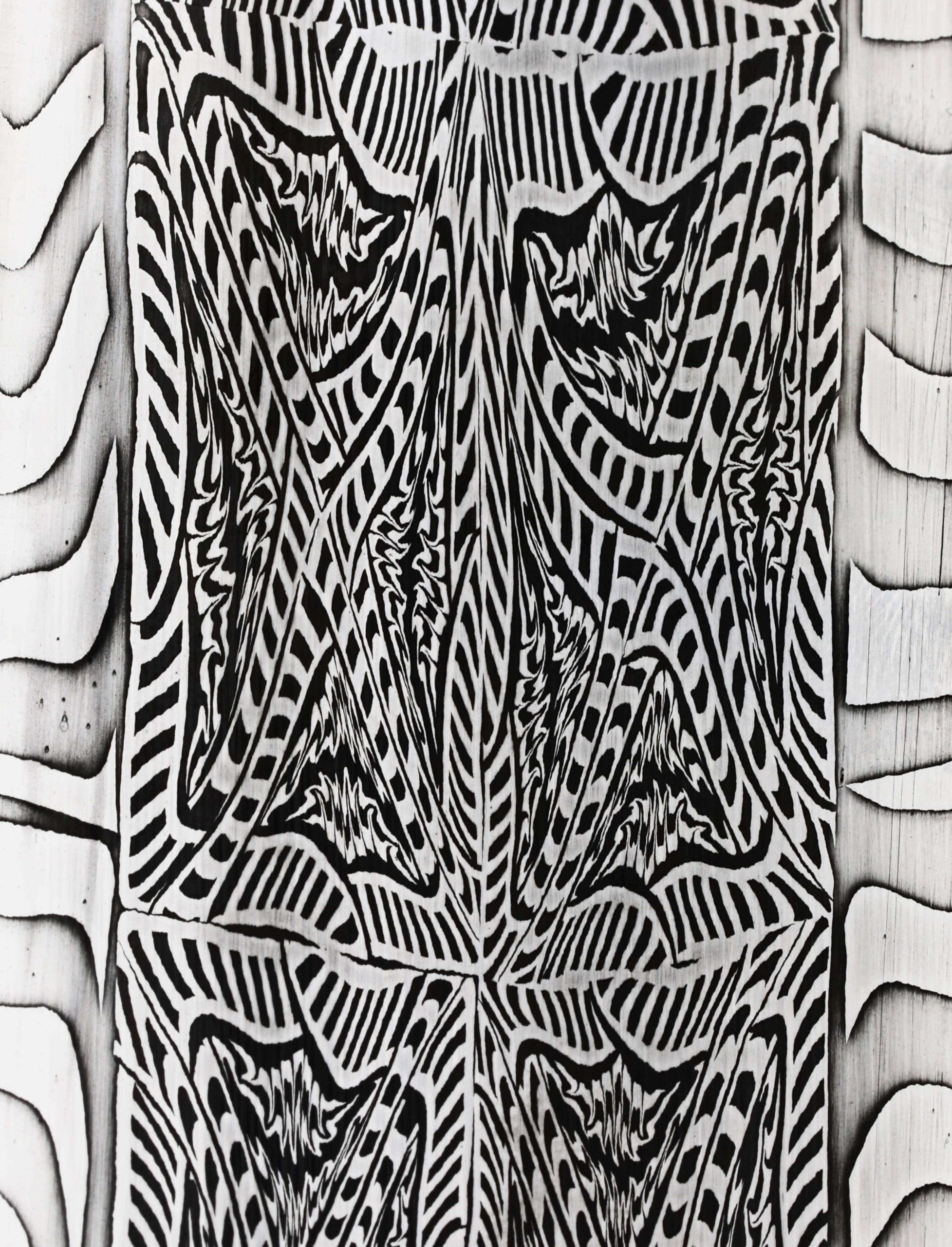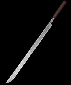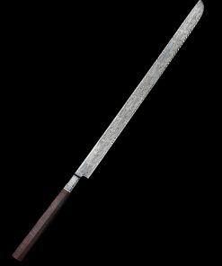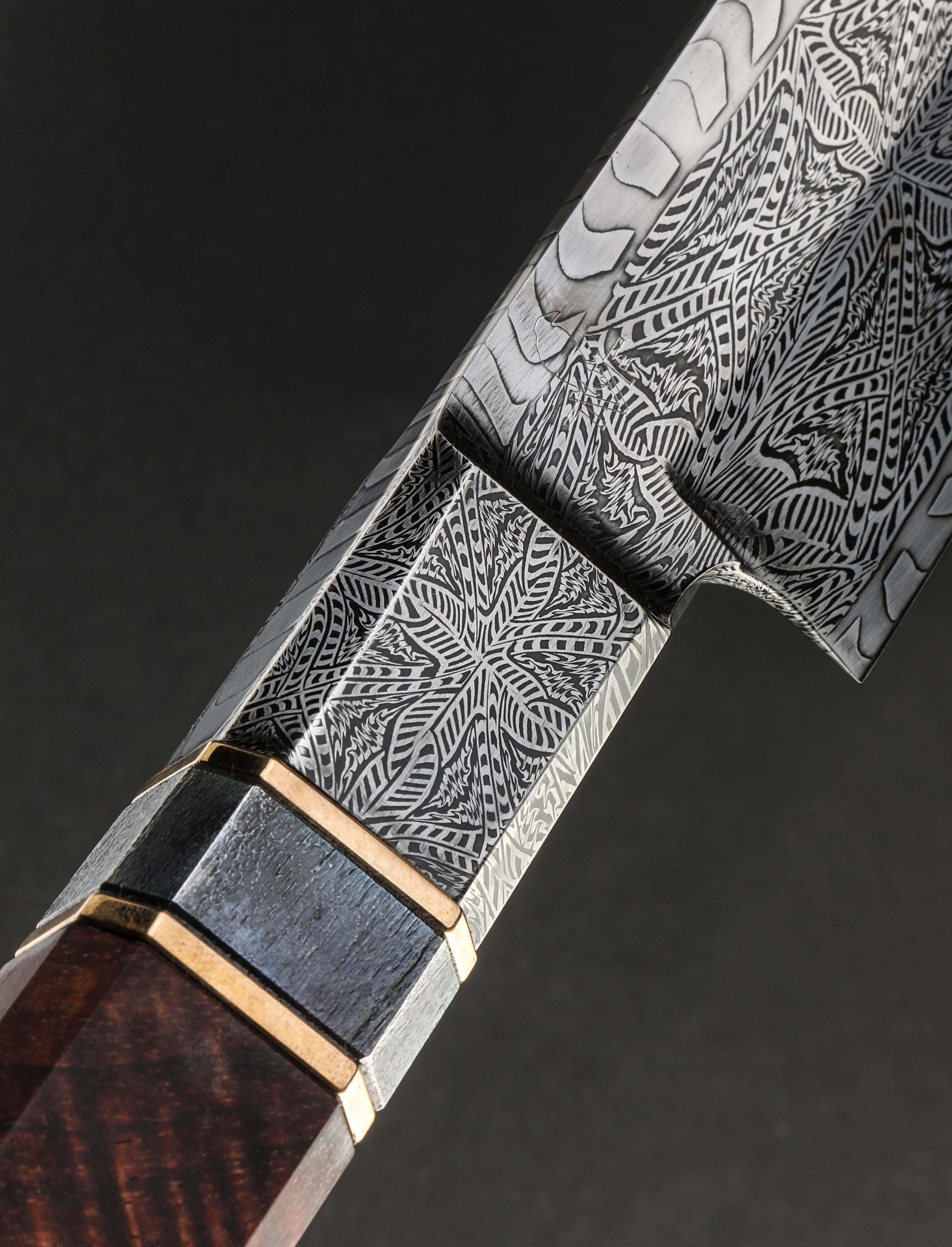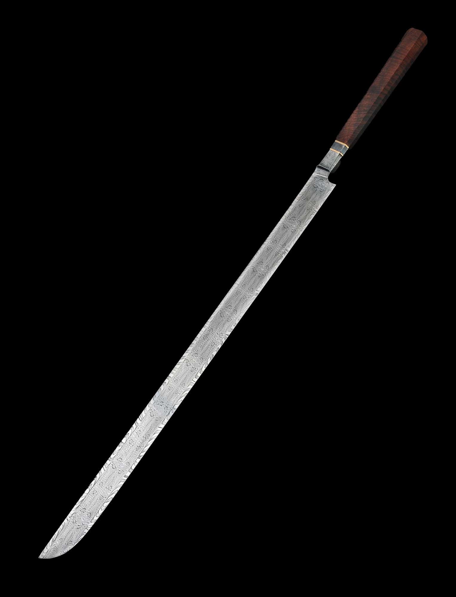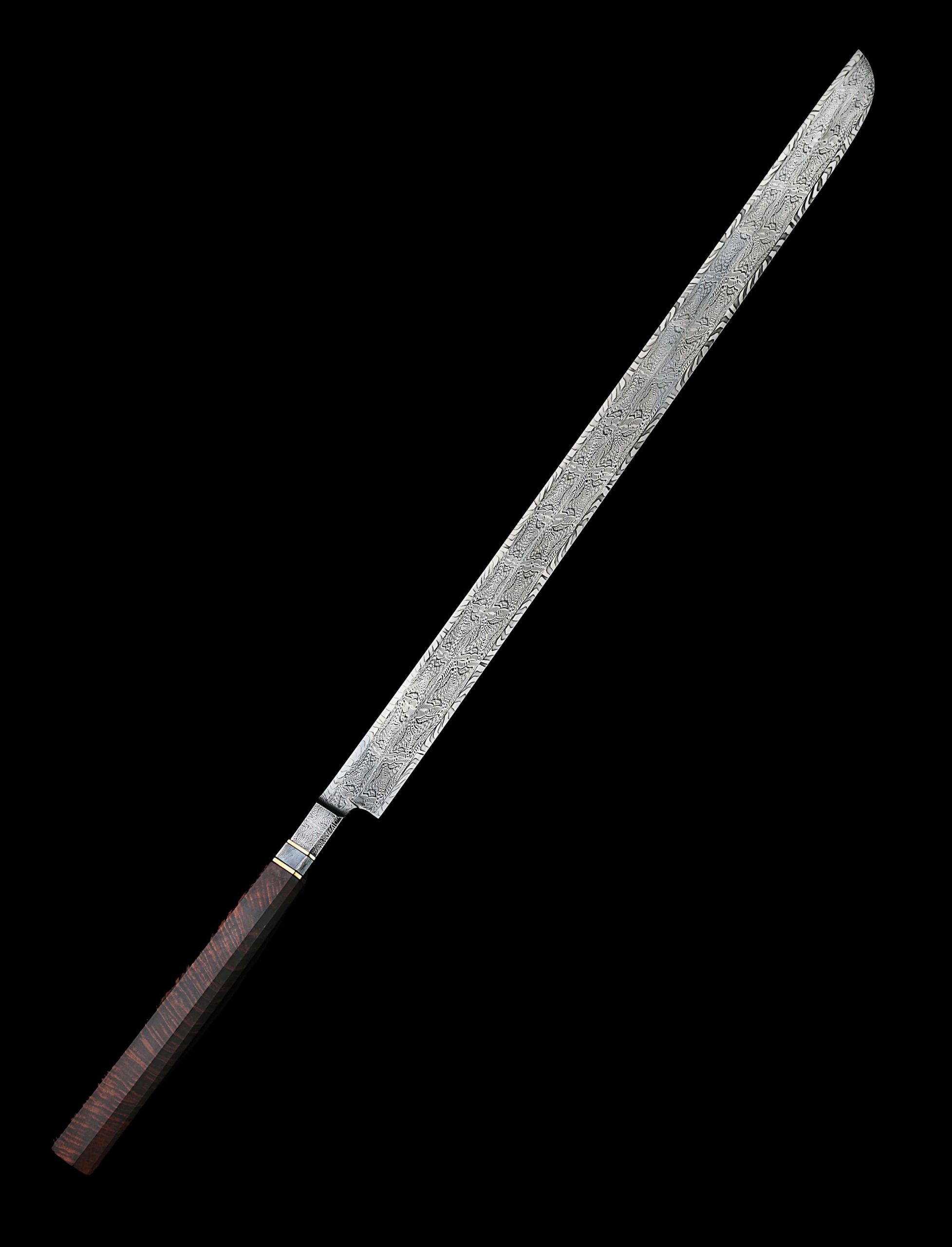 North Vancouver artist Casey Vilensky’s contribution to The Art of Cutlery, a tuna knife named “Hereafter,” on show during summer 2024 in Tribeca, NYC, combines an intricate, multi-bar mosaic damascus pattern, full single-bevel geometry, and integral bolster construction, at a scale rarely if ever seen before. Consisting of dozens of individual tiles of homemade damascus steel, each containing countless metallic layers and minute details, the blade is shaped by Casey for right-handed chefs, a single bevel on the blade’s right face, and concave ura on the back face. The aforementioned geometry, traditional to a number of Japanese blades types designed for sashimi and seafood preparation, allows for the thinnest, sharpest possible edge and most precise slices of proteins, namely tuna in this case, and other seafoods. The handle, large enough for two-handed operation (the entire knife able to support two-person operation), is sculpted from koa wood, wrought iron, and bronze. In its finished form, 700mm / 27.6″ of razor-sharp edge are ready to cut upon delivery.