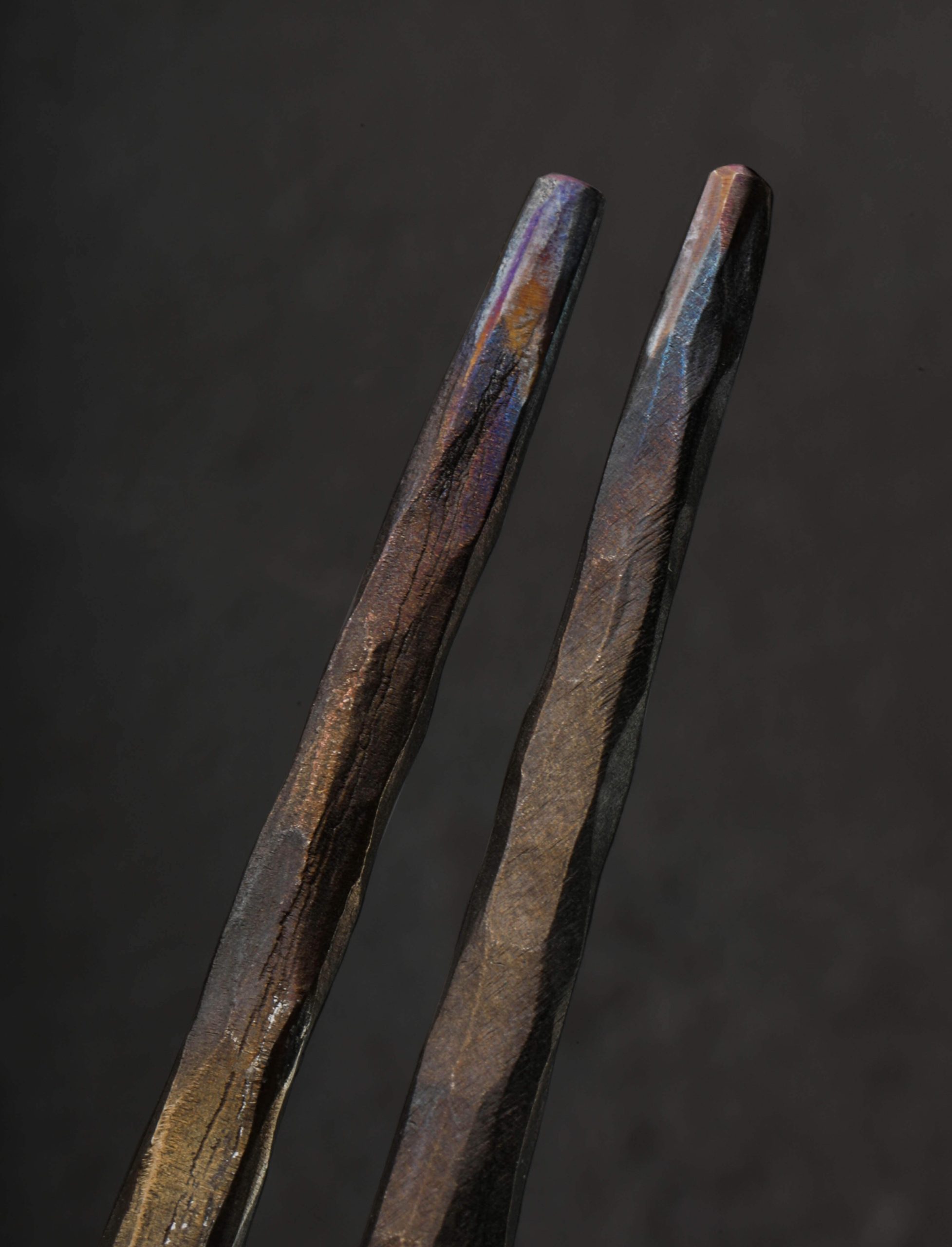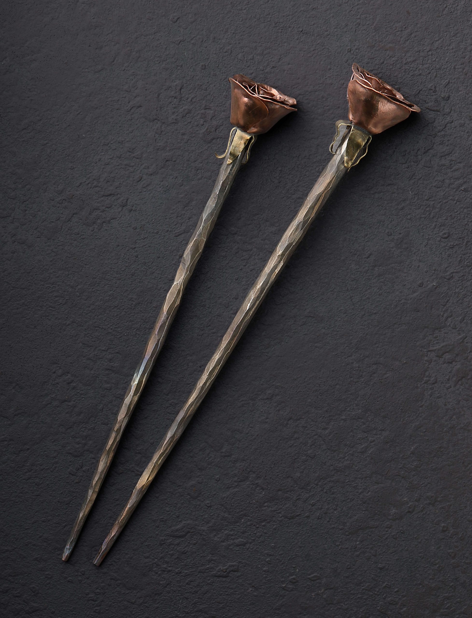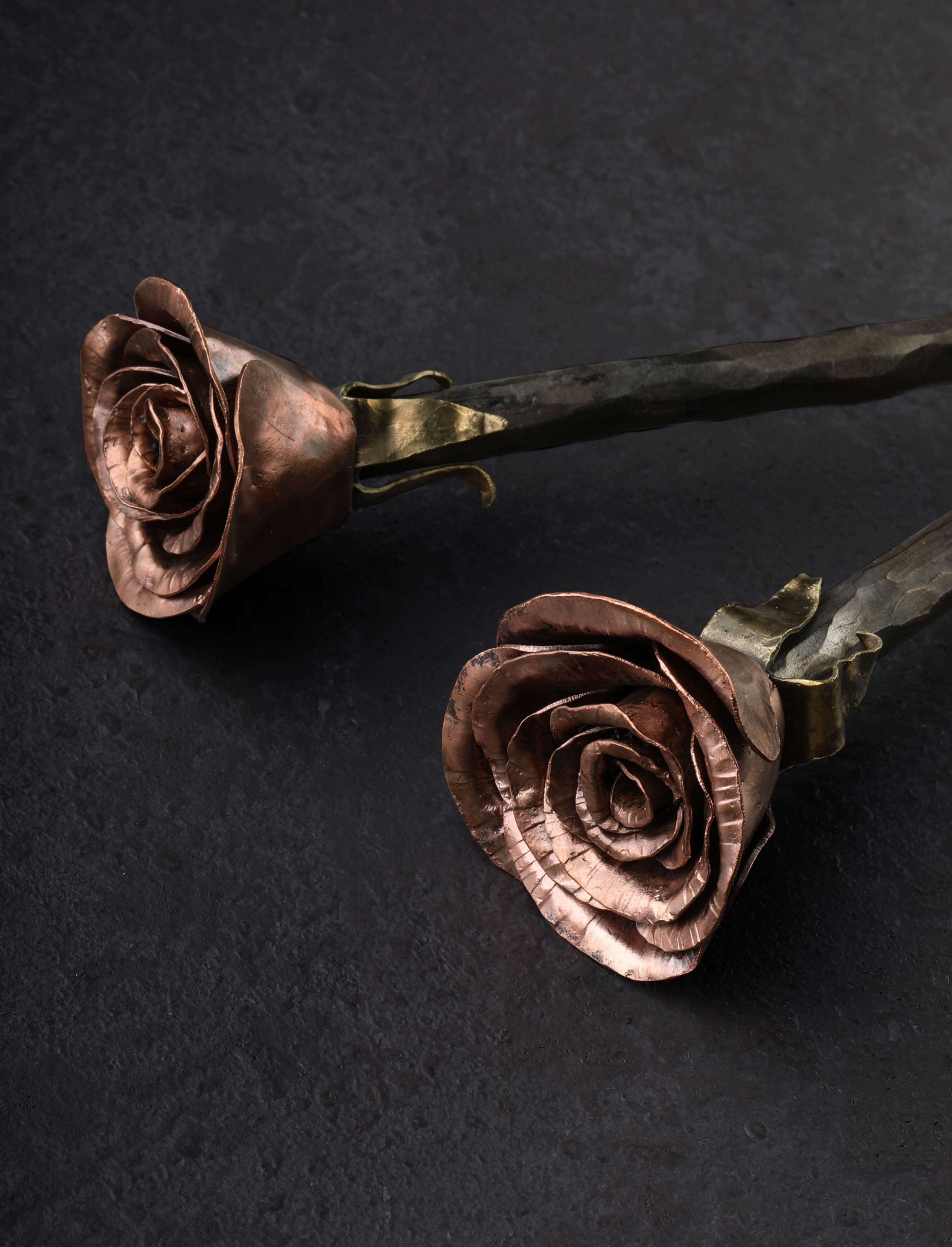 A one-of-a-kind eating experience awaits, courtesy of Washington State artist David Lisch. Beautifully balanced and a delight to dine with, solid titanium is forged by hand to create stems which reveal blooming metallic hermosa roses of copper and brass, promising an unforgettably beautiful culinary moment with every bite. Sculptural art for the dining room crafted by a superbly talented and creative maker with decades of experience shaping metal to form heirloom objects for eating and living.