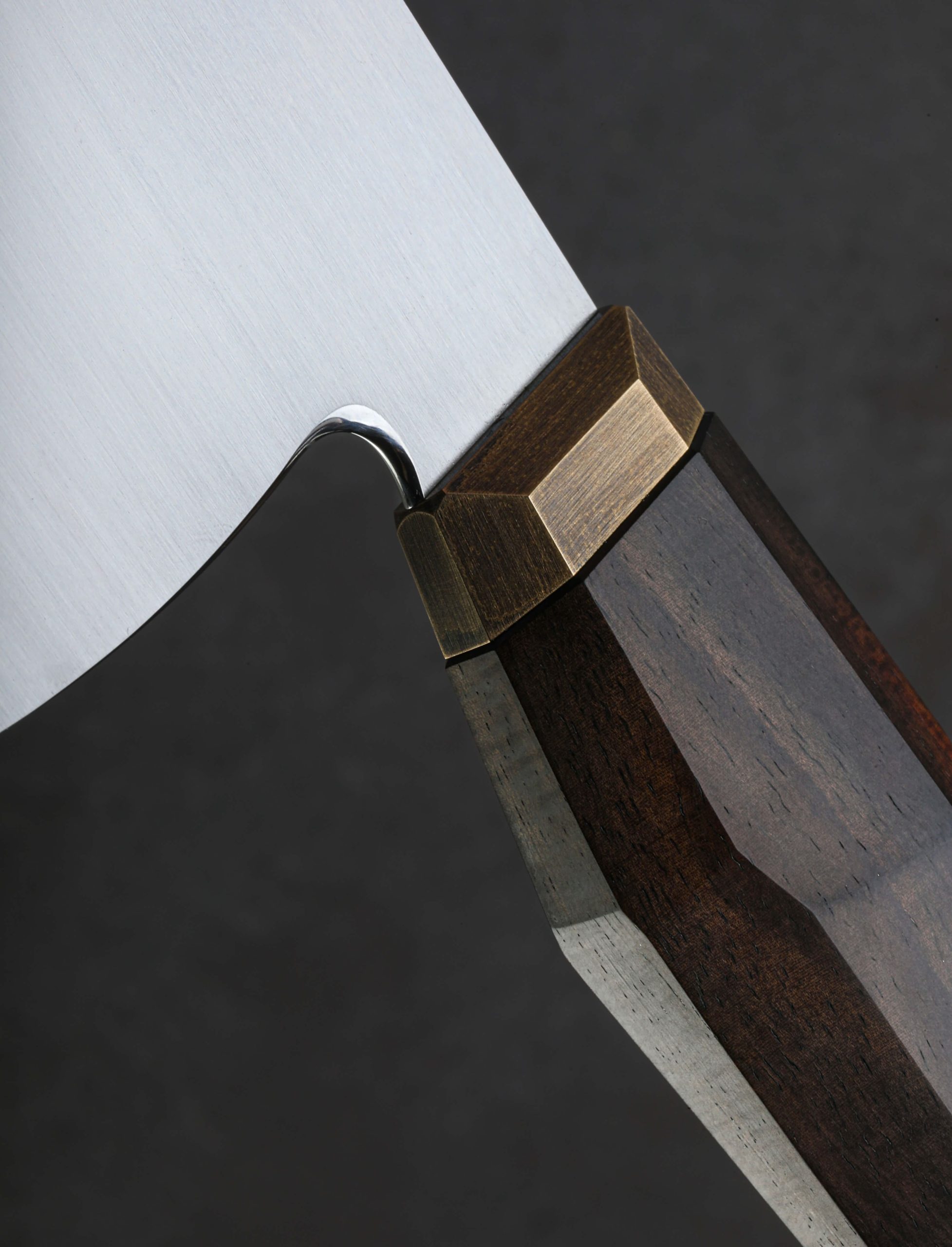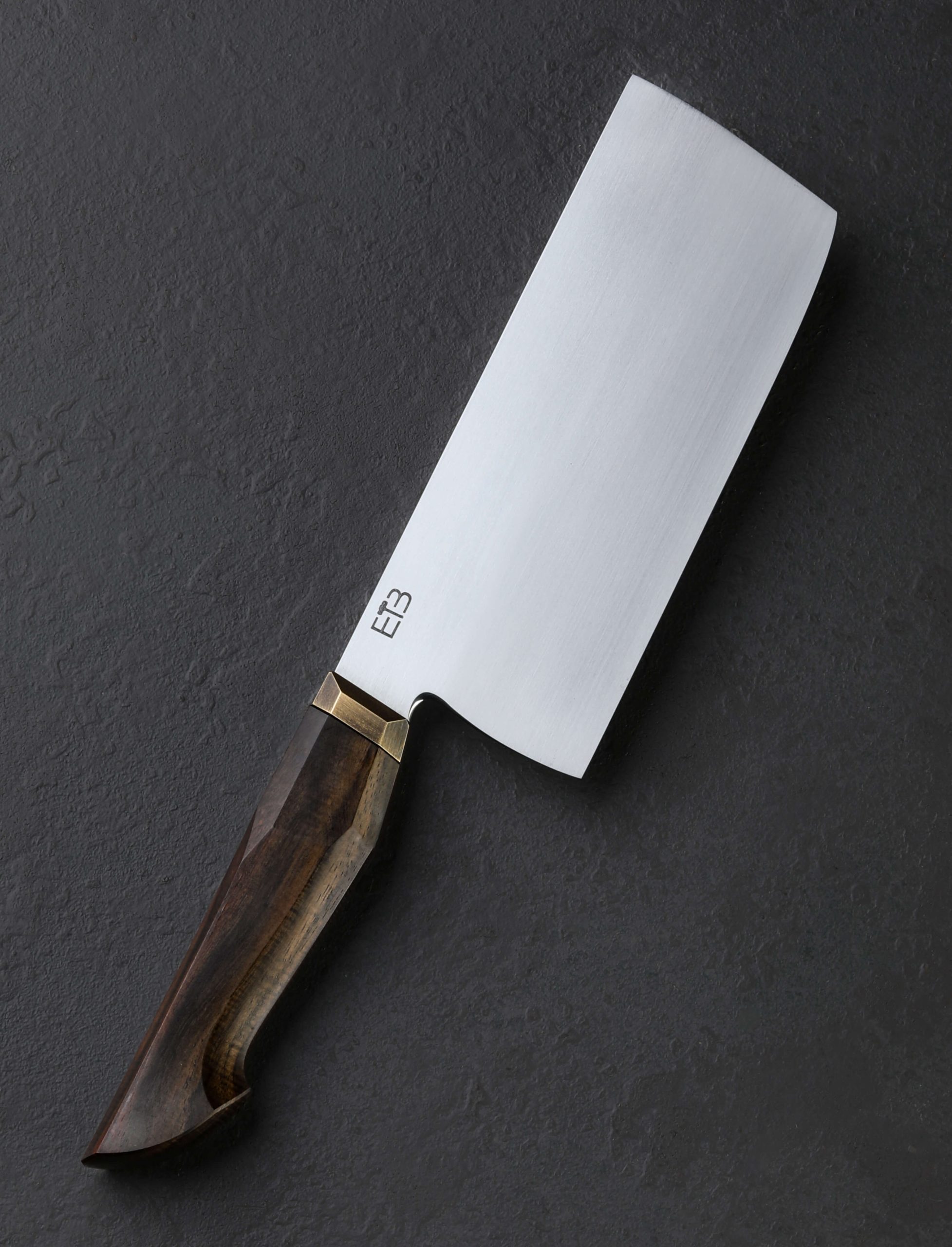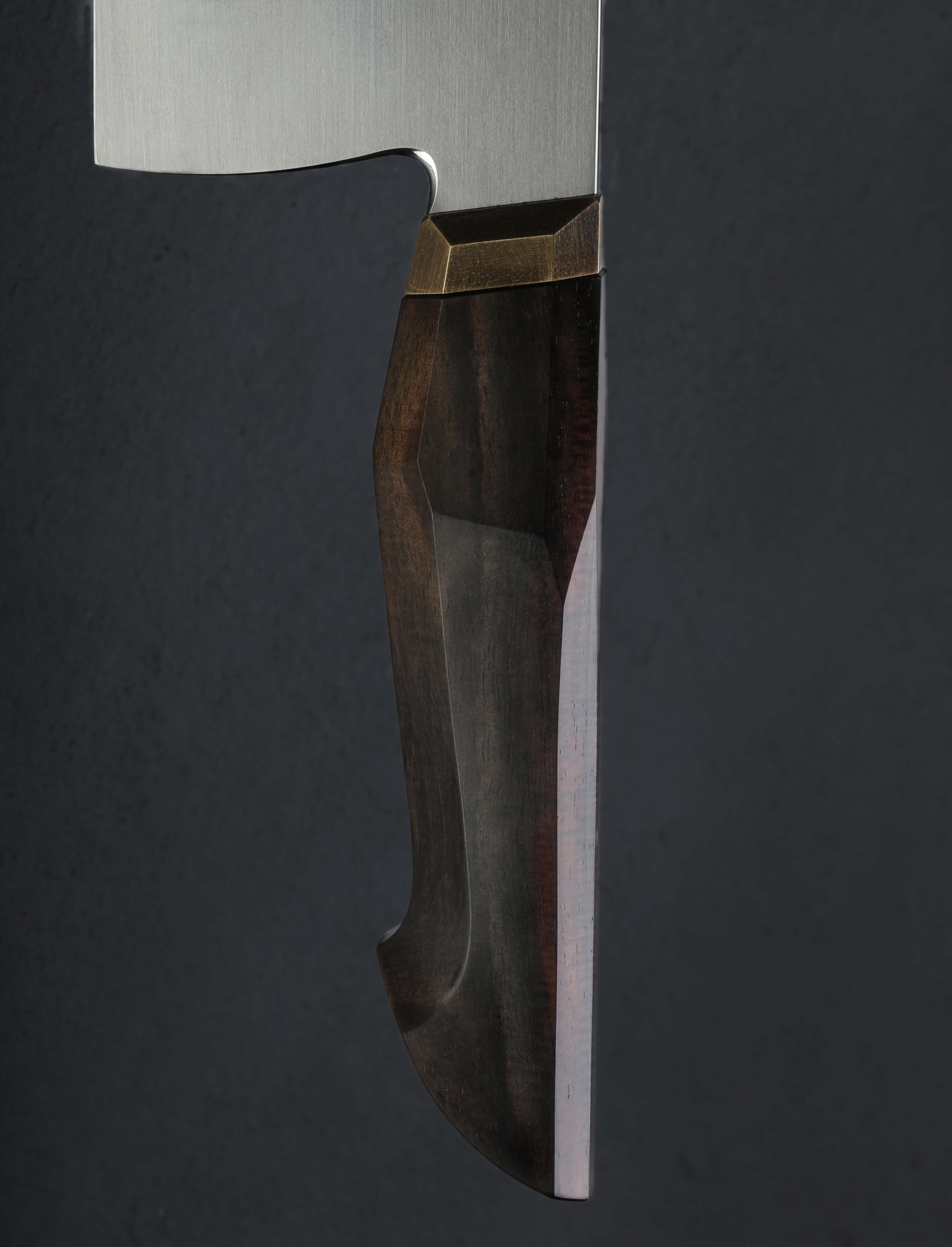 A beautifully elegant chef’s nakiri has arrived from Tasmania. Crafted by bladesmith Jason Ellard, the satin-finished 52100 carbon steel is shaped to move through vegetables with ease. Tall, superb convex bevel geometry slims downward to a very thin, hard, and razor-sharp edge that extends 148mm / 6.8″ outward from the 63mm-tall heel. Rounded and polished each, the choil and blade spine are comfortable in the pinch grip and present a wonderful aesthetic contrast to the neighboring surfaces. Balancing just over an inch in front of the handle, this push-pull chopper is weighted so as to allow the blade’s mass to its share of the work in the chef’s hand. That lucky hand which operates this one-of-a-kind culinary tool will wrap its fingers around a sculpted piece of Honduran Rosewood which the artist has selected for its striking color and natural grain. A combination of flat facets and voluptuous curves form an ergonomic, Western-style grip as comfortable as it is easy on the eyes. Completing the build is an stepped-down, heirloom-fit antiqued brass bolster capping the rosewood.