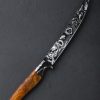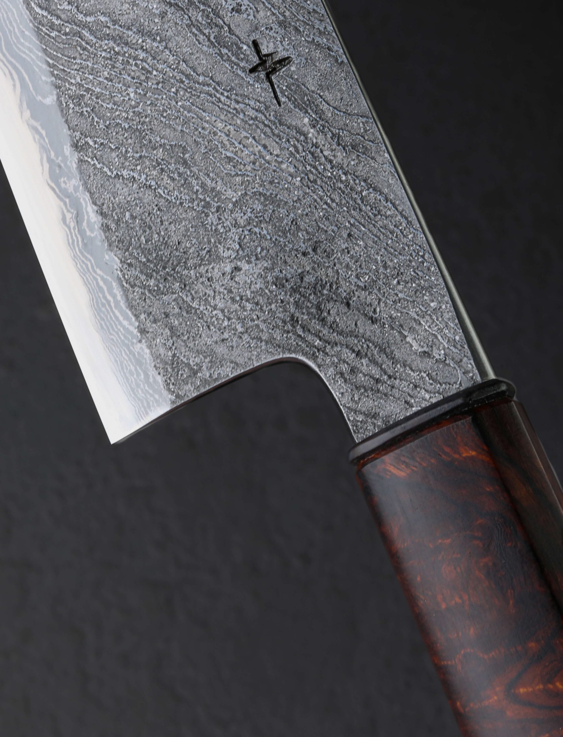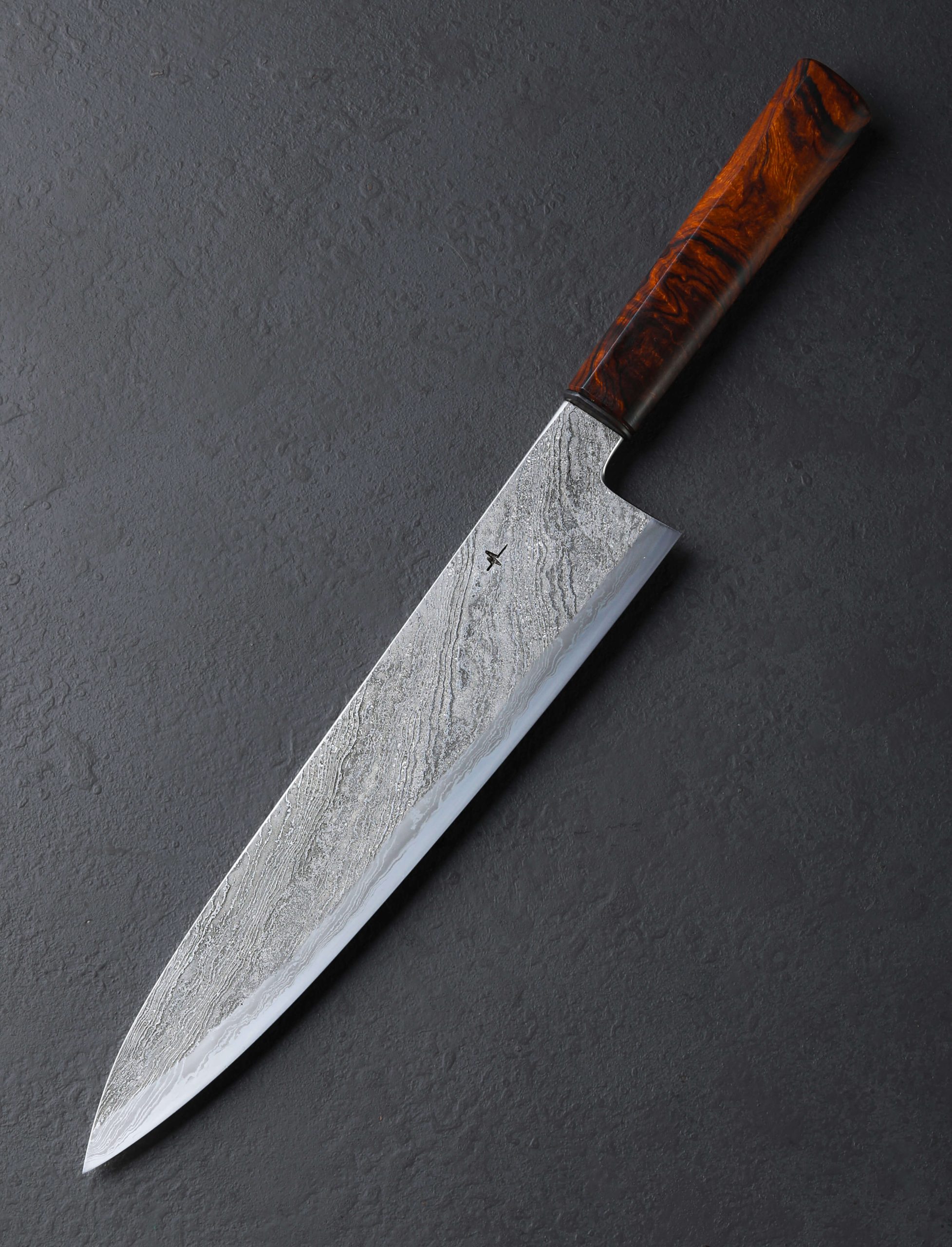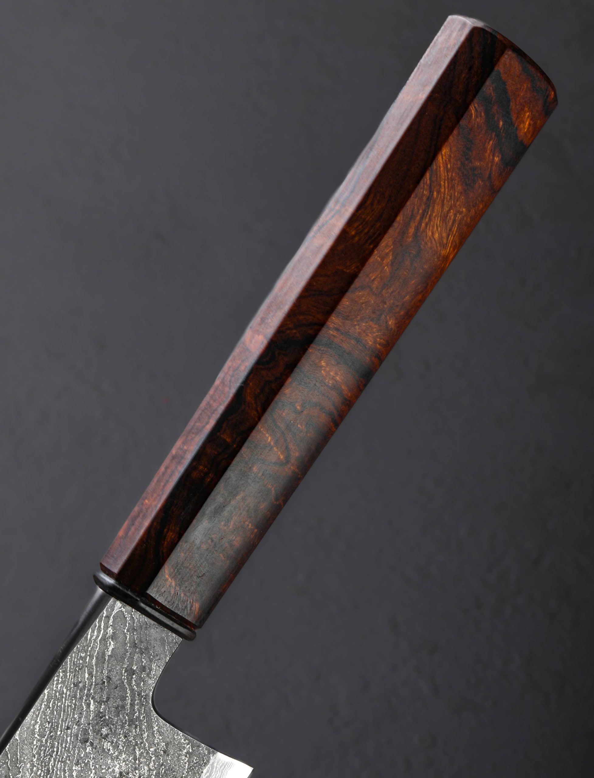 Polished by hand using Japanese natural stone from Nakayama, the highest grade finishing stone available, are exquisite primary blade bevels that slim downward to a razor-sharp, thin, and hard edge shaped for cutting performance of the highest caliber. By bladesmith Milan Gravier, the one-of-a-kind Ironwood Twist Gyuto is the kind of knife chef’s dream about the world over. Crafted at his studio in the south of France, Milan forges the blade from a house-made san mai formula that sees twisted damascus cladding atop a core of the 135Cr3 high-carbon steel which forms the 261mm / 10.3″ cutting edge. A deep etch followed by additional hand polishing gives the blade’s flats an exquisite, low-contrast finish with highlights that shine brightly as light reflects off the nickel-rich components. Balancing less than one inch in front of the 53mm-tall heel, this large chef’s tool moves nimbly and naturally in the hand, its 8.4oz / 237g overall weight distributed wonderfully. The rounded blade spine’s full-distal taper produces a versatile and hardworking finished product that is tough and durable in the rear, and becoming progressively slimmer toward the glass-thin tip. A touch of lateral flexibility is present in the forward half. To wield the work of culinary art with comfort and control is a shield profile wa-style handle sculpted from a head-turning piece of ironwood burl and fitted with a darkened, beveled stainless steel ferrule.