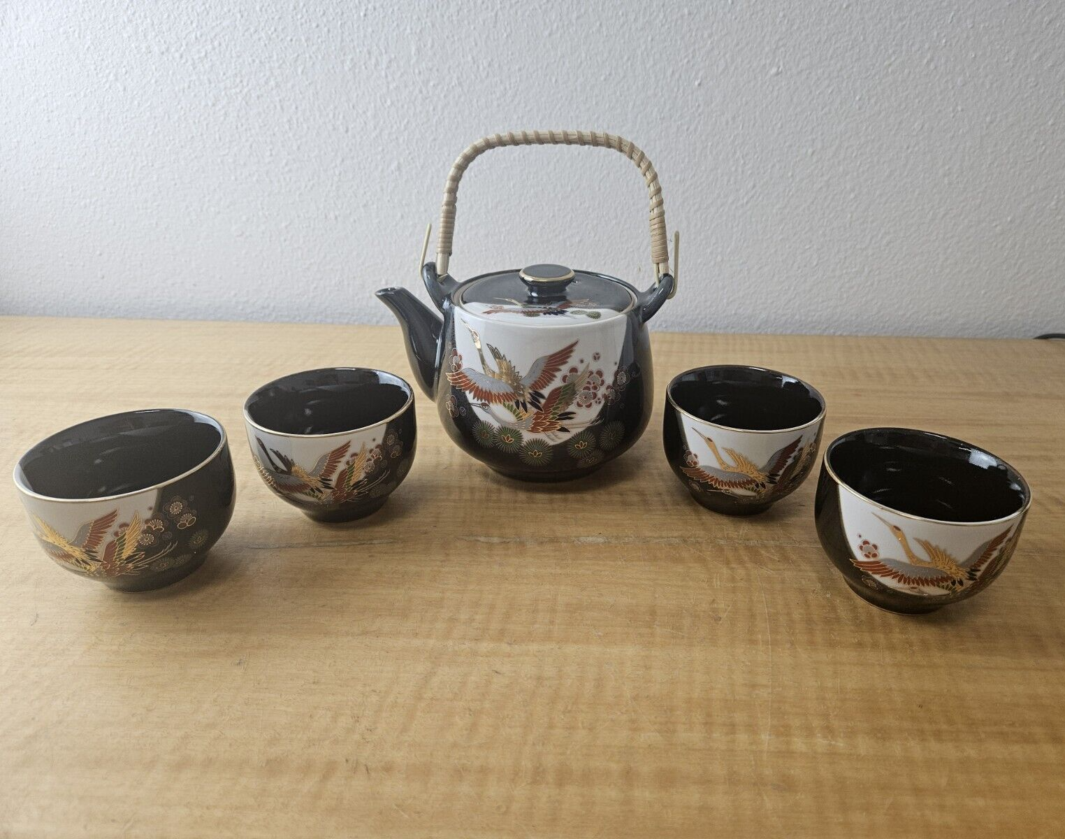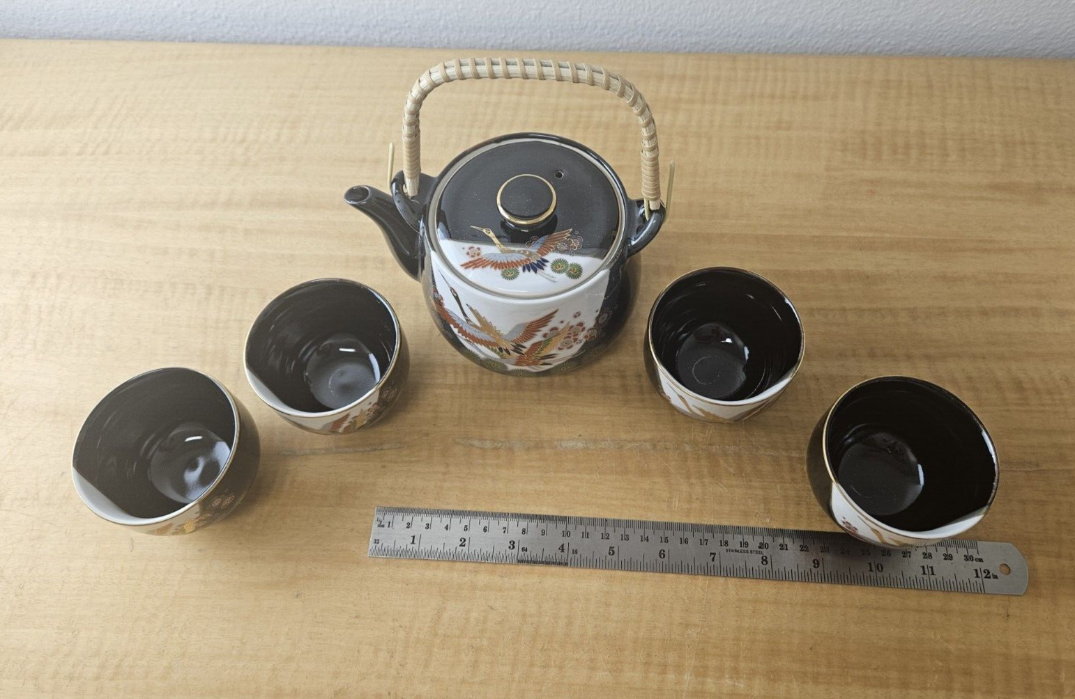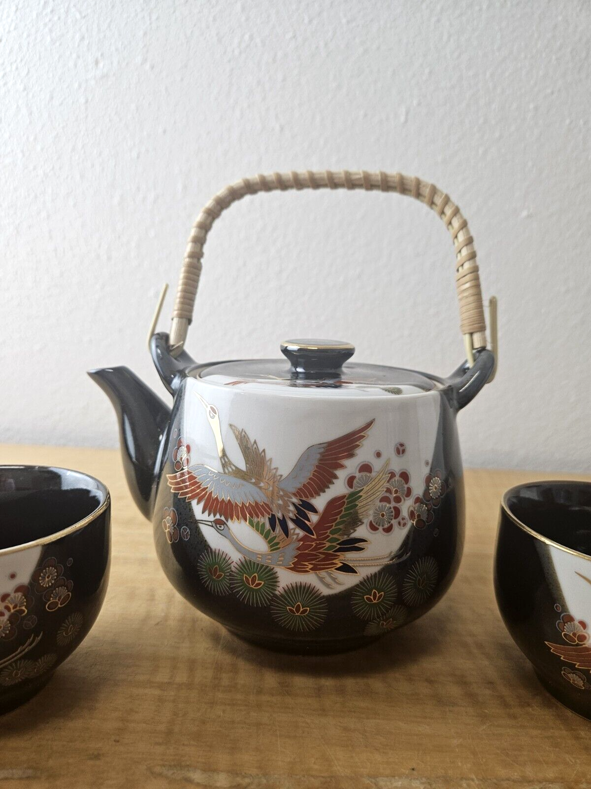 JAPAN PORCELIAN TEA POT CUP SET BLACK with Gold trim and accents