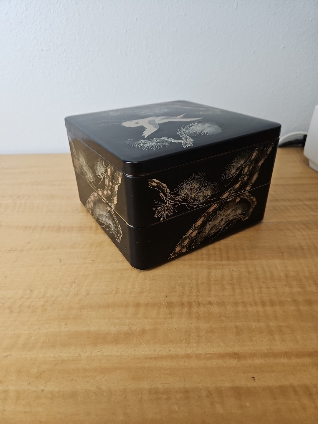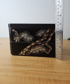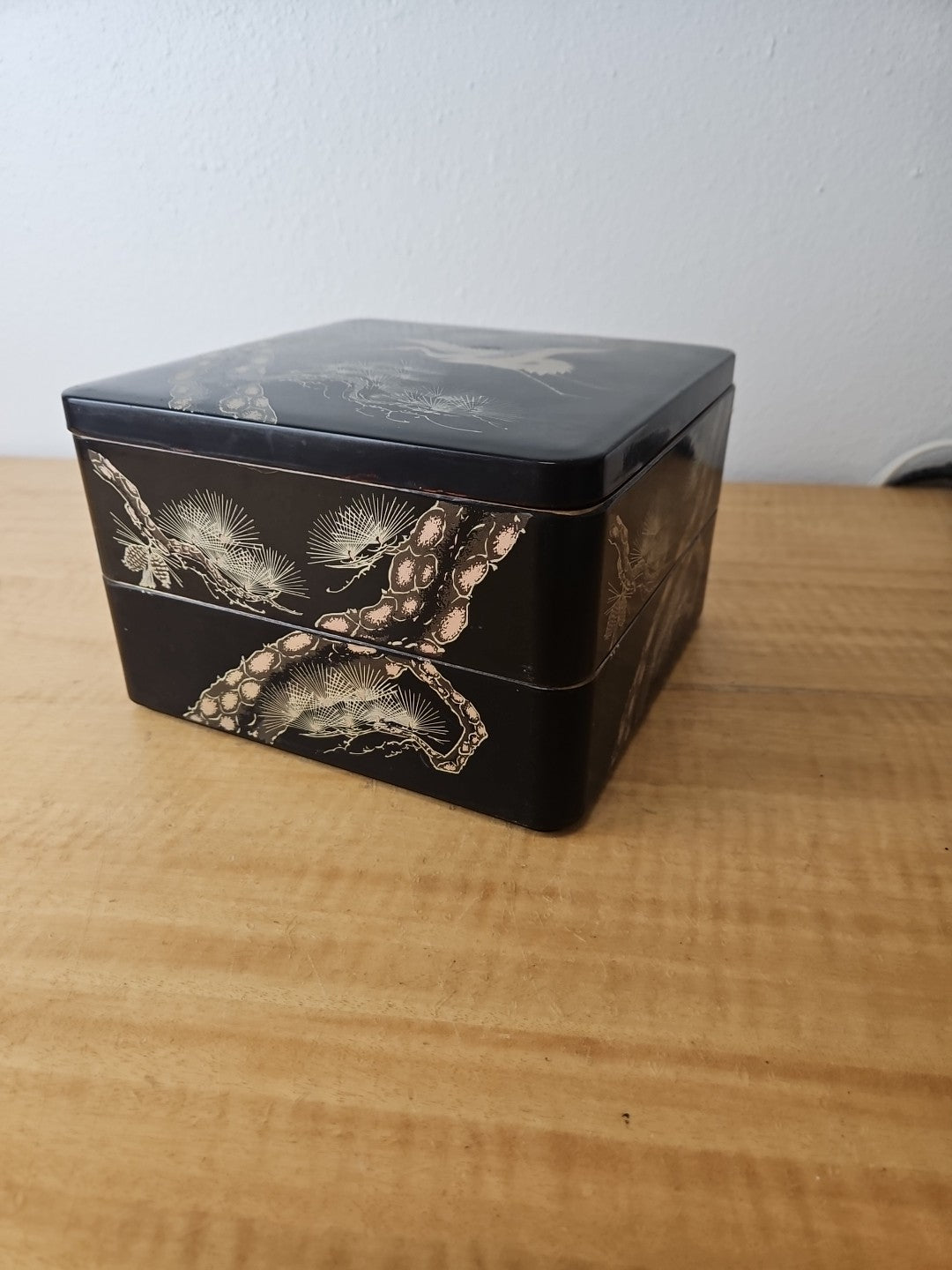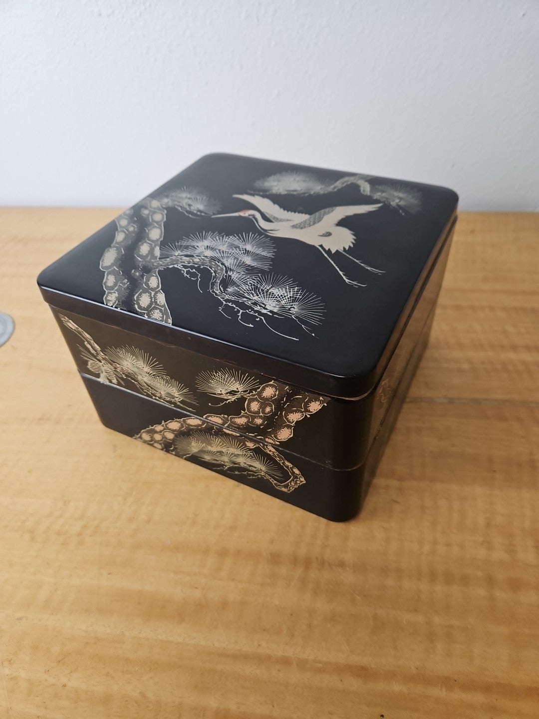 Japanese Retro Lacquerware Two-Tiered Jubako Box Pine Crane Design Vintage