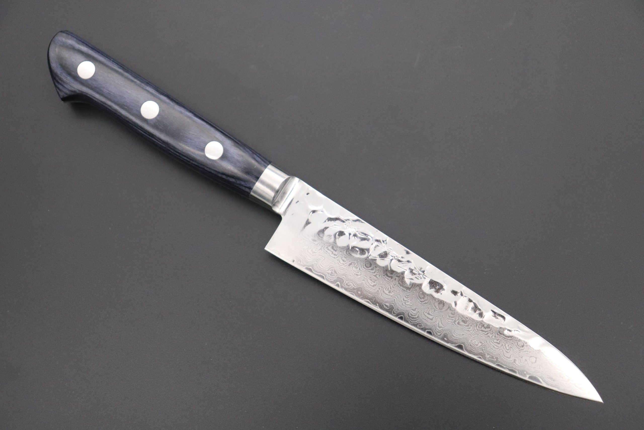 “Gekko Blue Petty 135mm” Rare, Unique and the Sophisticated Royal Blue-Purple Pakka Wood Handle Scales provide an impressive and stylish accent to the beautiful Damascus blade. Pakka Wood is strong, durable and resists both water and shrinkage.
