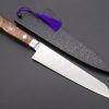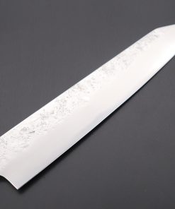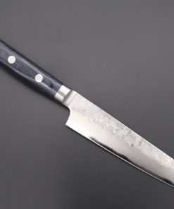 The blade core is made from Japan’s premium high carbon steel, Hitachi Aogami Super (“Blue Super Steel”. HRc. 63 to 64) and it is sandwiched between two layers of soft, corrosion-resistant stainless steel. These knives should not require a lot of maintenance, but the exposed blade core can discolor or rust if it is exposed to acid, salt or water for an extended period of time.Aogami Super (“Super Blue Steel”) is a premier-quality Japanese Hagane (Blade edge steel) and it has a rich chemical composition, Including high quantities of Carbon (1.40 to 1.50), a little Chromium (0.30 to 0.50) and Tungsten (2.00 to 2.50). When it is properly forged and heat treated, this chemistry enables the steel to provide exceptional edge retention and edge stability.