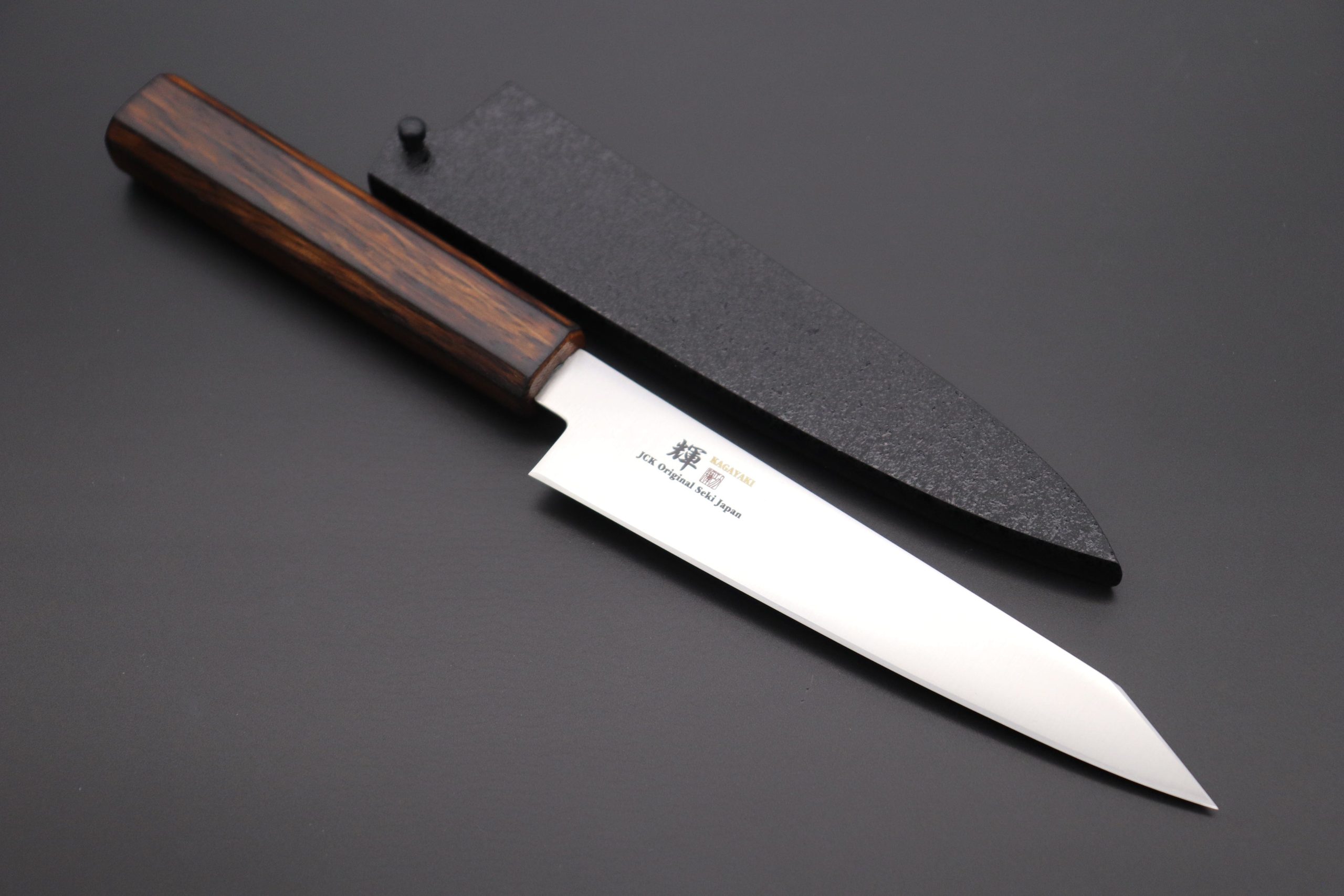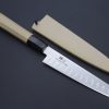 The Kagayaki VG-10 Kiritsuke Petty Knife comes with a natural Oak Wood Octagonal Handle that provides a comfortable grip. For safekeeping, this knife comes with a matching Black Lacquered Wood Saya (Sheath) and a black pakkawood Saya pin.