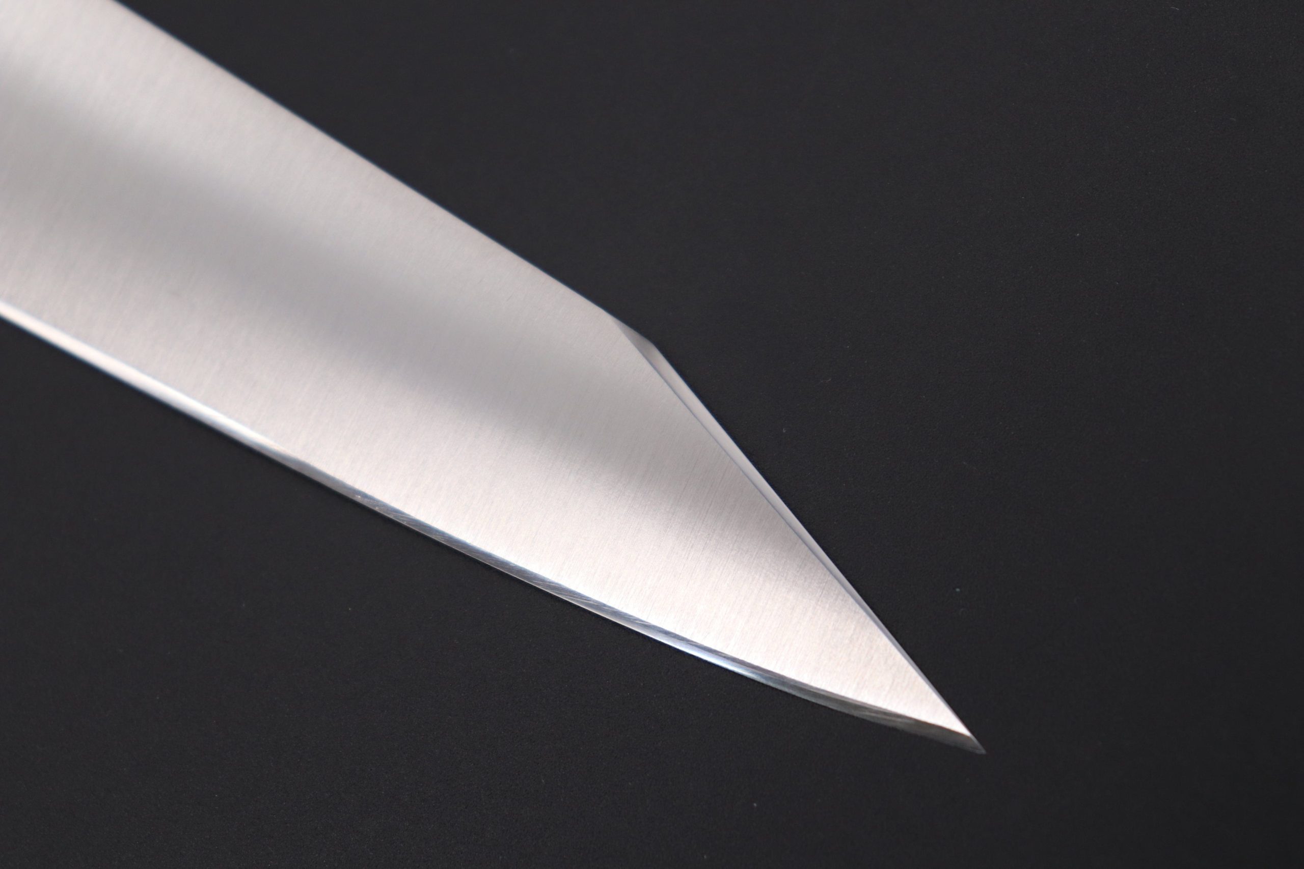 The Kirisuke-Sujihiki has a very similar blade profile to the ‘regular’ Sujihiki, but it has what is commonly known as a ‘reverse tanto’ tip, or ‘clipped point’, which is very useful for precision cutting. Apart from this difference, the Kirisuke-Sujihiki functions in the same way as the ‘plain’ Sujihiki knife.