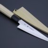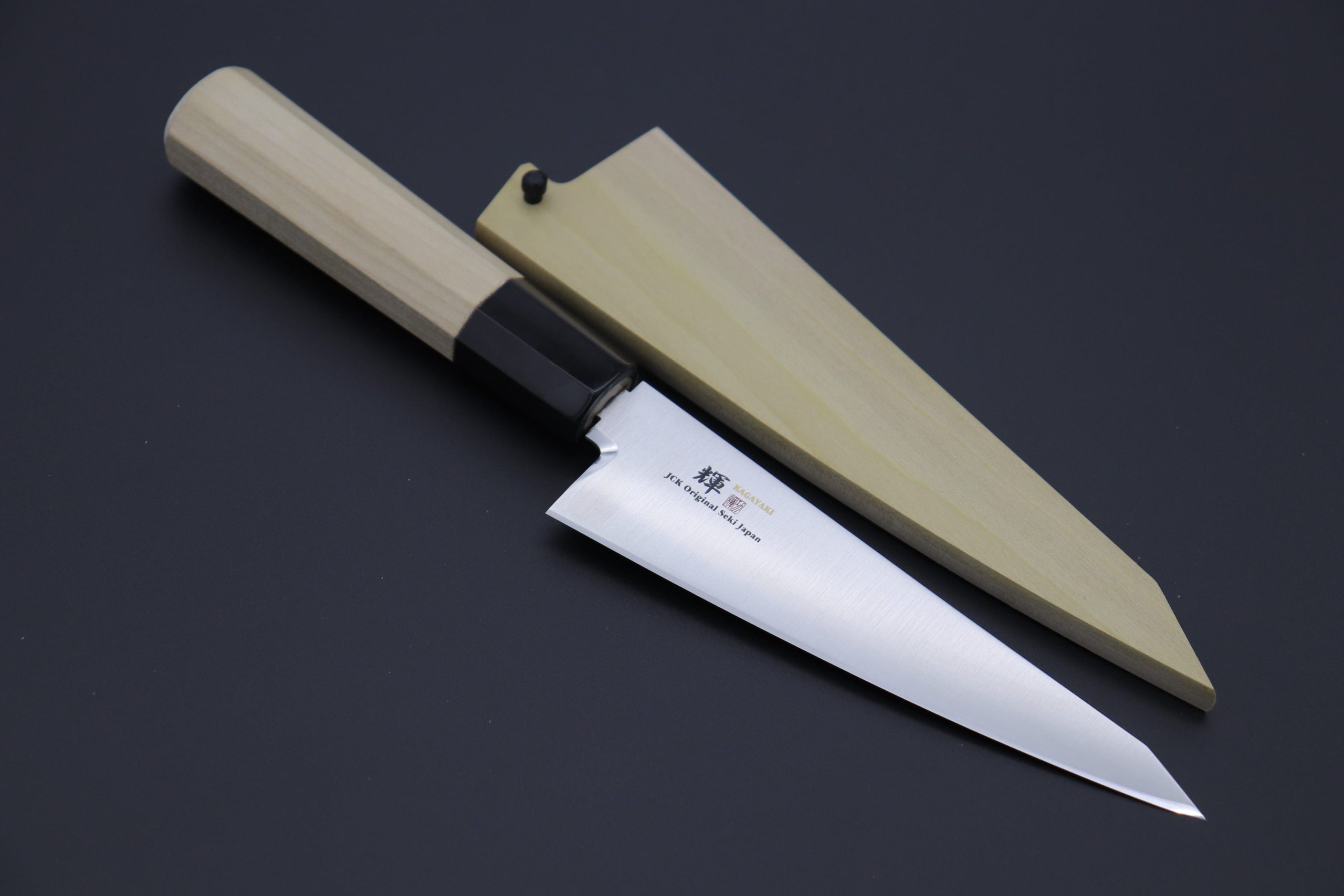 Kagayaki VG-10 Wa Honesuki comes with comfortable grip of Octagonal Magnolia Wood Handle with Water Buffalo Horn Ferrules. For safekeeping, this knife comes with a matching magnolia wood Saya (Sheath) with a black pakkawood Saya pin.