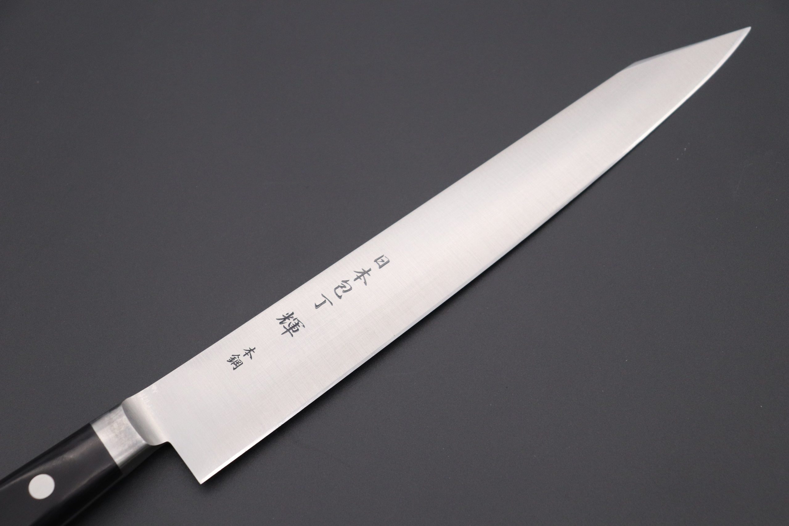 The Kirisuke-Sujihiki has a very similar blade profile to the ‘regular’ Sujihiki, but it has what is commonly known as a ‘reverse tanto’ tip, or ‘clipped point’, which is very useful for precision cutting. Apart from this difference, the Kirisuke-Sujihiki functions in the same way as the ‘plain’ Sujihiki knife.