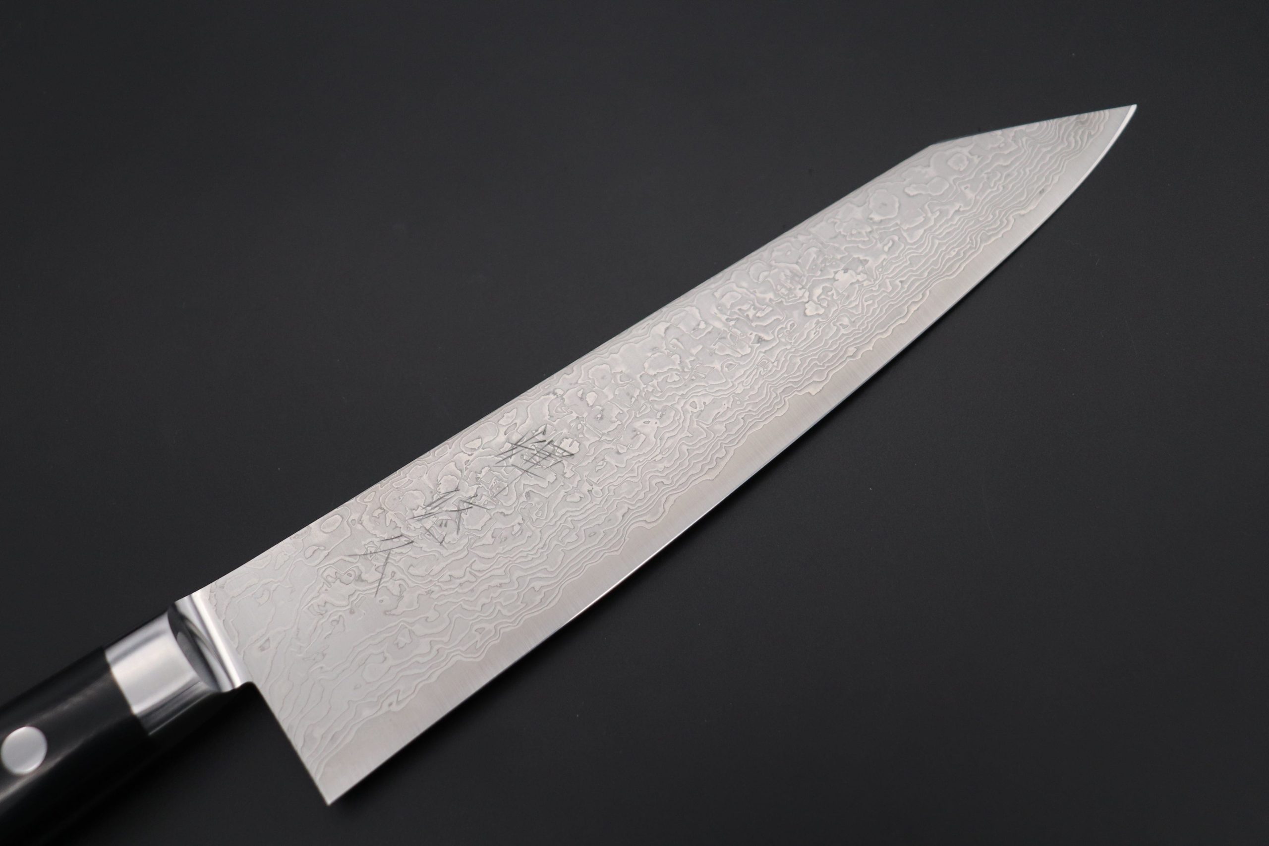 For the core steel of this Damascus knife, Master Craftsman Mr. Gotou selected a special Powdered Metallurgy High Speed Tool Steel called “R-2”, which he heat-treats to HRc. 63. R-2 is made by a highly reputable Japanese company called Kobelco, and the steel offers remarkable cutting performance and edge retention. The two outer layers of the blade are made from a unique and elegantly patterned Damascus steel, which is comprised of alternating layers of white-colored nickel steel and sparkling mirror polished layers of steel.