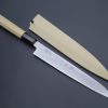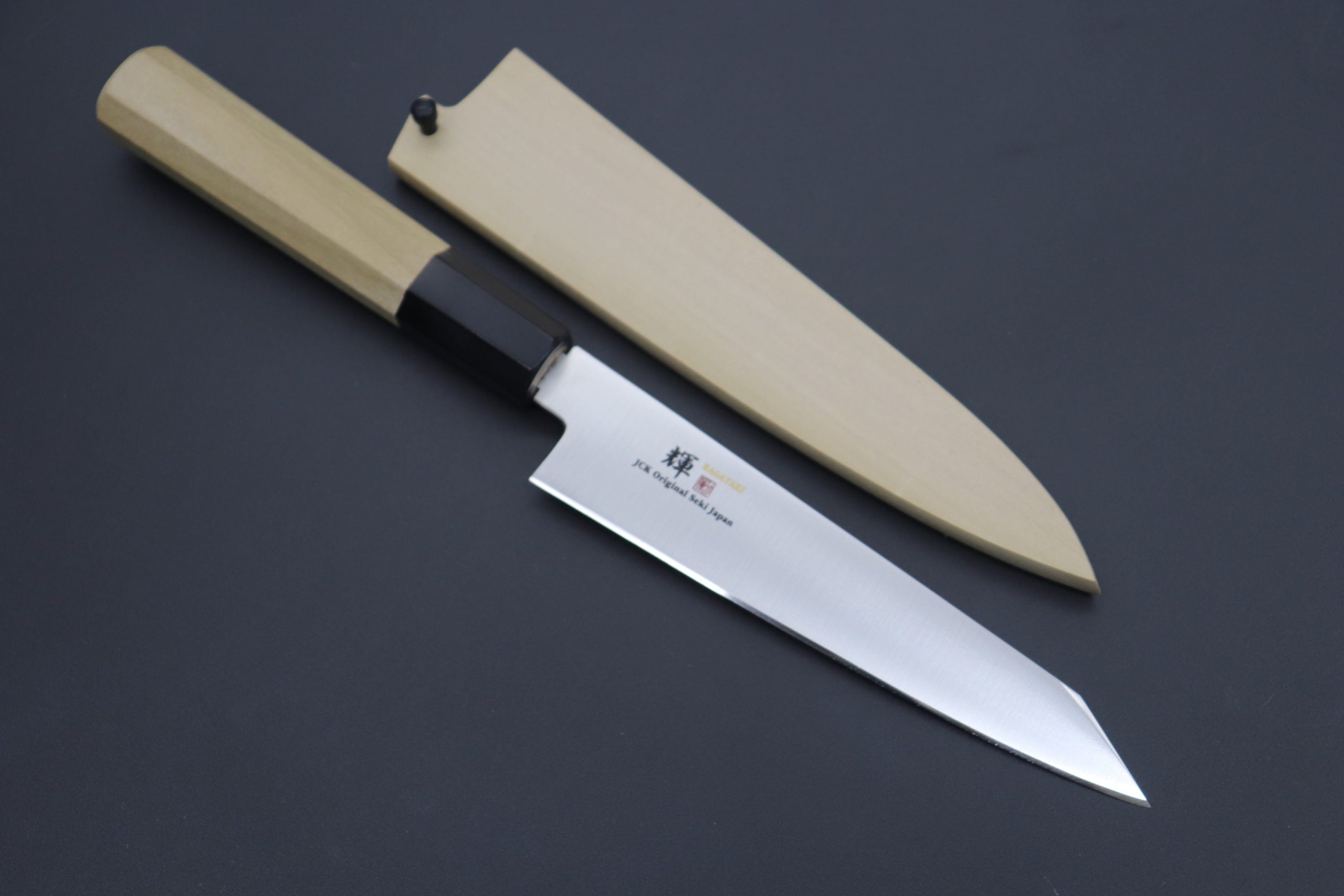 Kagayaki VG-10 Kiritsuke Petty comes with comfortable grip of Octagon Shape Magnolia Wooden Handle with Water Buffalo Horn Ferrules. For safekeeping, this knife comes with a matching magnolia wood Saya (Sheath) and a black pakkawood Saya pin.