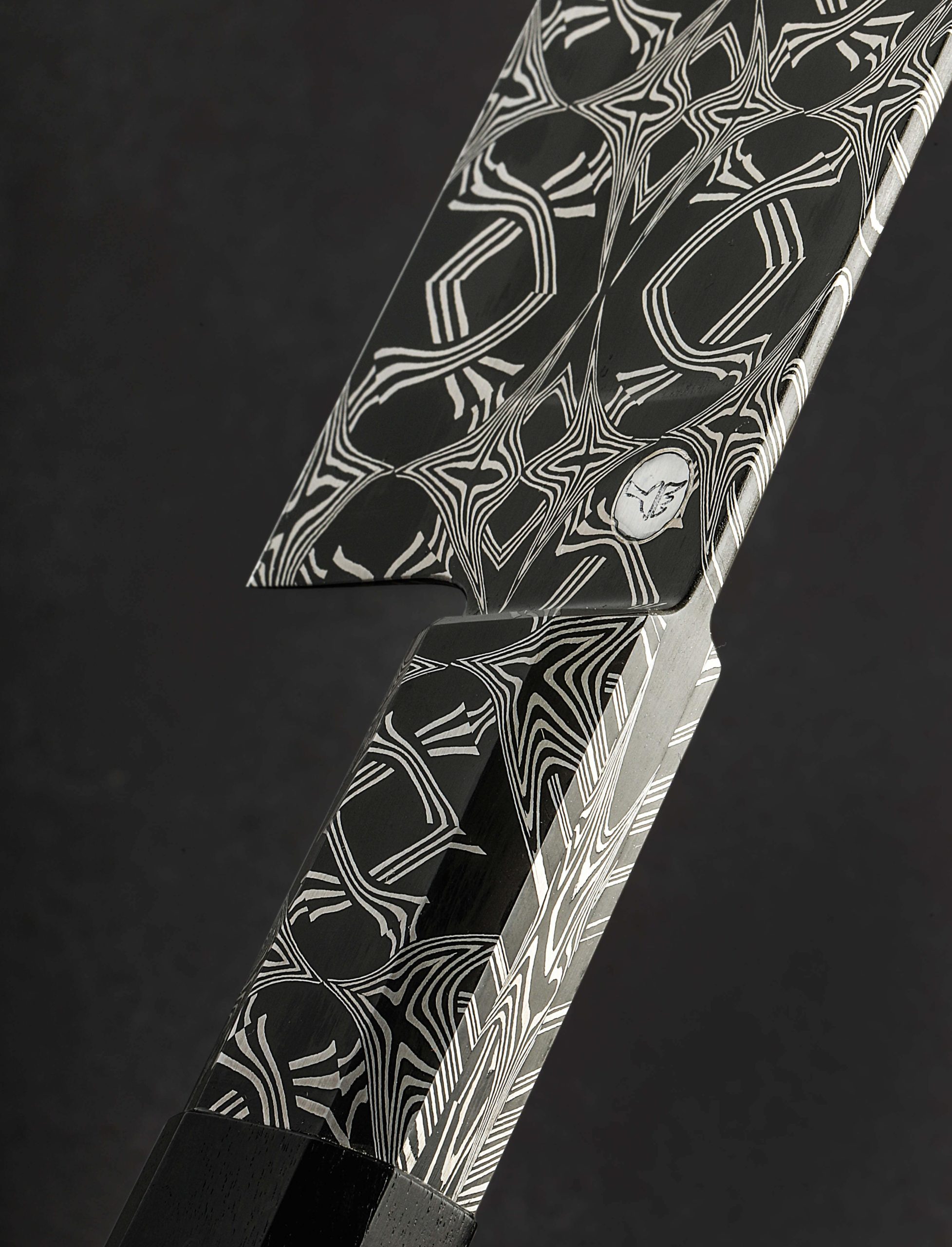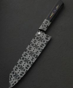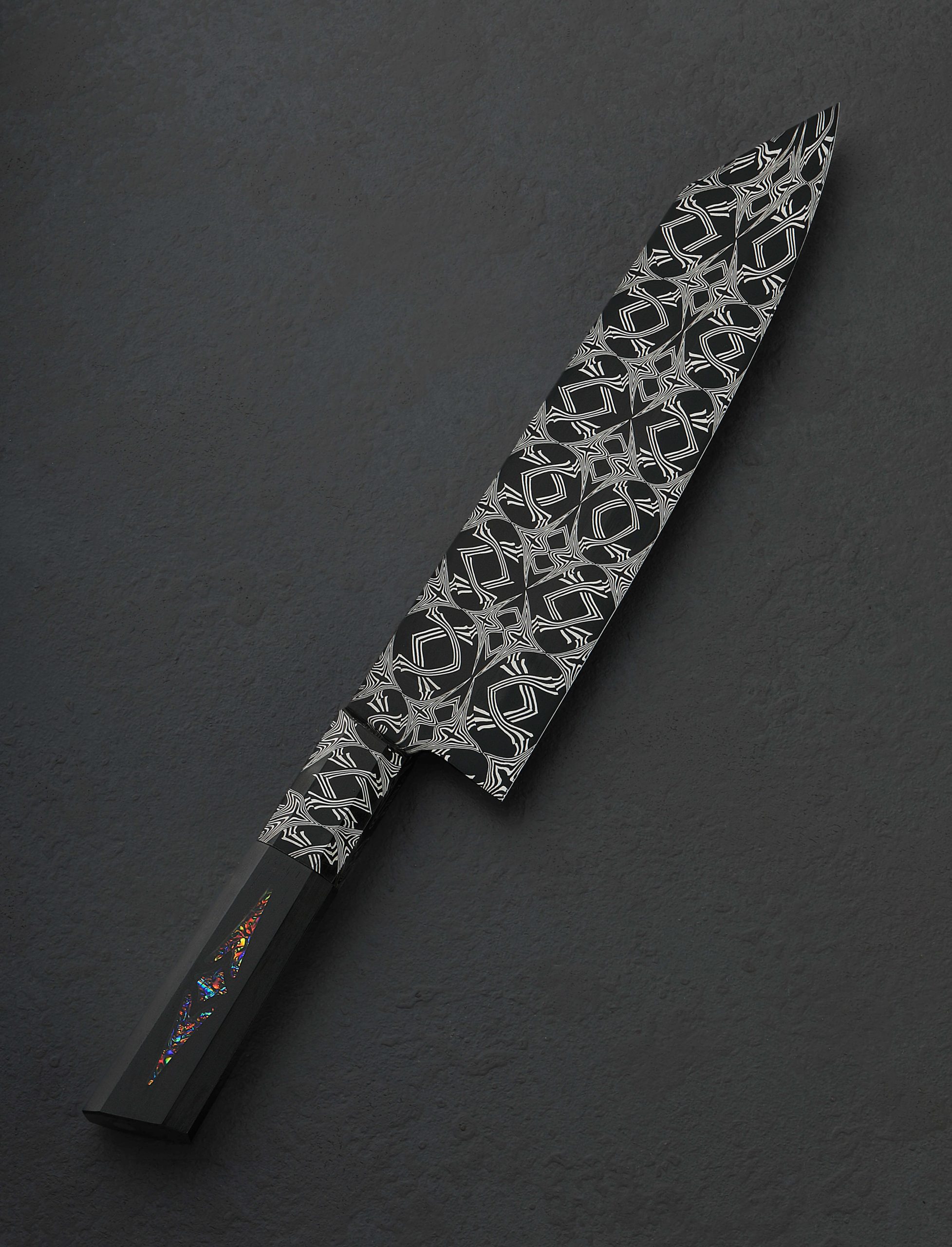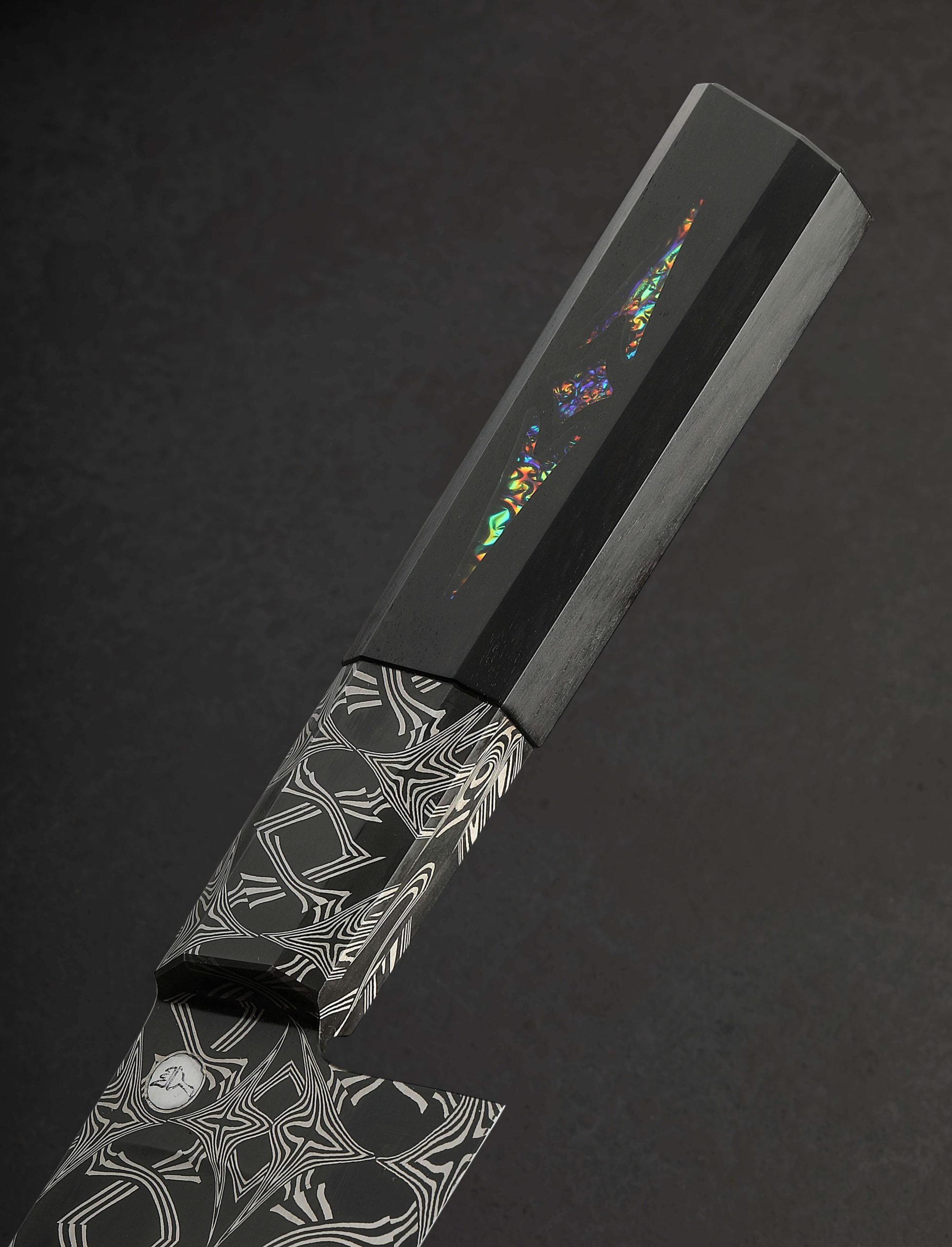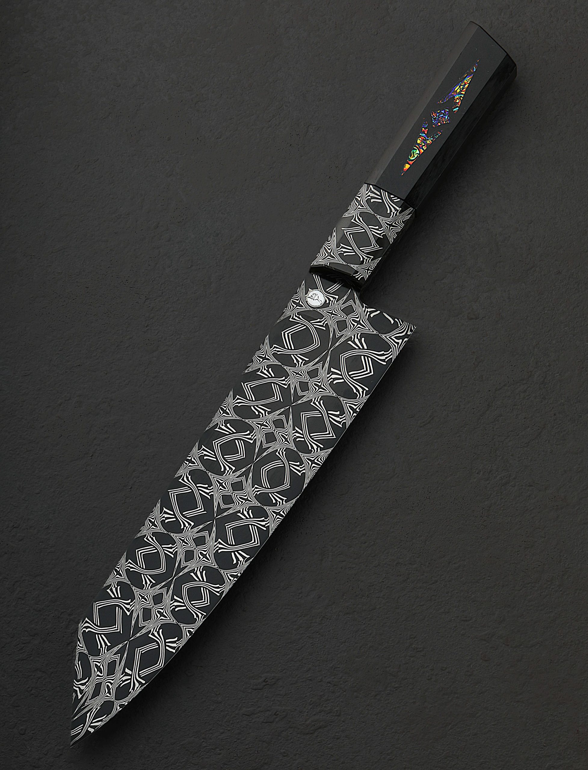 ‘Made up of a complex mix of elements’ is Oxford’s definition of the word Kaleidoscopic. This mosaic damascus Salem Straub Chef Knife is our definition. A dark, deep etch of the contrasting carbon steel alloys reveals Salem’s latest house-made pattern in beautiful detail, the symmetrical, twisting, and turning elements coming to life on a culinary canvas that stretches 234mm / 9.2″ and stands 52mm tall at the heel. The head-turning metallic aesthetic is second only to the performance-driven geometry that delivers compound ‘S-grind’ bevels above a razor-sharp edge designed for all manner of daily meal prep. For comfort and control, complementing the forged integral bolster that boasts the same damascus pattern as the blade is a handle completed with a piece of carbon fiber inlaid with the multi-color [kaleidoscopic] creation that is Dychrolam, a material described by its maker as ‘viewer interactive.’ Salem, we would call this entire work of functional art nothing short of viewer interactive.