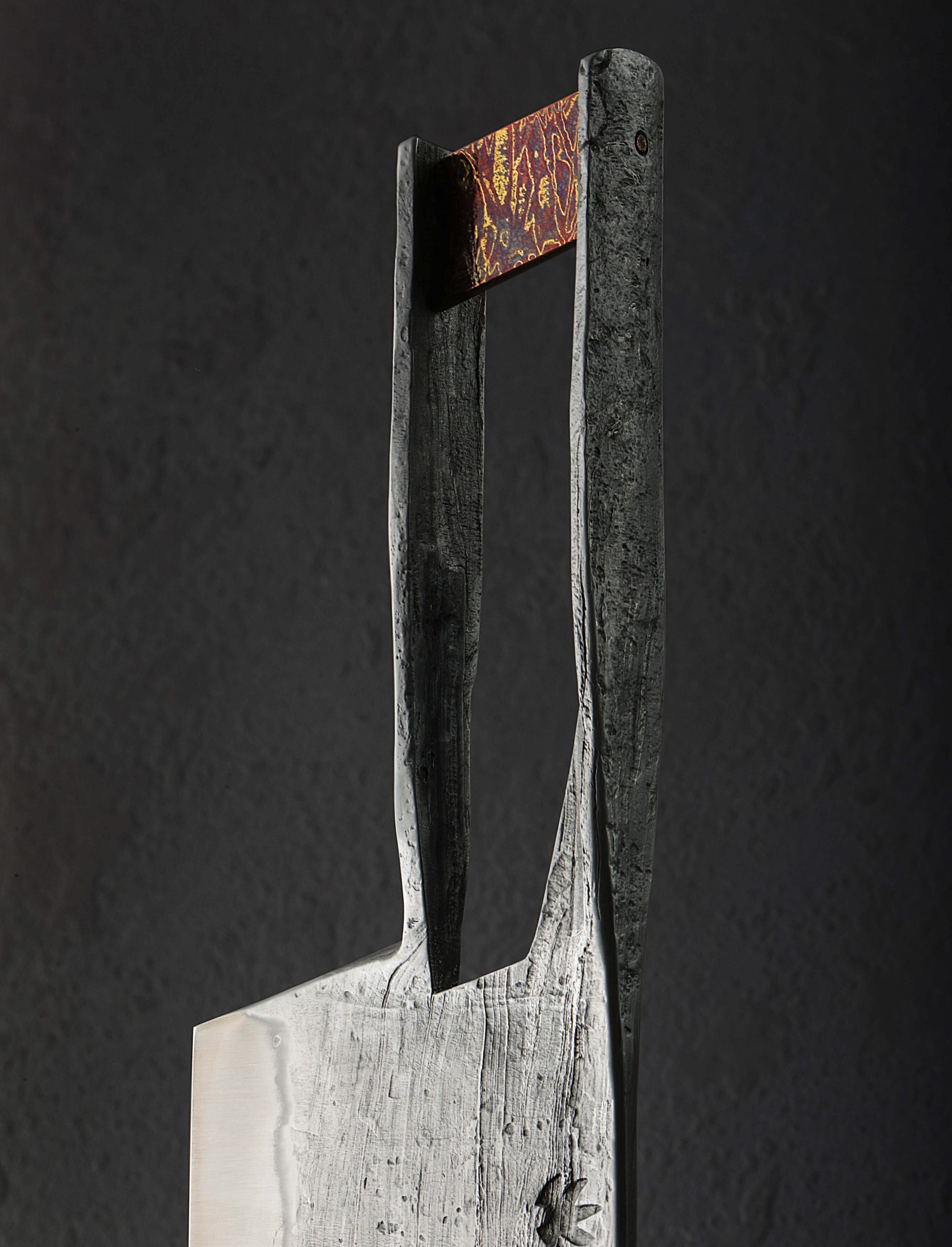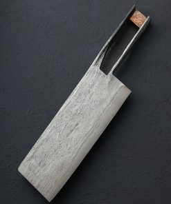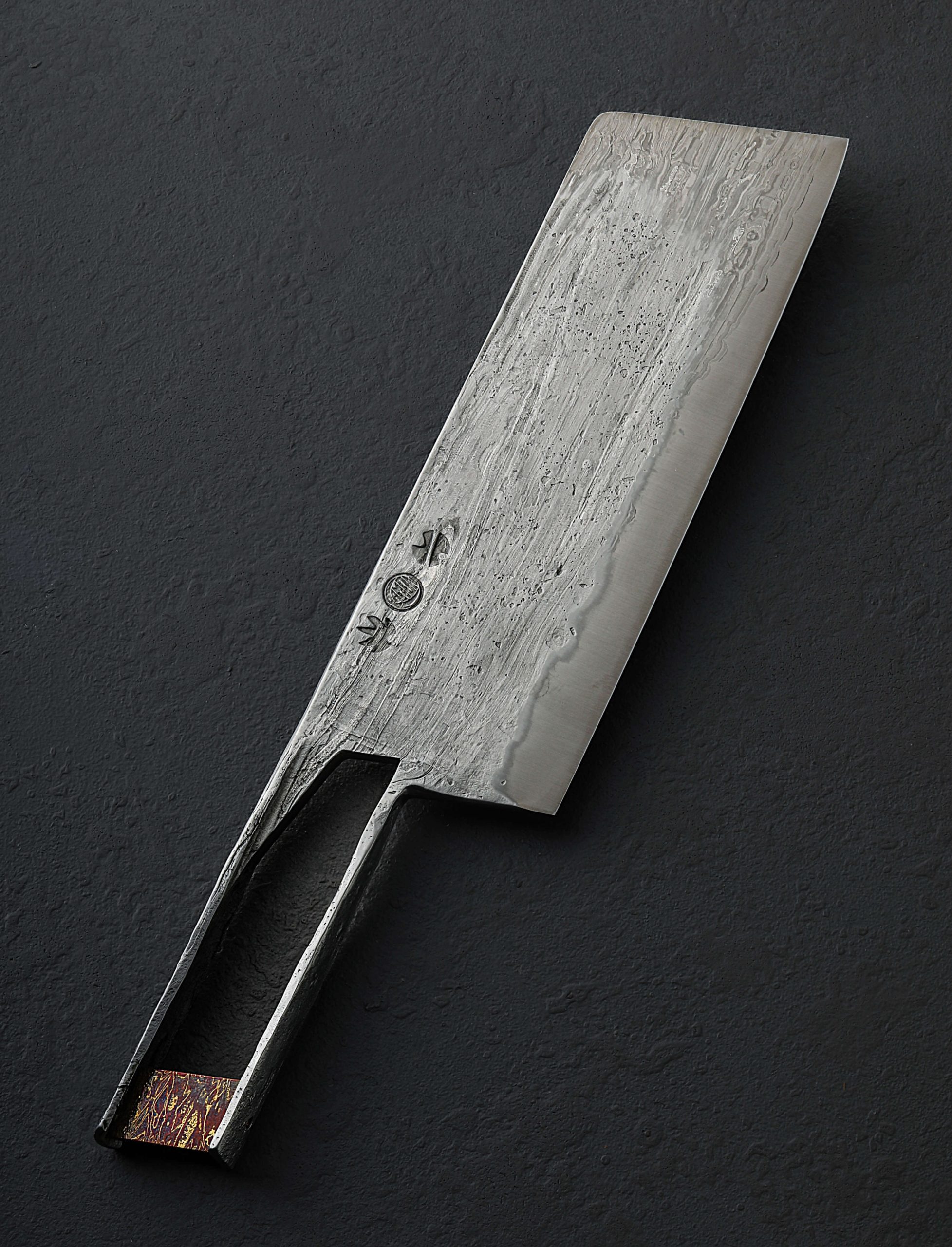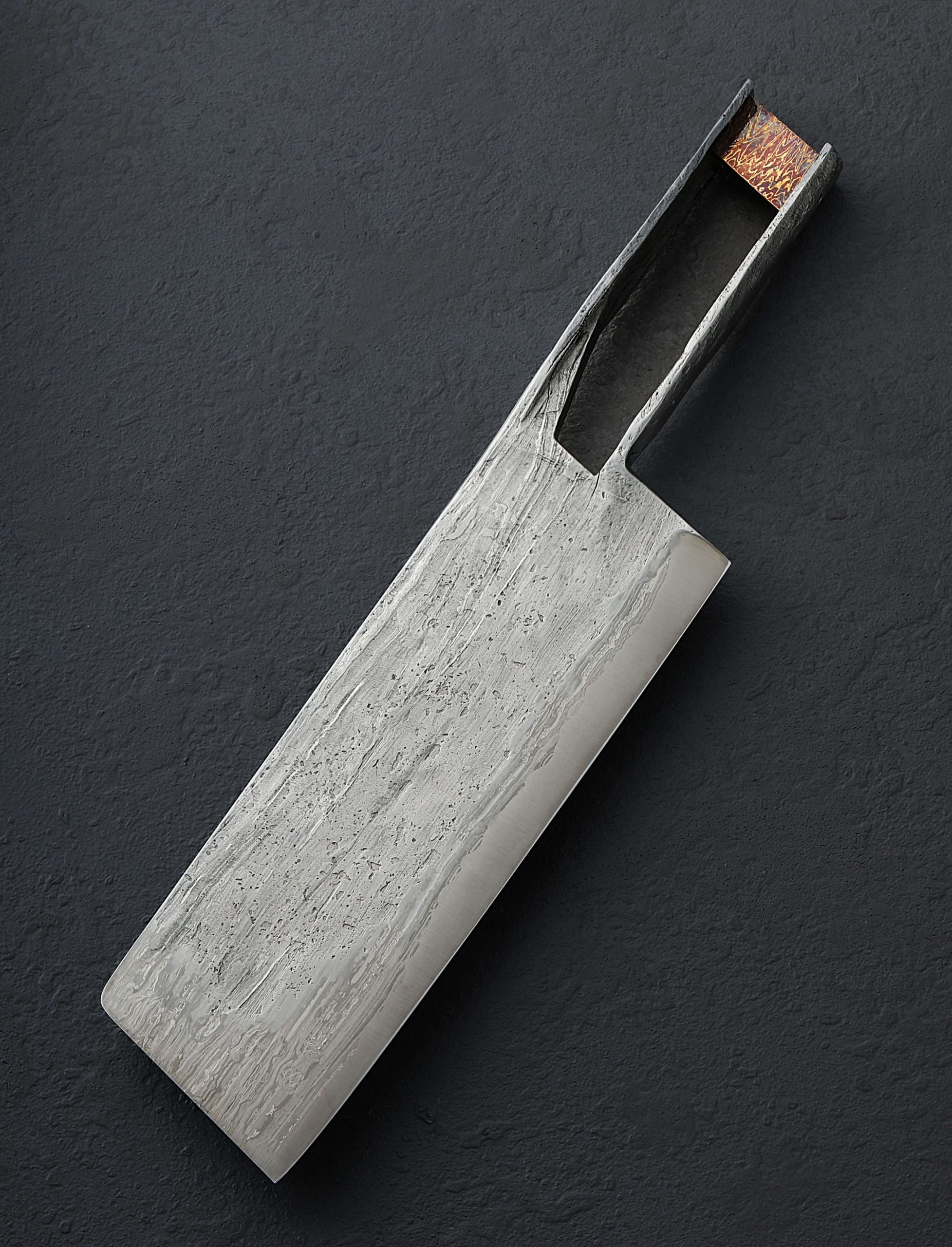Another collaboration piece for the books comes to us by way of Austria’s Benjamin Kamon and Rhode Island’s Joshua Prince. Long before Benjamin set out to forge the exquisite nakiri profile, monolithic construction chef knife from a single piece of steel, Joshua was hard at work preparing the ingredients. At the time, this was unbeknownst to Joshua. Those ingredients are, in fact, ‘end cuts,’ in other words, small pieces of various damascus and mosaic damascus patterns that went unused in previous projects. The extraordinary damascus artist that he is, Joshua knew the time would come to use these surplus pieces of pattern-welded steel, and the opportunity to collaborate with the talented Mr. Kamon (again) presented the perfect opportunity. Joshua carefully compiled a collection of said unused blade steels and proceeded to forge them together. To complete the process he created an opposing-twist pattern mosaic made up of the previously separate elements, producing an all new material: 7-year Damascus. Finally, Joshua forge-welded a 15n20 edge bar from which the final cutting edge would be shaped, and the material he would send to Benjamin was complete. Once received at his studio north of Vienna, Benjamin went to work hand-forging the one-of-a-kind knife seen here in his well-loved monolithic style, this time in a blade shape we have not seen from him. The edge is thin and sharp, bevels convex for performance, and the finish on Joshua’s 7-year Damascus is unique and mesmerizing. But he didn’t stop there. For another monolithic first, Benjamin made from raw ingredients a piece of mokume gane, a damascus-like combination of nickel and brass, which he has fit into the handle as both a structural and decorative element. With this, the Kamon x Prince 7-Year Nakiri was complete. As is customary with kitchen cutlery from Ben’s studio, a custom saya is included.