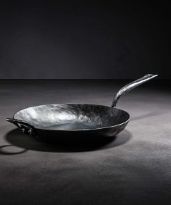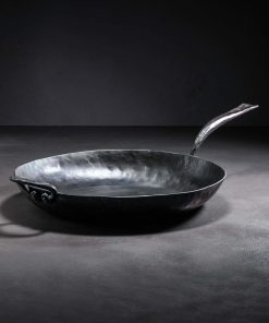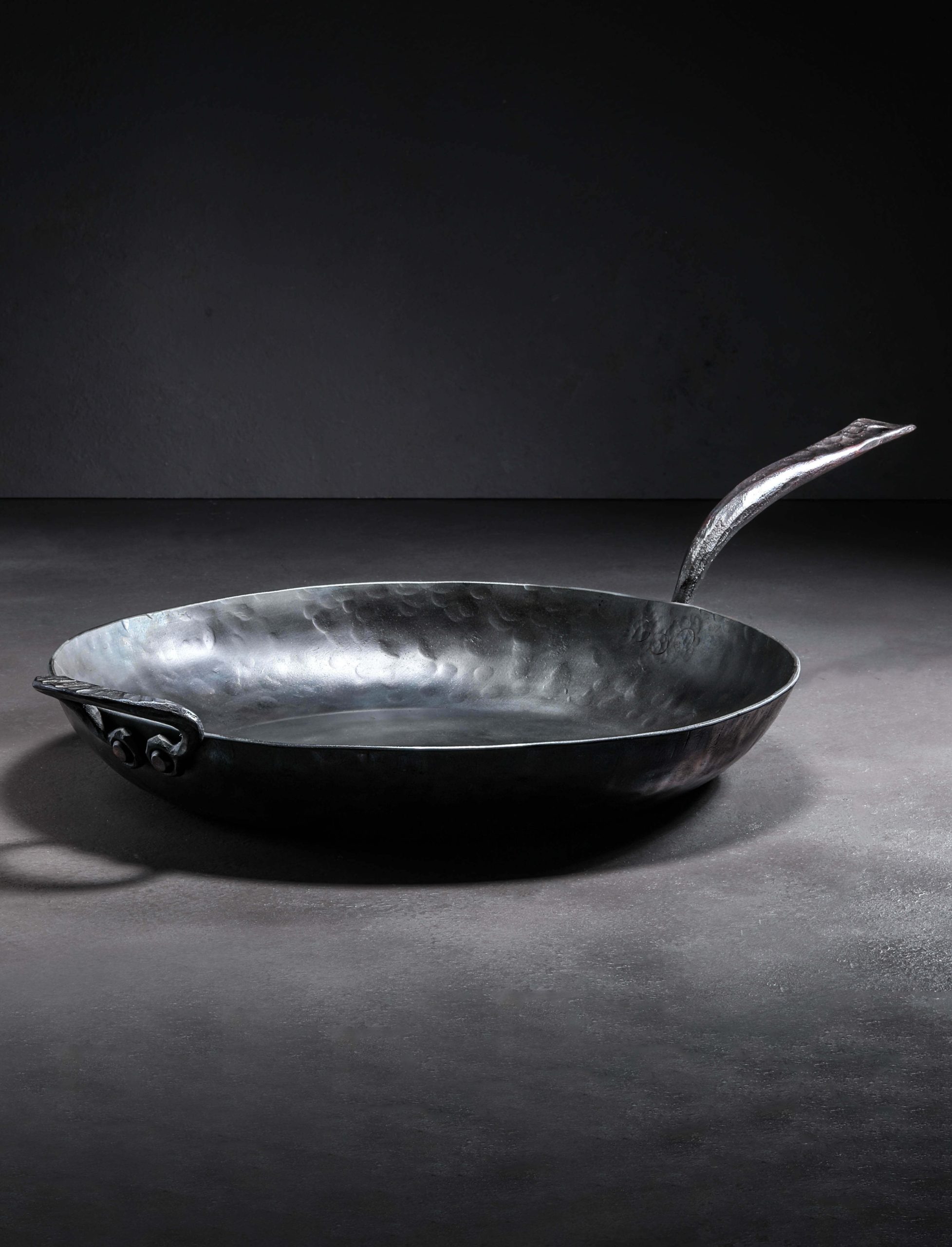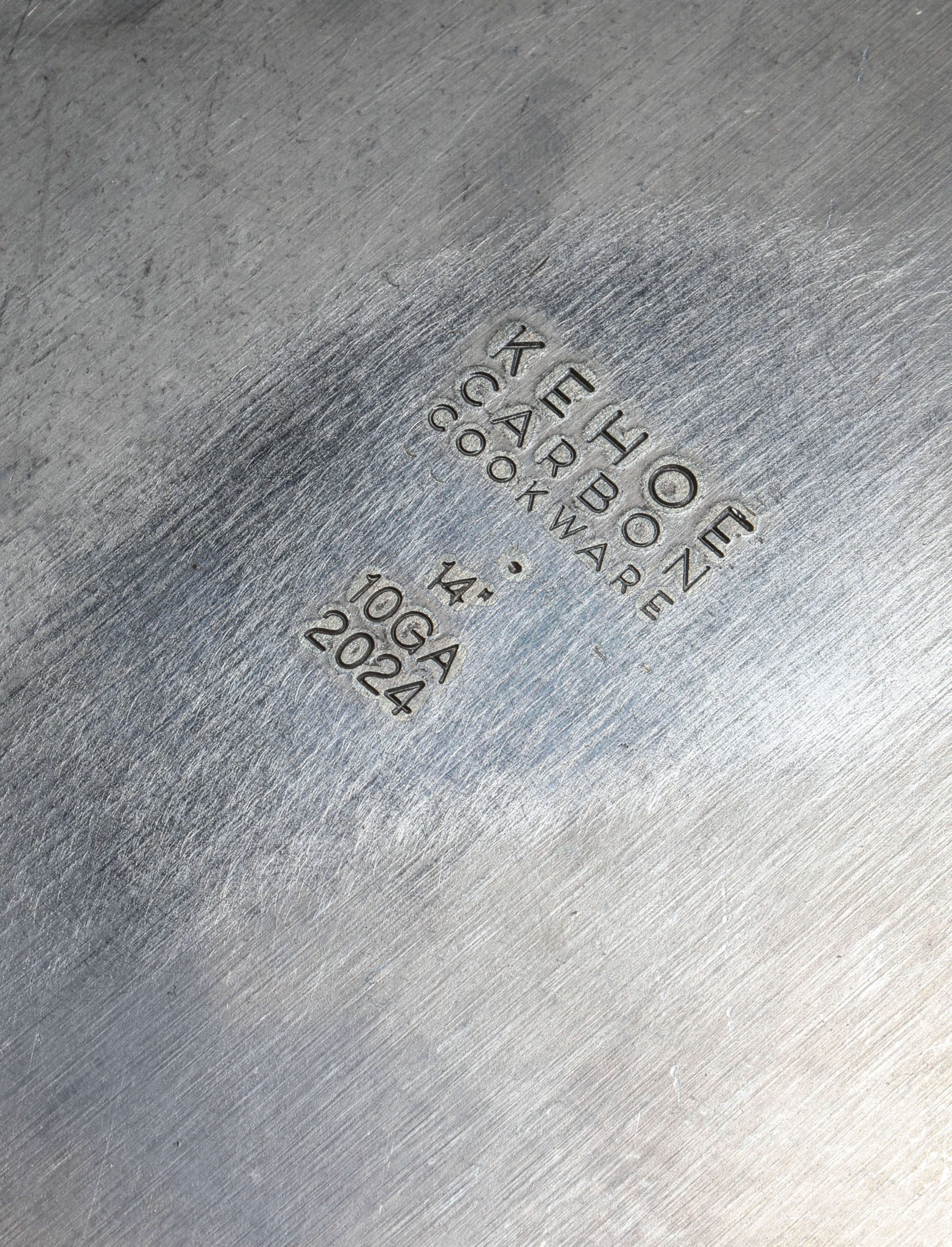 Handcrafted on California’s central coast by long-time artisan blacksmith Dennis Kehoe comes the new Frying Saucer carbon cookware collection. In 10″, 12″, and 14″ diameters, the Frying Saucer design is a cross between a skillet and a sauce pan, featuring tall, versatile, sloping side walls around a flat cooking surface forged from thick, heat-loving, 10-gauge / 0.125″ carbon steel. Pre-seasoned with coconut oil and ready to cook with, the 10″ and 12″ models (6″ & 8″ flat cooking surfaces respectively) offer classic, comfortable long handles, with the larger 14″ (10″ cooking surface) model including a hand-forged loop ‘helper’ handle opposite the long handle. Use the Frying Saucer on gas, electric, glass, and induction stove tops, in the oven, over the open flame, and anywhere food is prepared and enjoyed.