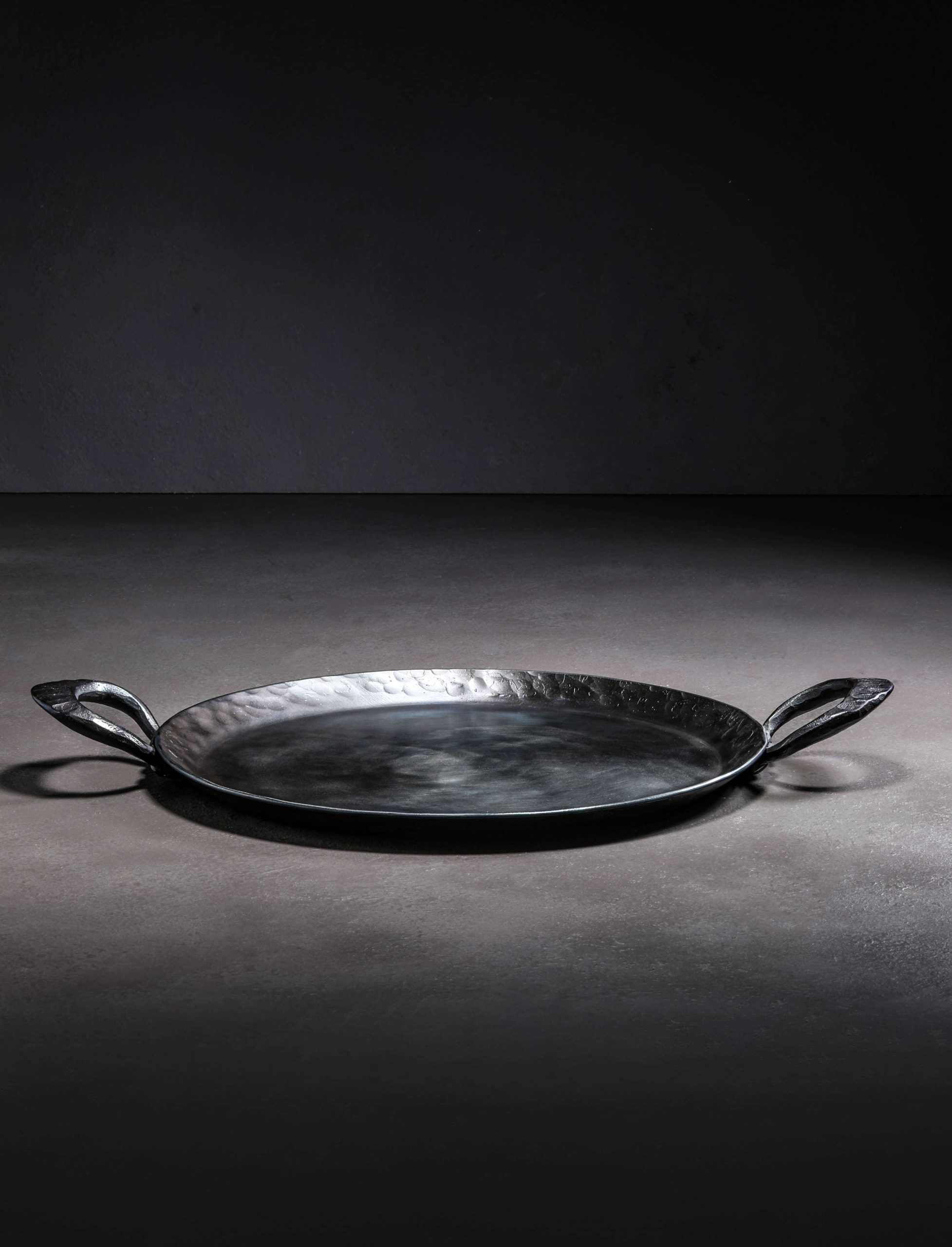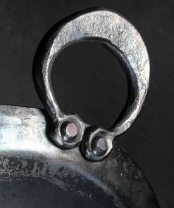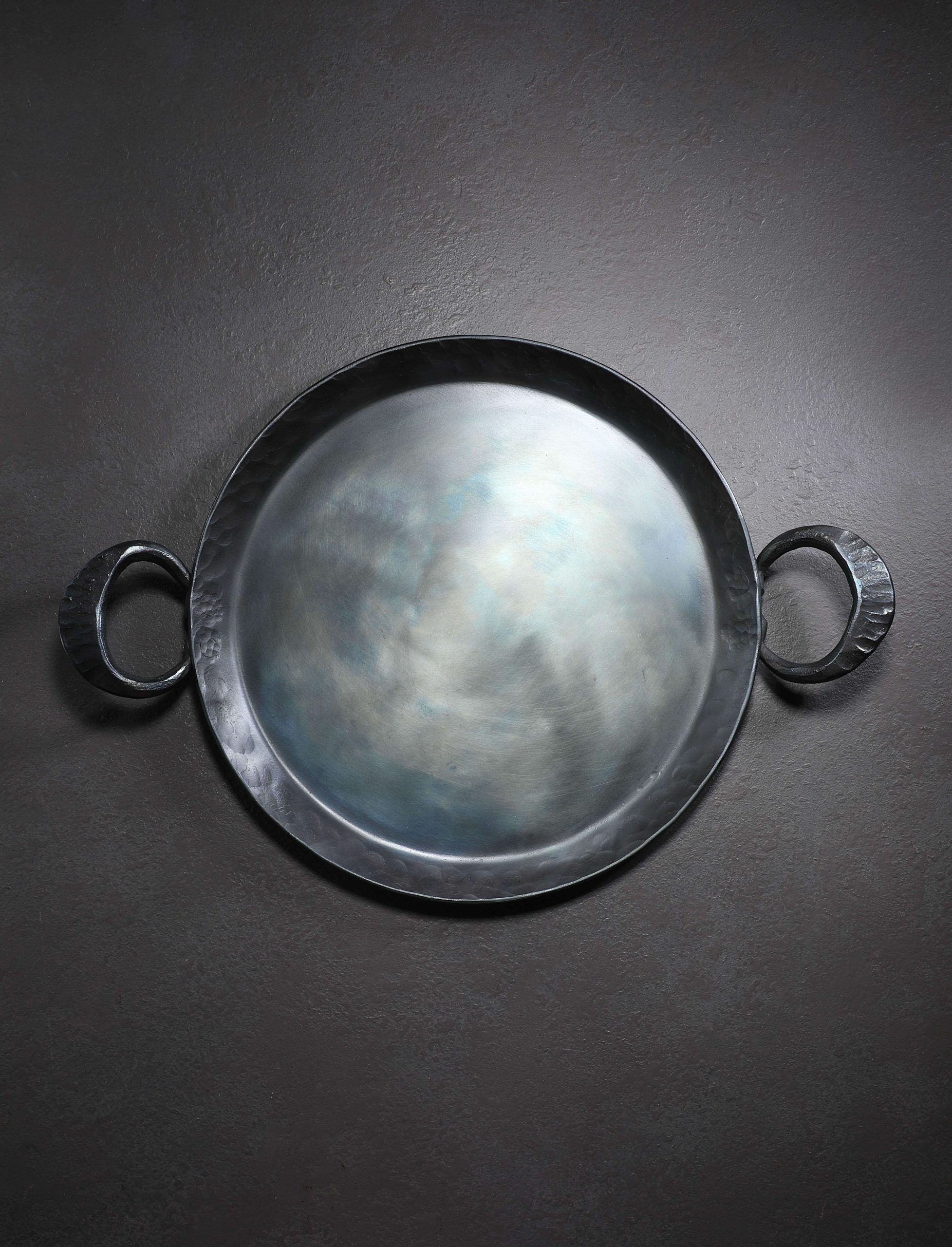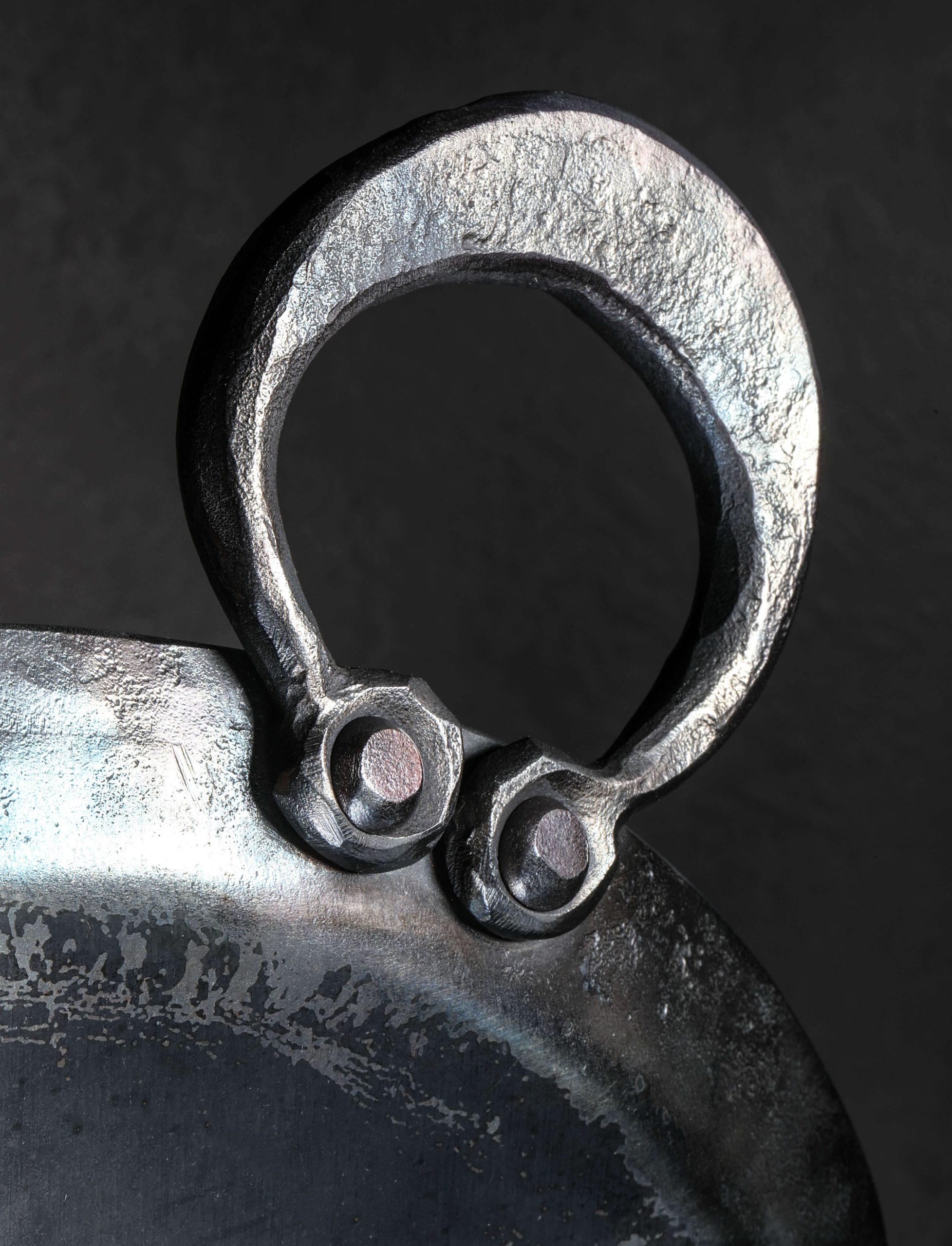 Sibling to Dennis Kehoe’s Long Handle Crepe Pan, this versatile build features two, forged loop handles for a smaller overall footprint that makes it ideal for cooking in tight spaces, for using in the oven, and atop the grill. With its large, thick, 10-gauge carbon steel cooking surface measuring a full 10″ across, this talented artisan-blacksmith’s new Crepe Pan is a beautiful, versatile, heirloom cooking tool. Handmade at his Los Osos, California studio, each pan is forged by hand and comes pre-seasoned with coconut oil. Especially thick at 0.125″, the 10-gauge material distributes and retains heat beautifully for a premium cooking experience. Carbon steel performs with all heat sources, from gas, electric, induction, and glass cooktops, to inside the oven, and over the open flame. Crepes (or pancakes or smash burgers or bacon or…….) never looked this good.