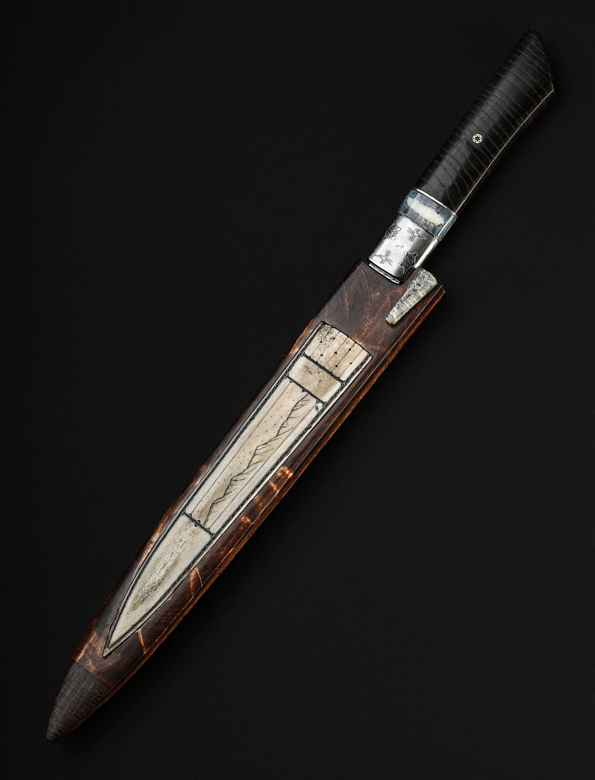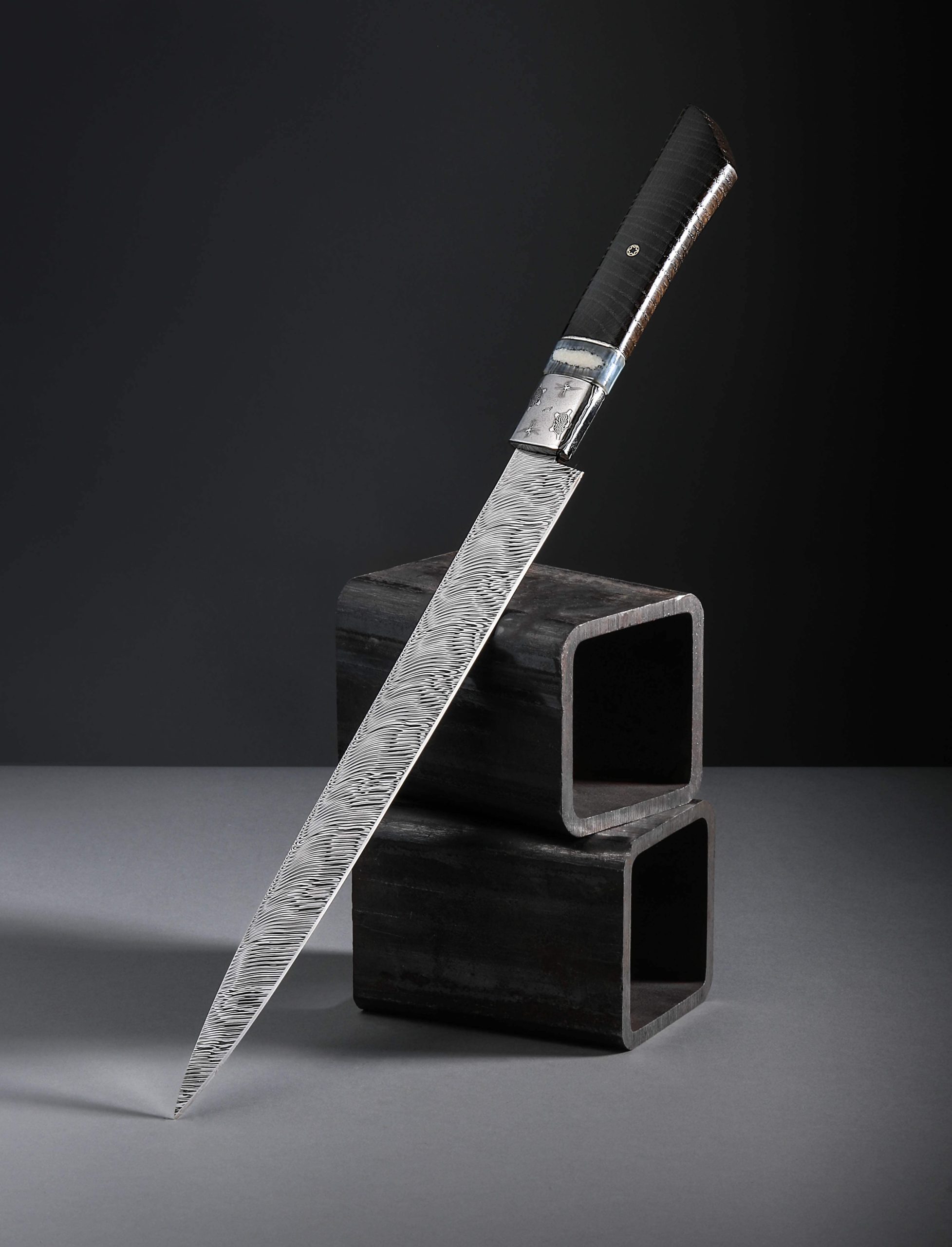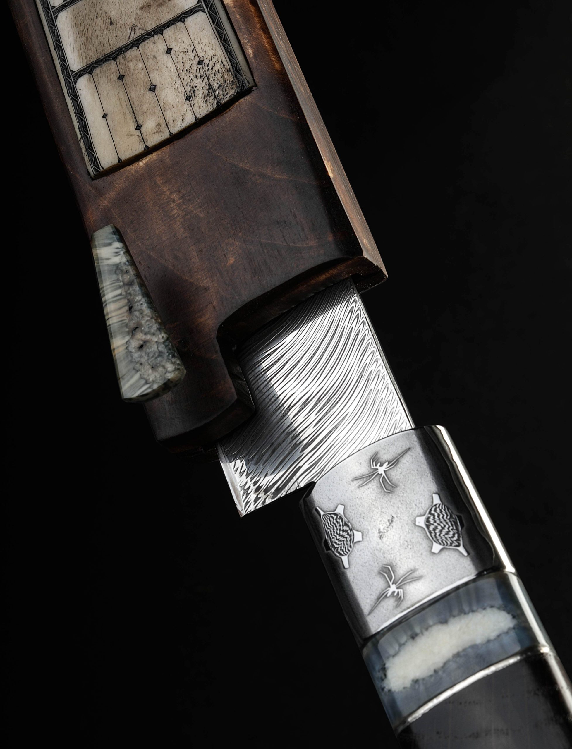 Swedish artist Tobbe Lundström‘s contribution to The Art of Cutlery, a slicing knife named “Klyfta,” on show during summer 2024 in Tribeca, NYC, pairs Tobbe’s iconic Scandinavian style chef’s slicing knife crafted in locally sourced materials with a one-of-a-kind, presentation-grade saya. The knife features a blade shaped from Swedish-made stainless damascus steel and a handle whose ingredients include a mosaic damascus bolster by Sweden’s Mattias Styrefors, fossilized walrus tooth, and ancient bog oak. Constructed of the same bog oak, the saya is embellished with an intricately engraved piece of reindeer antler by Swedish artist Patrik Nilsson, and completed with a pin of fossilized walrus tooth. Sharp and ready to use, this work is designed for carving and serving in the dining room.