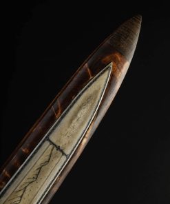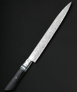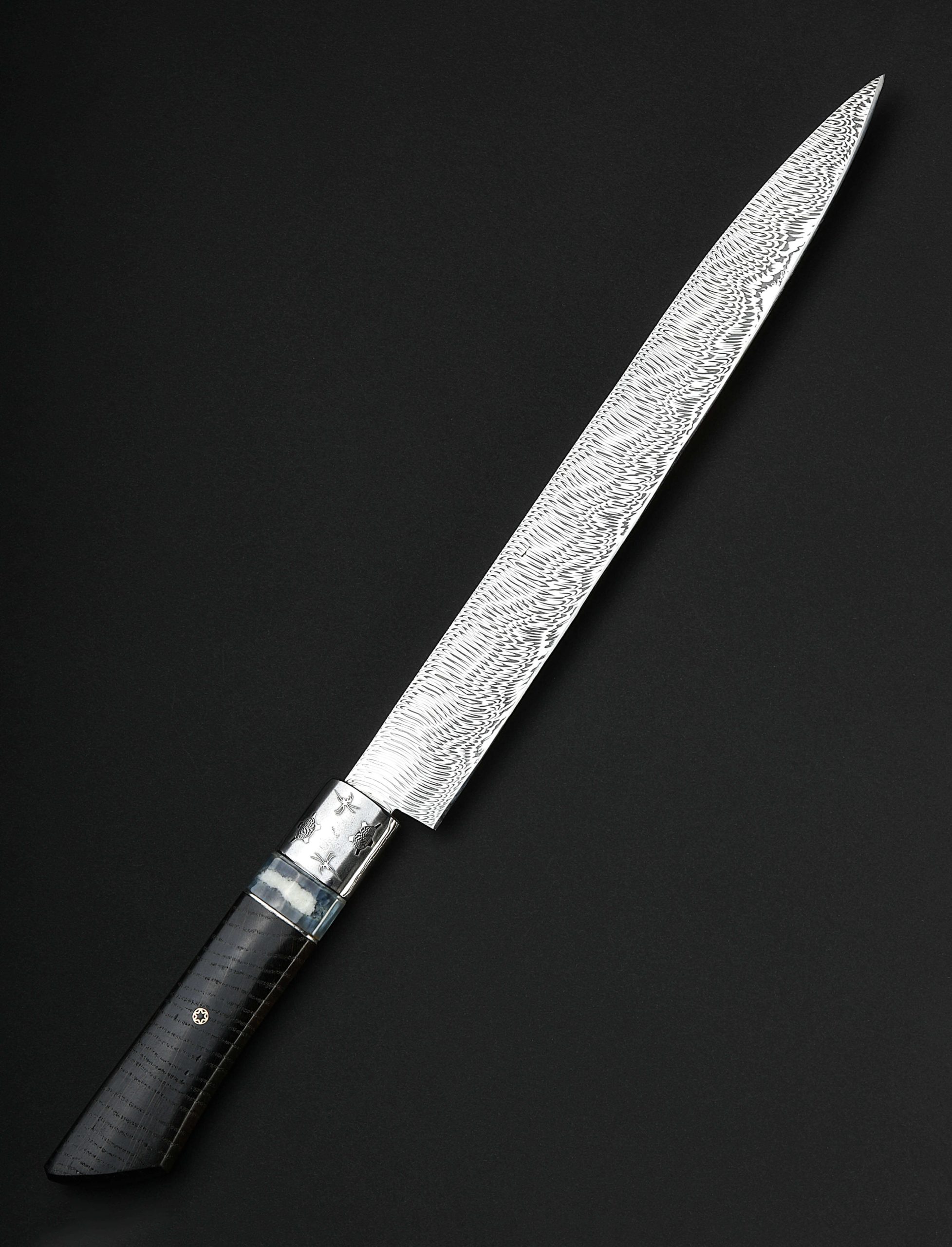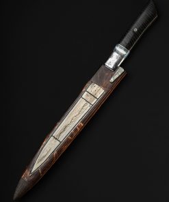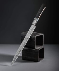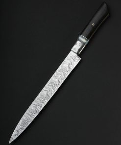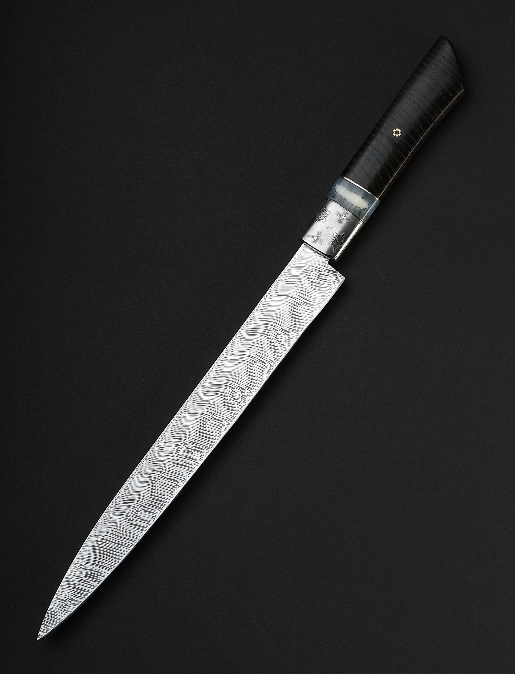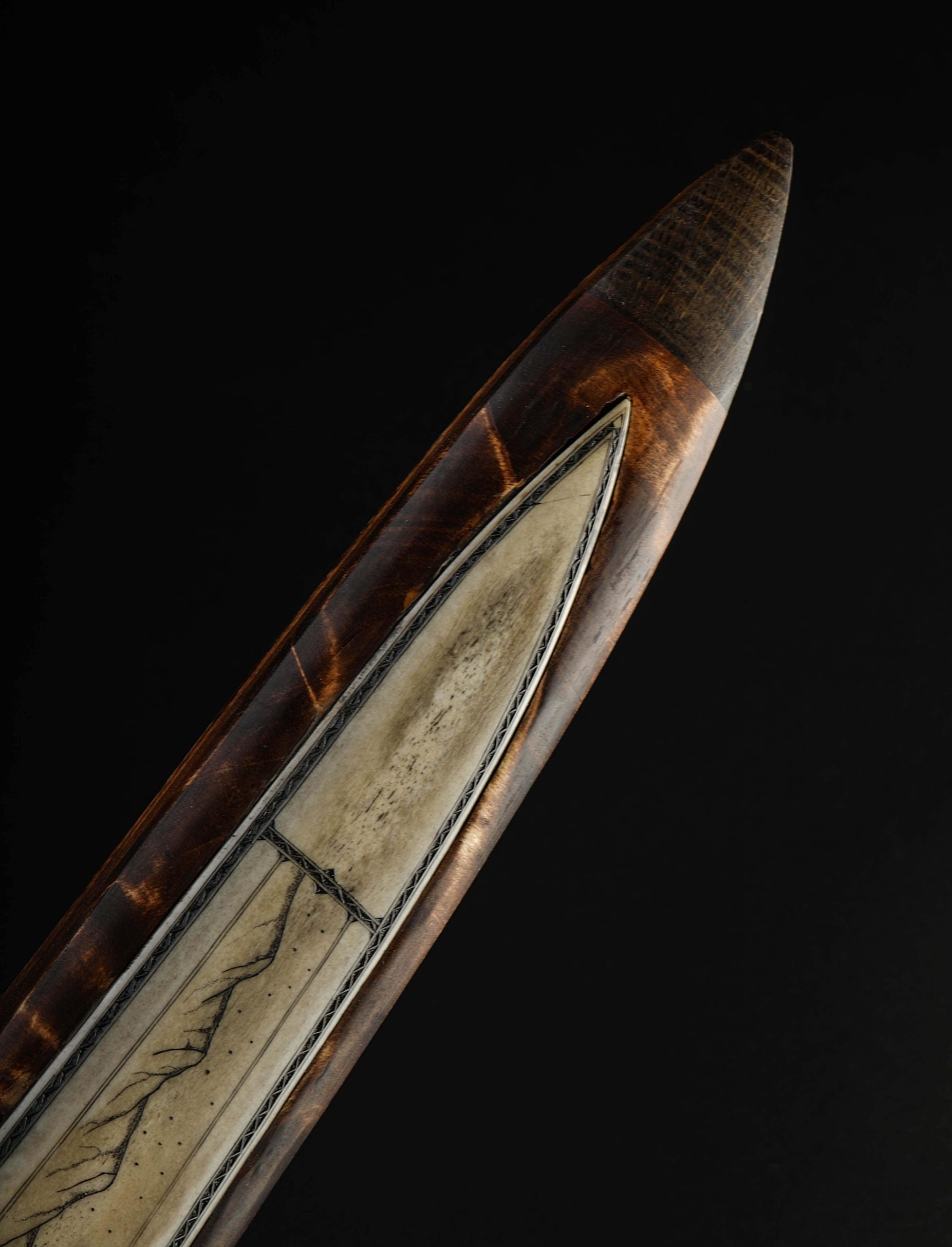 Swedish artist Tobbe Lundström‘s contribution to The Art of Cutlery, a slicing knife named “Klyfta,” on show during summer 2024 in Tribeca, NYC, pairs Tobbe’s iconic Scandinavian style chef’s slicing knife crafted in locally sourced materials with a one-of-a-kind, presentation-grade saya. The knife features a blade shaped from Swedish-made stainless damascus steel and a handle whose ingredients include a mosaic damascus bolster by Sweden’s Mattias Styrefors, fossilized walrus tooth, and ancient bog oak. Constructed of the same bog oak, the saya is embellished with an intricately engraved piece of reindeer antler by Swedish artist Patrik Nilsson, and completed with a pin of fossilized walrus tooth. Sharp and ready to use, this work is designed for carving and serving in the dining room.