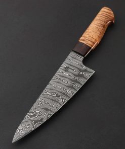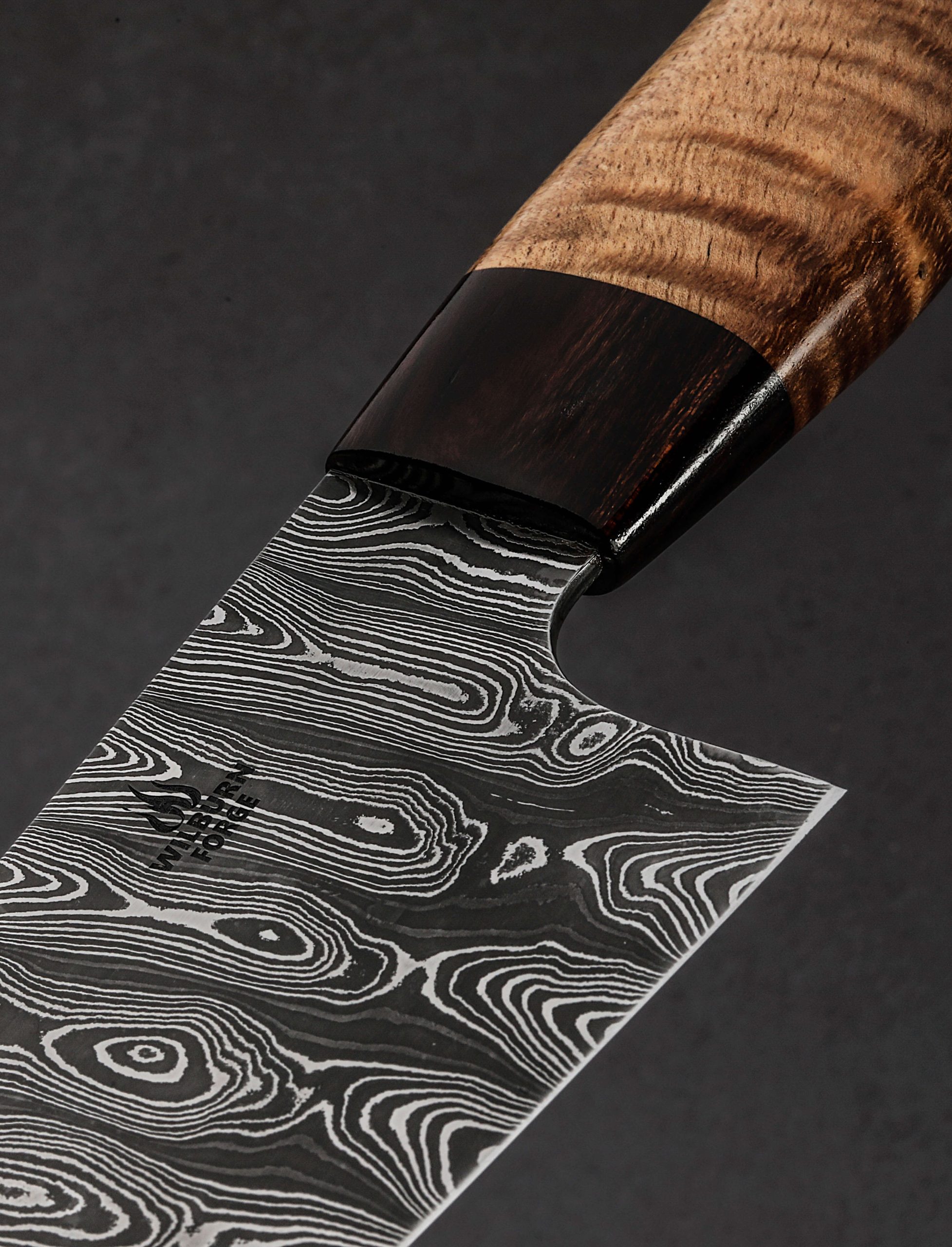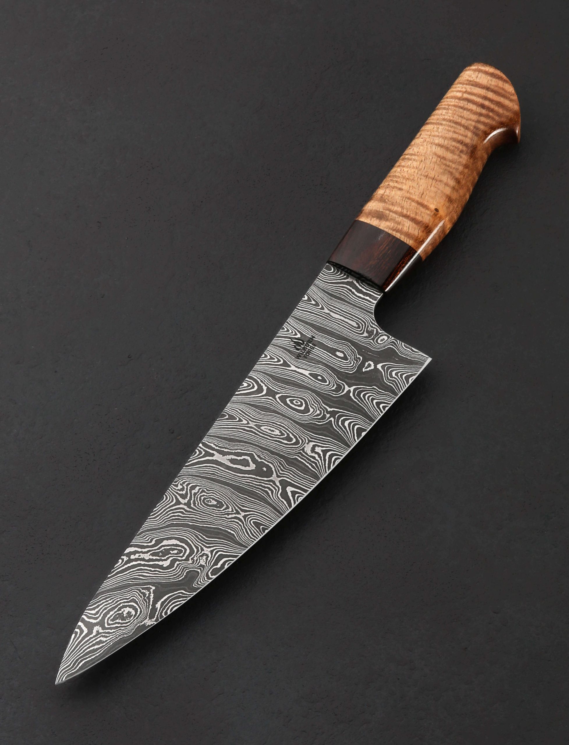 Master Bladesmith Aaron Wilburn’s first piece to grace our collection in some time is an absolute beauty: simple, elegant, and packed full of utility for the chef’s kitchen. At 208mm / 8.2″ long, the blade’s edge sweeps upward from a versatile, 61mm tall heel to a high, strong, and pointed tip, providing ample curvature for rocking on the board and tackling the largest of cuts. Thin, hard, and razor-sharp at the edge, Aaron has shaped this one-of-a-kind chef knife from a house-made carbon damascus steel in a twist pattern forged by hand from 1084 and 15n20 alloys. Designed and built at his Idaho studio to be the workhorse of any kitchen, Aaron balances finesse and precision with a ready-to-work feel capable of all manner of daily meal prep. Filling the hand with a tall, beautifully sculpted profile, the Western-style hidden tang handle is carved from Hawaiian Koa wood with a tapering ferrule of Arizona Dessert Ironwood.