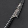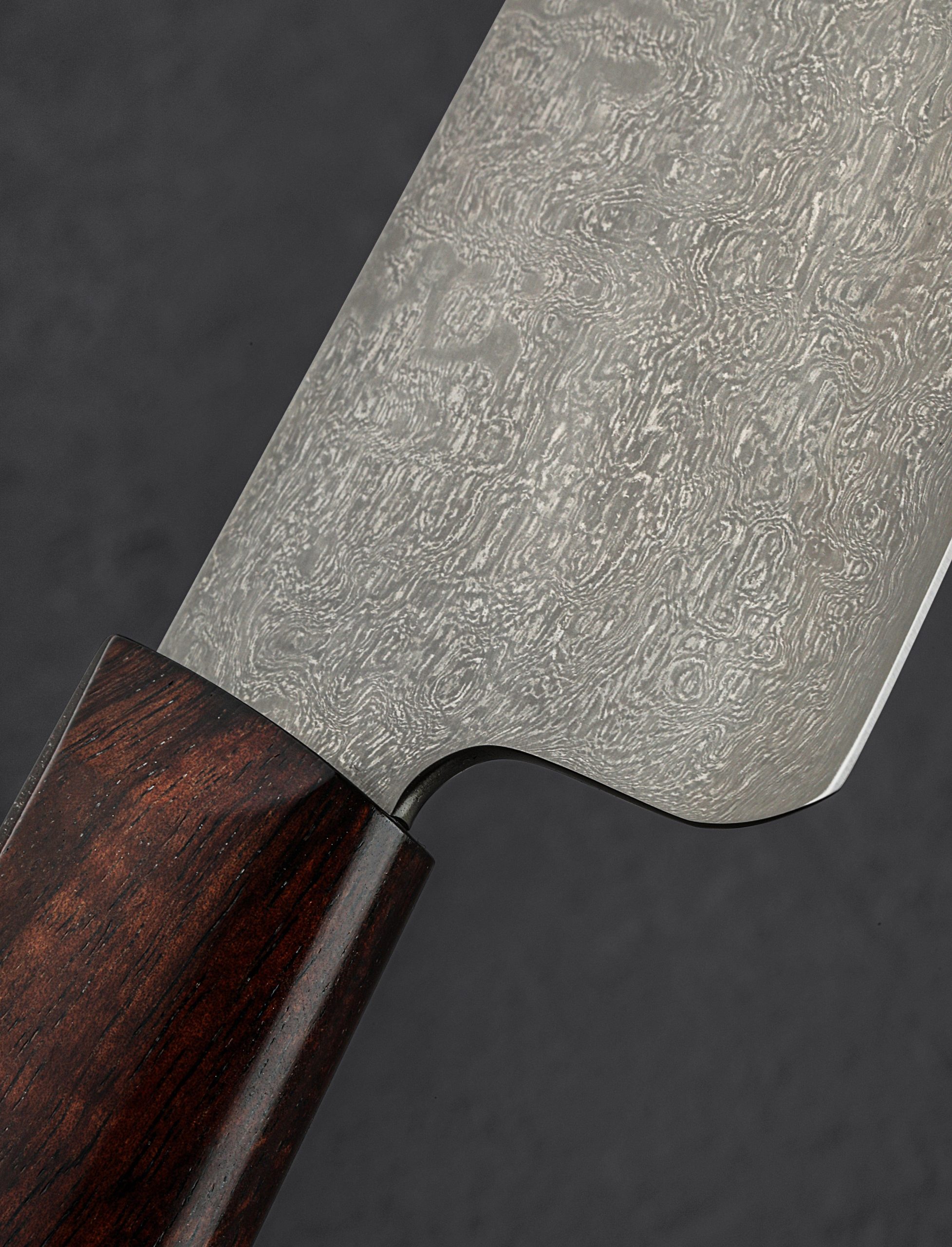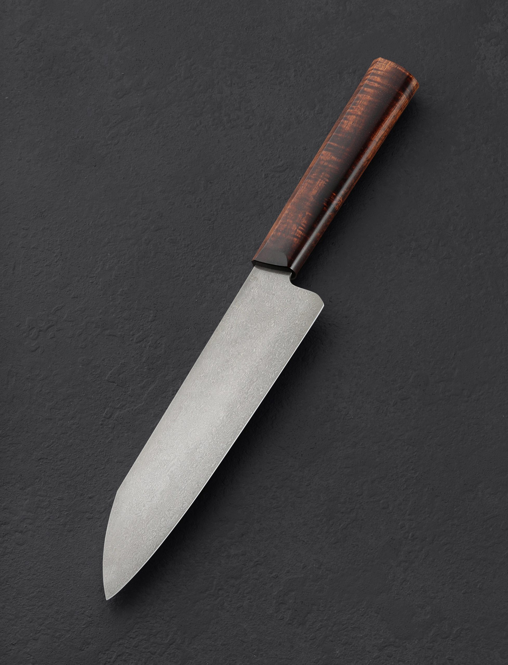 In gyuto form with beautiful, 205mm / 8.1″ blade forged by hand to become your daily kitchen workhorse for all manner of meal prep, this tool by Peter Swarz-Burt is built to do it all. Crafted from Peter’s renowned, house-made wootz carbon steel which shows a striking, damascus-like pattern in its finished, etched form, the blade is stiff along its wide, slightly tapered spine, and tough behind its sharp, hard edge where convex bevels are up to the most demanding cuts. A slim, pointed tip balances precision and strength, giving the long, relatively straight profile the versatility to slice with finesse in the front and chop unwaveringly throughout its length. A long, comfortable shield-style wa handle is carved from exquisite, locally sourced Hawaiian Koa, tapering slightly at the front for work in the pinch grip, and showing off its black micarta retention bold cap in the rear. Balanced, sturdy, and full feeling in the hand, this is one rewarding tool to hold, and behold.