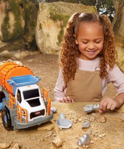 The Metal Detector Mining Truck transforms into four real working tools: metal detector, rock tumbler, water tank, and shovels.