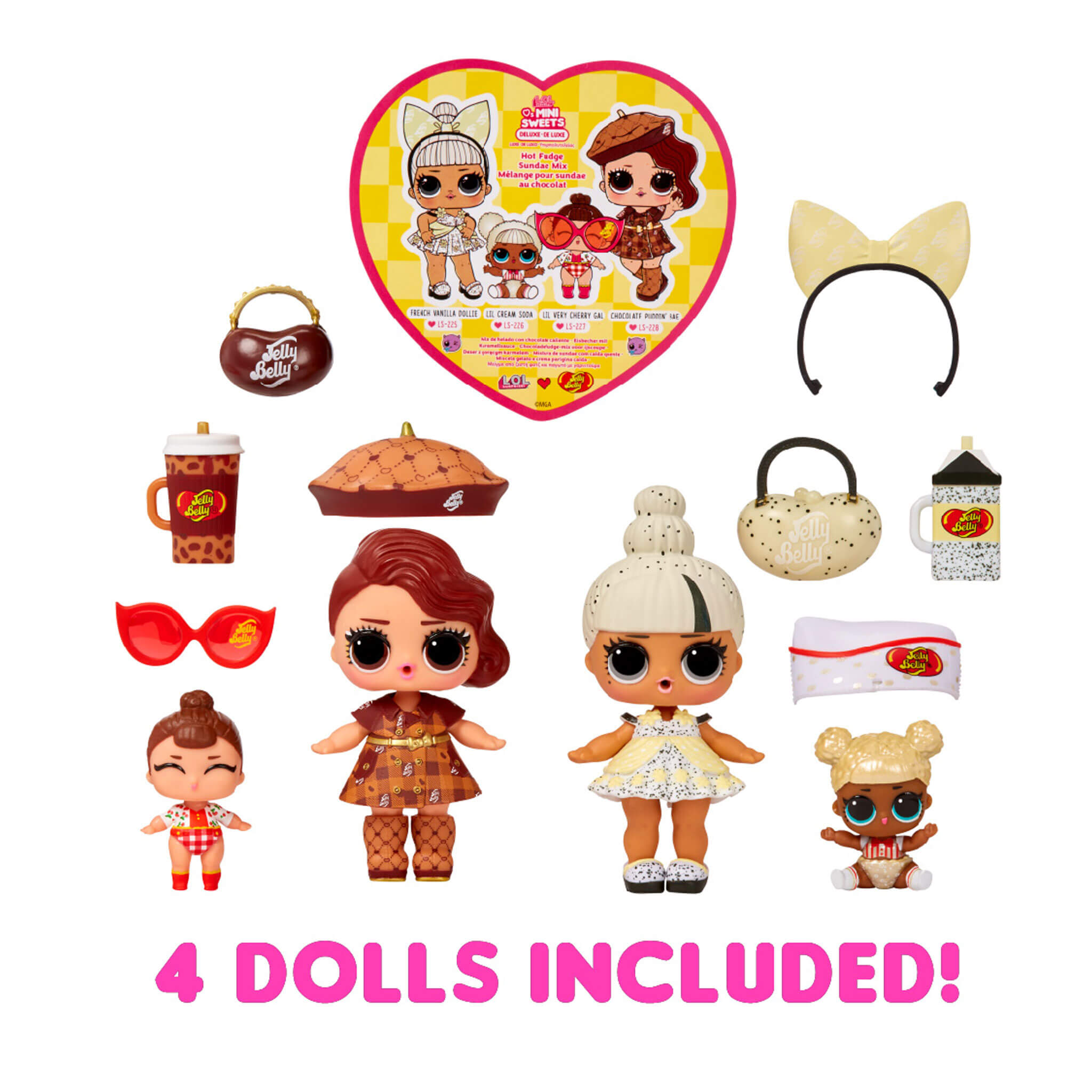 Each Deluxe pack includes 4 limited-edition dolls to match 4 Jelly Belly flavors: French Vanilla, Chocolate Pudding, Cream Soda, and Very Cherry to make the fiercest hot fudge sundae ever! Feed French Vanilla or Chocolate Pudding for a water surprise! Will they spit, cry or tinkle?