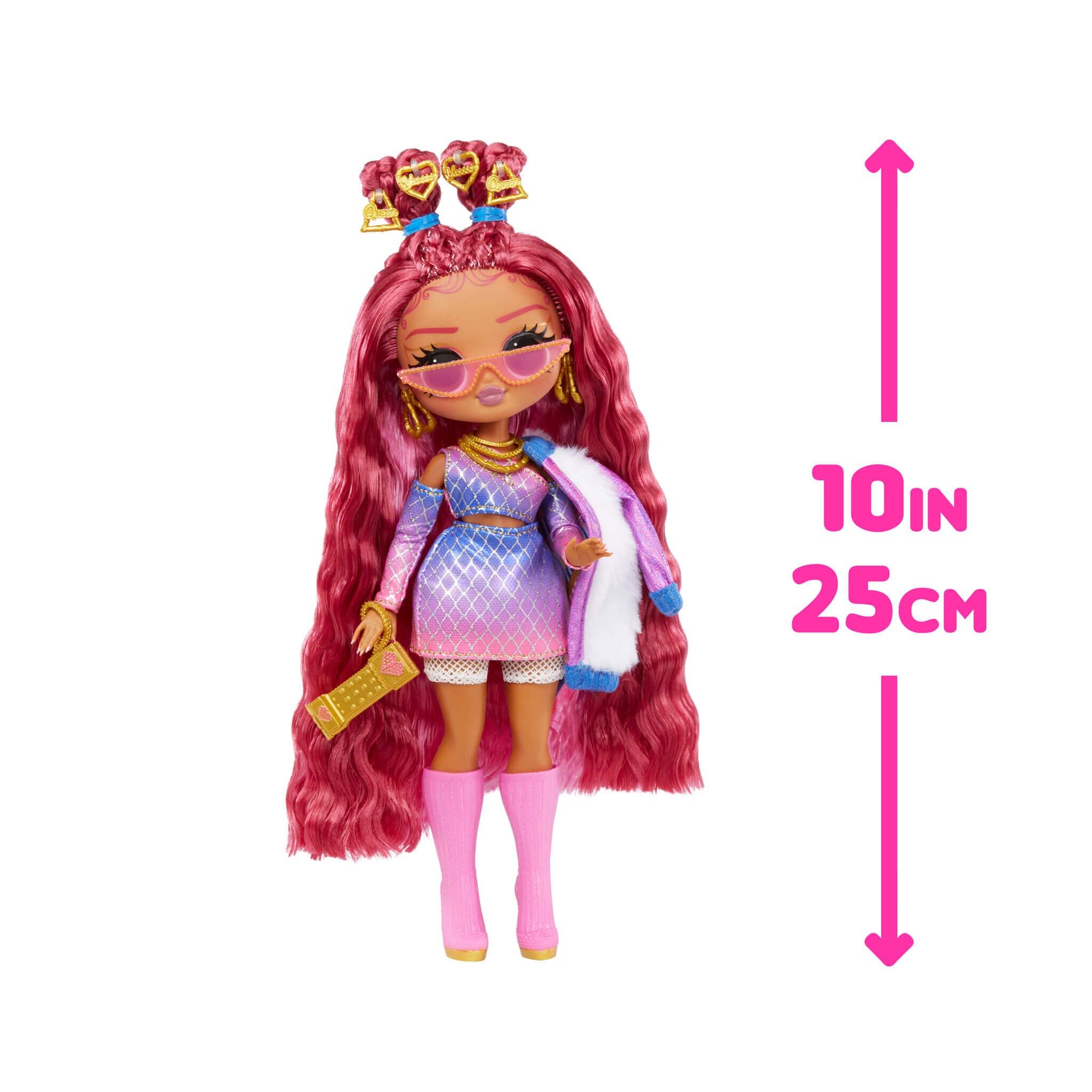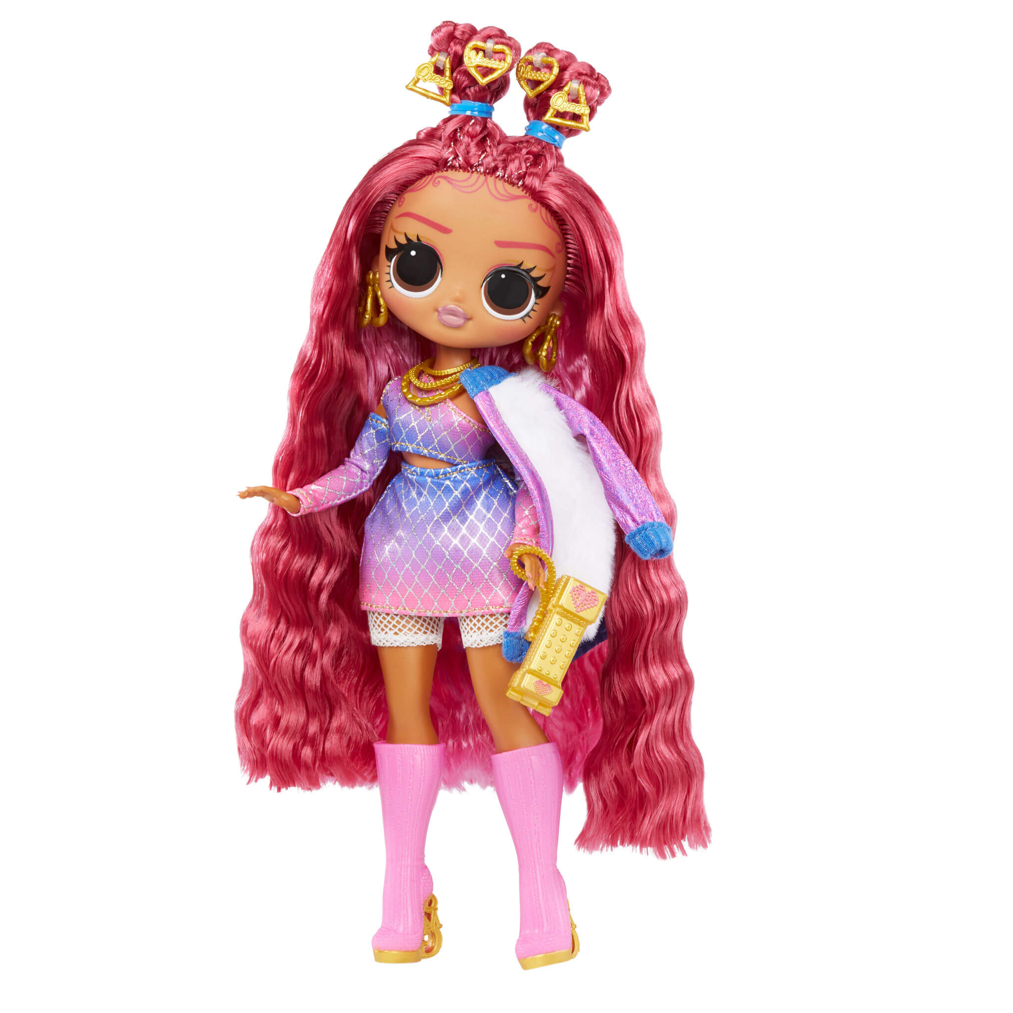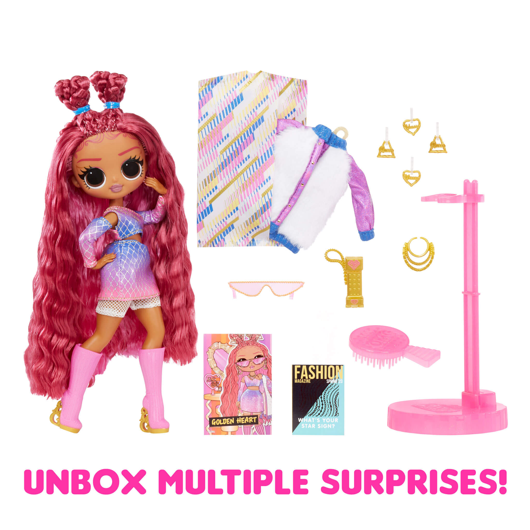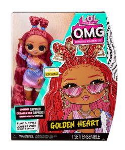 Introducing the diva, all-new LOL Surprise OMG fashion doll Golden Heart with multiple surprises! As an accessory designer, Golden Heart enjoys spending her time conceptualizing and creating DIY accessories to complement her stylish fashions. She has stunning features, beautiful hair, her own fabulous designer outfit, and comes articulated for tons of posing opportunities.