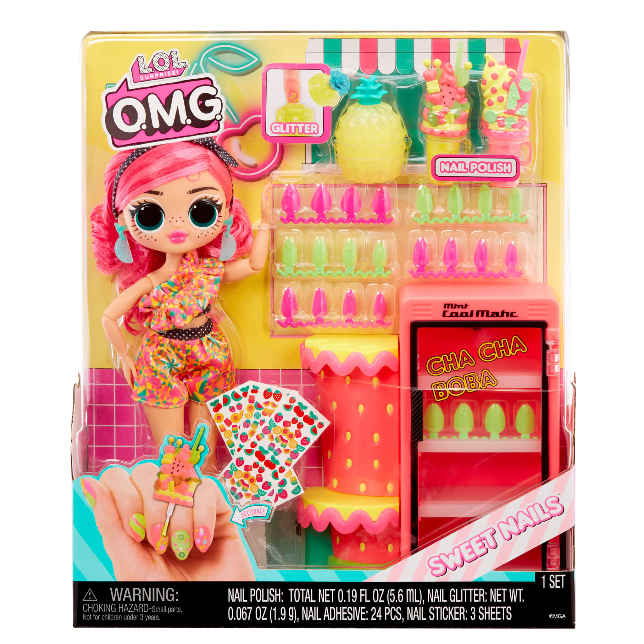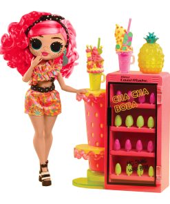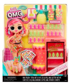 Discover the sweetest surprises with LOL Surprise OMG Sweet Nails – Pinky Pops Fruit including a drink mini fridge with shop counter, unique nail accessories, and vibrant, brand new character Pinky Pops, with colorful, fruit inspired fashions and bright pink gorgeous curly hair!